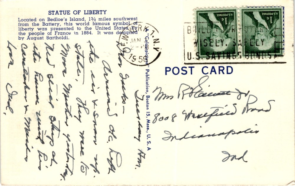 MAKE AN OFFER. THE MORE YOU BUY THE BETTER DEAL I WILL ACCEPT The postcard features a picture of the Statue of Liberty in New York Harbor, New York City. The Statue of Liberty is located on Bedloe's Island, which is 1/4 miles southwest from the Battery in New York. It was a gift from the people of France to the United States in 1884 and was designed by Auguste Bartholdi.