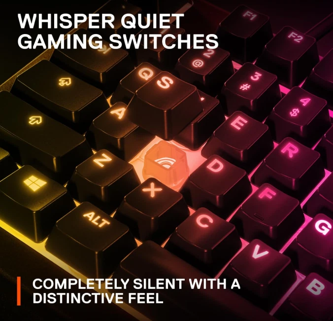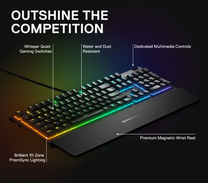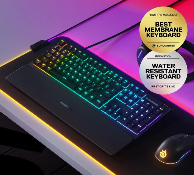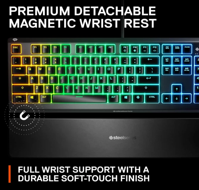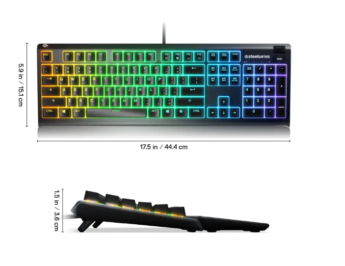 The keyboard itself is in perfect condition and functions flawlessly. This is the Apex 3 Full Size Wired Membrane Whisper Quiet Switch Gaming Keyboard with 10-Zone RGB Backlighting It’s a full-sized, wired membrane keyboard that features water resistance, whisper-quiet switches, and vibrant RGB lighting for an enhanced experience. While it’s great for gaming, it’s also perfect for everyday use. It comes with a wrist pad that magnetically attaches to the keyboard for added comfort. The keyboard is compatible with PC, Mac, Xbox, and PS5, and it uses software called SteelSeries GG for customization and optimization the keyboard is like new and works perfectly.