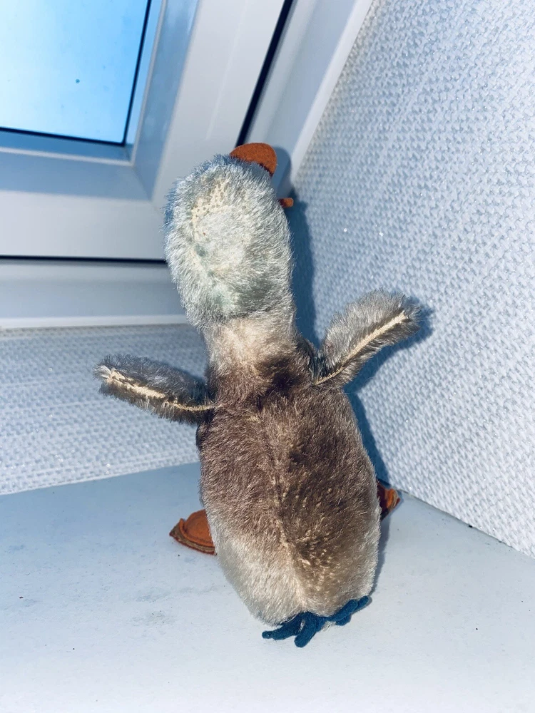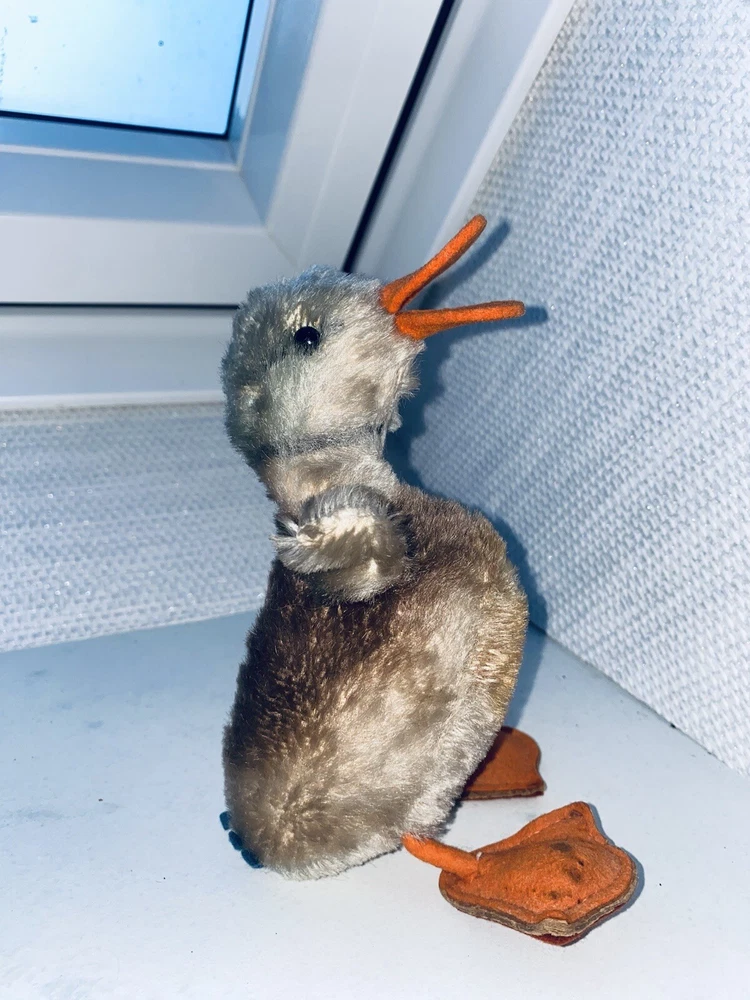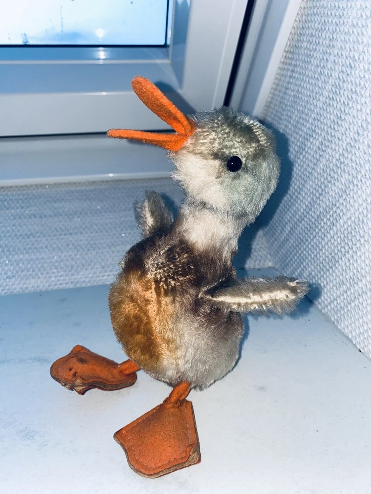 This is a vintage Steiff stuffed animal from the 1960s. It is a small, standing duck made of colorful mohair plush and measures 18cm (7in) in size. The duck was made in Germany and is part of the Steiff brand. It is a collectible item and is featured in the "Toys & Hobbies" and "Stuffed Animals" categories.