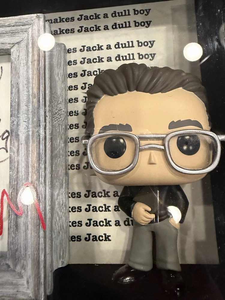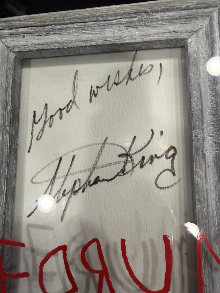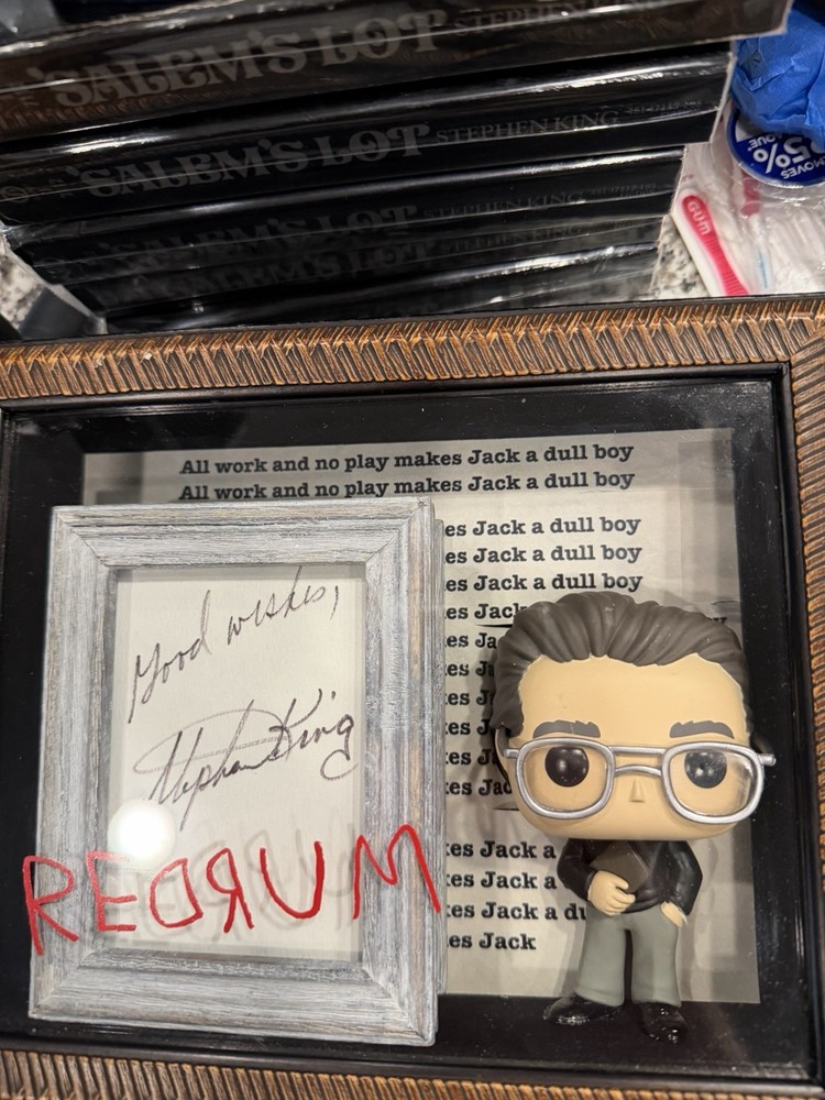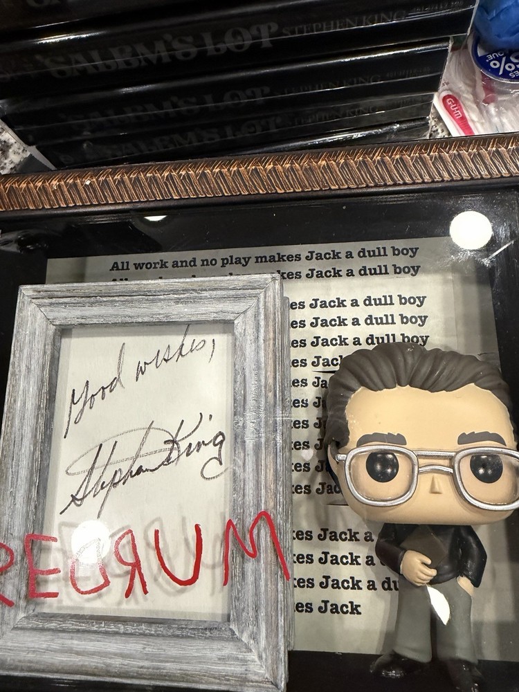This product is a framed display featuring a Stephen King signed 3 X 5 card with a SK Funko Pop! The autograph has been authenticated by Heroes & Legends, and the framed card is inside a 7 1/2” X 9” shadowbox containing a Stephen King Funko pop figure standing next to the framed signature, and in front of a backdrop of , “ all working no play makes Jack a dull boy. “  the certificate of authenticity has been secured to the back of the shadowbox. This collectible item would be a valuable addition to any fan's entertainment memorabilia collection, showcasing a piece of horror genre history with a personal touch from the renowned author himself.