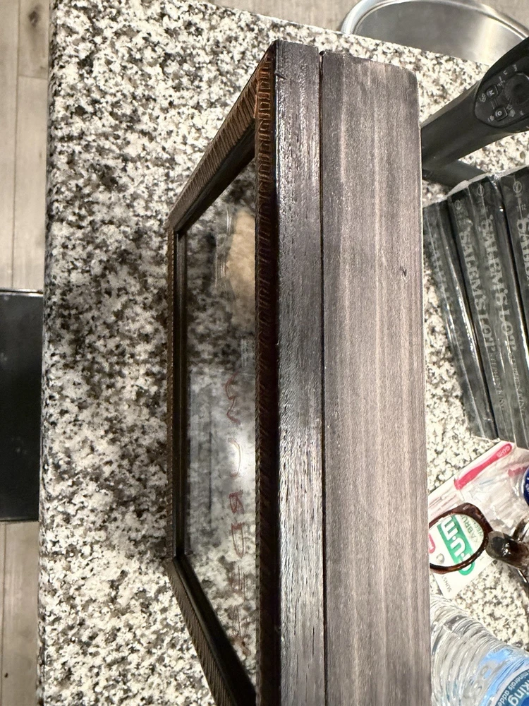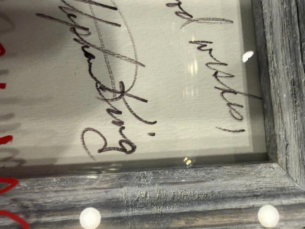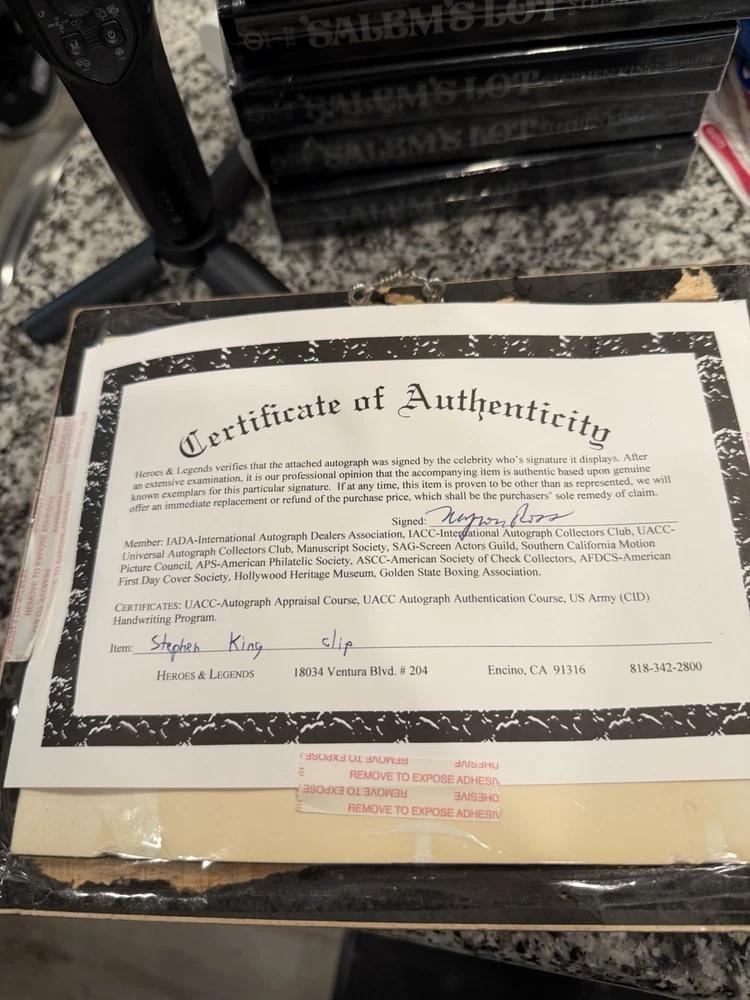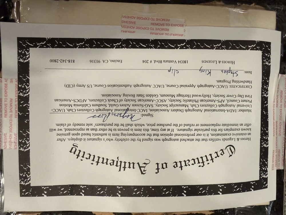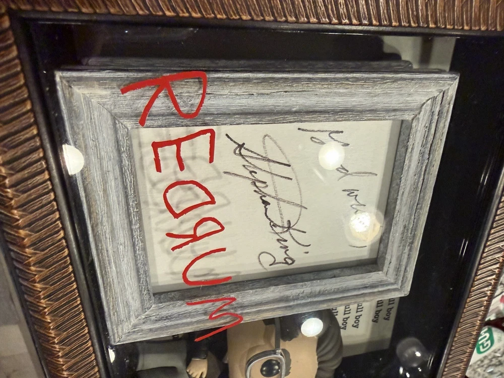 This product is a framed display featuring a Stephen King signed 3 X 5 card with a SK Funko Pop! The autograph has been authenticated by Heroes & Legends, and the framed card is inside a 7 1/2” X 9” shadowbox containing a Stephen King Funko pop figure standing next to the framed signature, and in front of a backdrop of , “ all working no play makes Jack a dull boy. “  the certificate of authenticity has been secured to the back of the shadowbox. This collectible item would be a valuable addition to any fan's entertainment memorabilia collection, showcasing a piece of horror genre history with a personal touch from the renowned author himself.