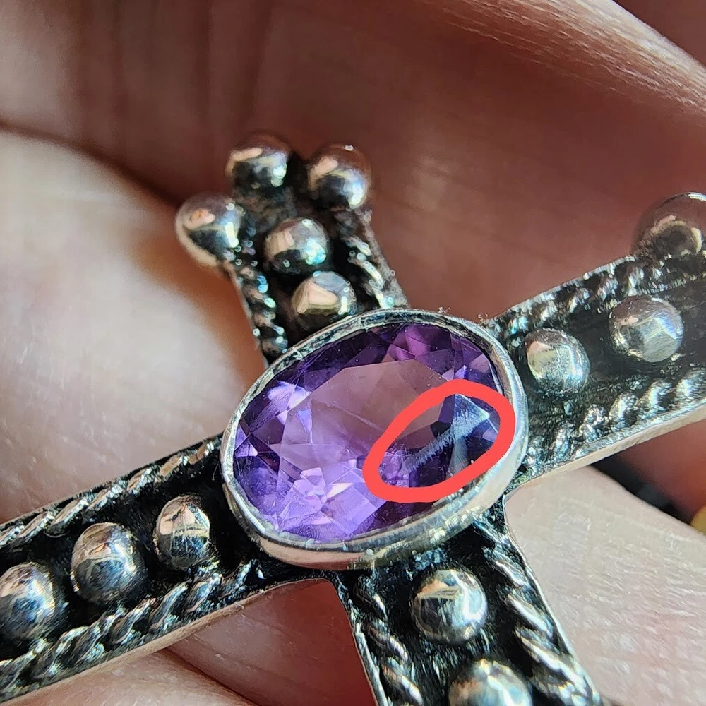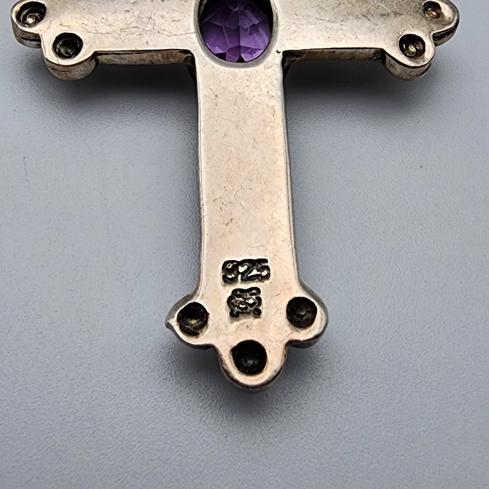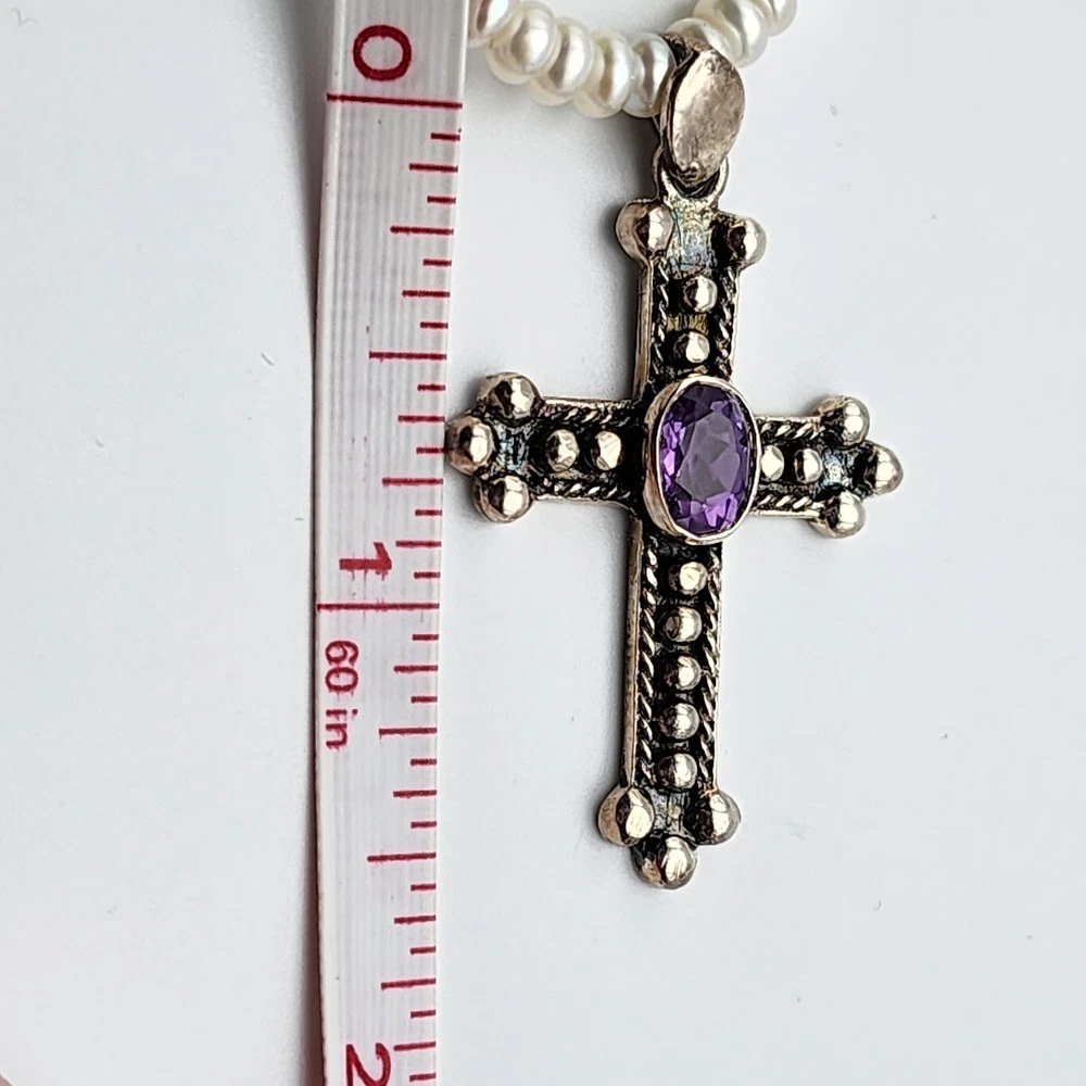 Sterling Cross Bezel Set Amethyst Pendant Button Pearl Crystal Necklace Handmade This Is A Signed Piece. I Cannot Identify the Maker. Beautiful Piece. Beads Are 4mm