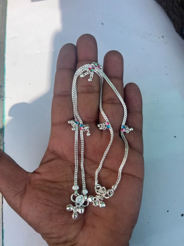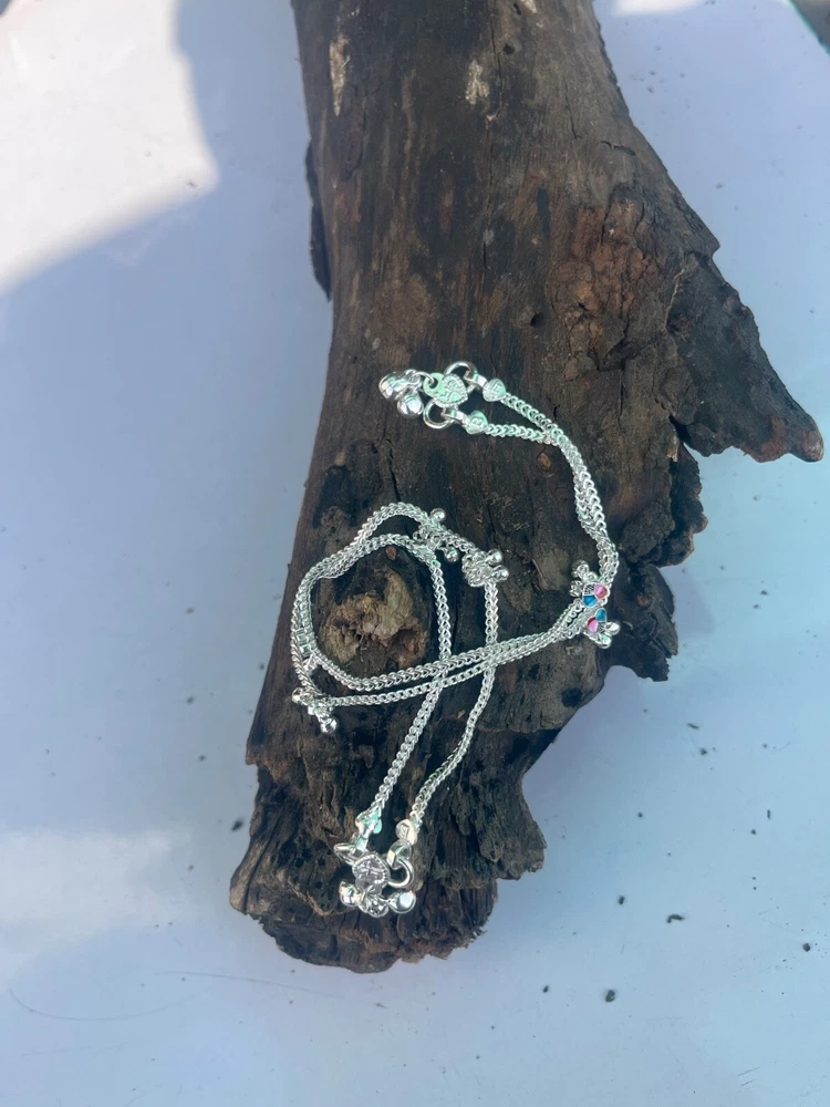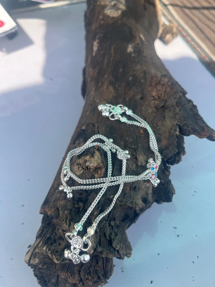 The product is a 10-inch sterling silver anklet from India, featuring jingle bells and enamel detailing. It is designed in a chain style with a charm and has a theme of motherhood, making it a perfect gift for occasions like Mother's Day, weddings, anniversaries, and birthdays. The anklet weighs 15g and has a metal purity of 900, showcasing intricate craftsmanship and unique design elements that symbolize love and appreciation for mothers.