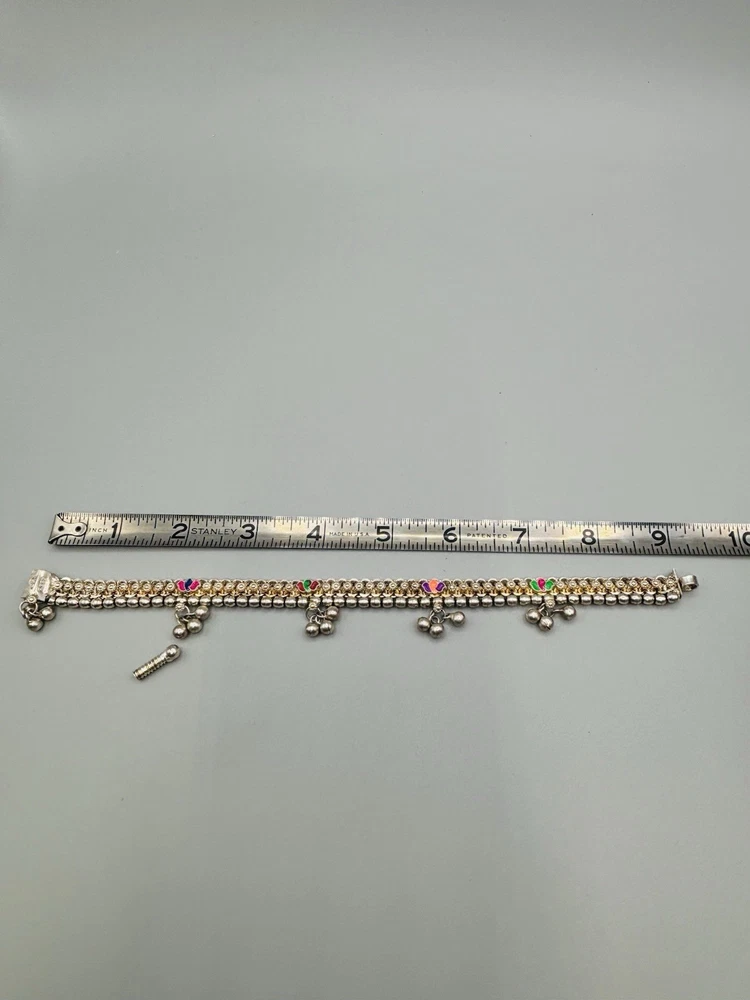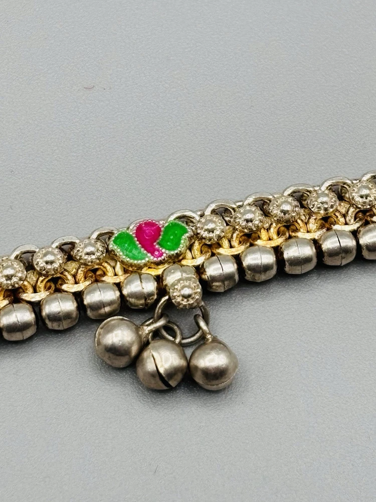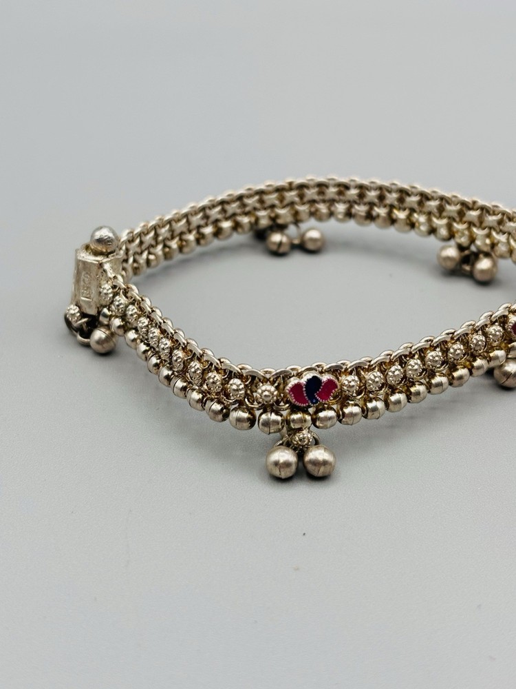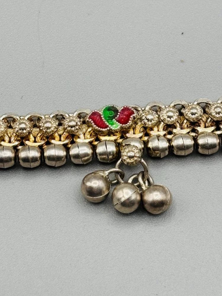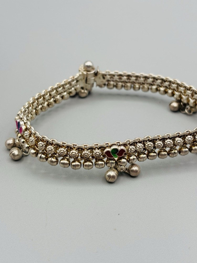 Vintage sterling silver Indian Payal motherhood anklet 5 drops with 3 “bells” on each 4 multicolor enamel stations Length: 9” Weight: 37.7 Signed: DR (in triangle cartouche) REGD (in rectangle cartouche) Purity mark: not found Tested: yes, minimum .925 pure Closure: Screw bolt, reverse thread Appears to have originally been gold plated over the silver, but the only remaining gold is down in the lower areas of the intricate chain links We also have a similar 10” anklet with the same markings available in a separate listing