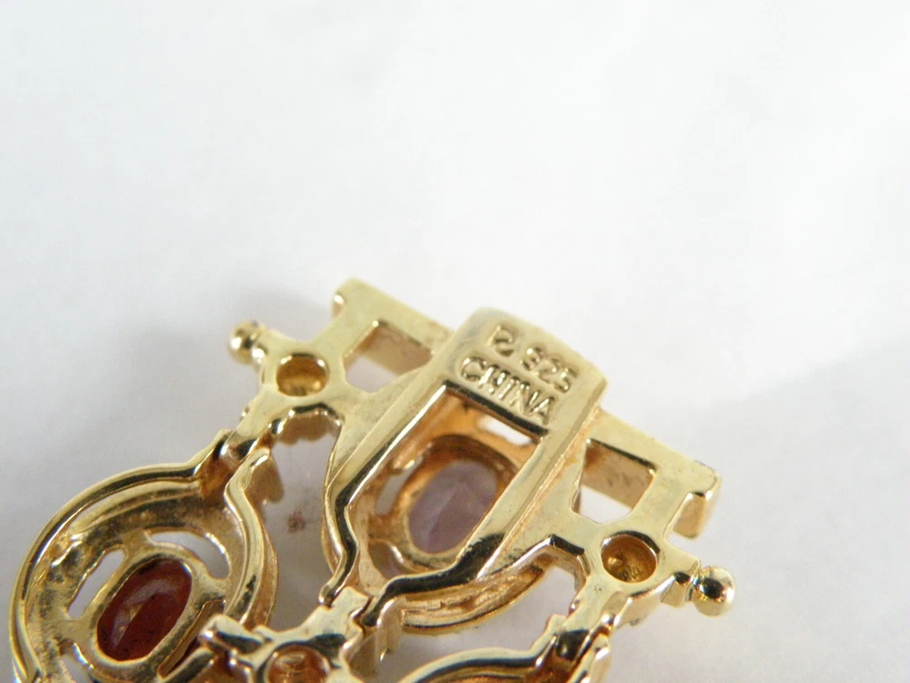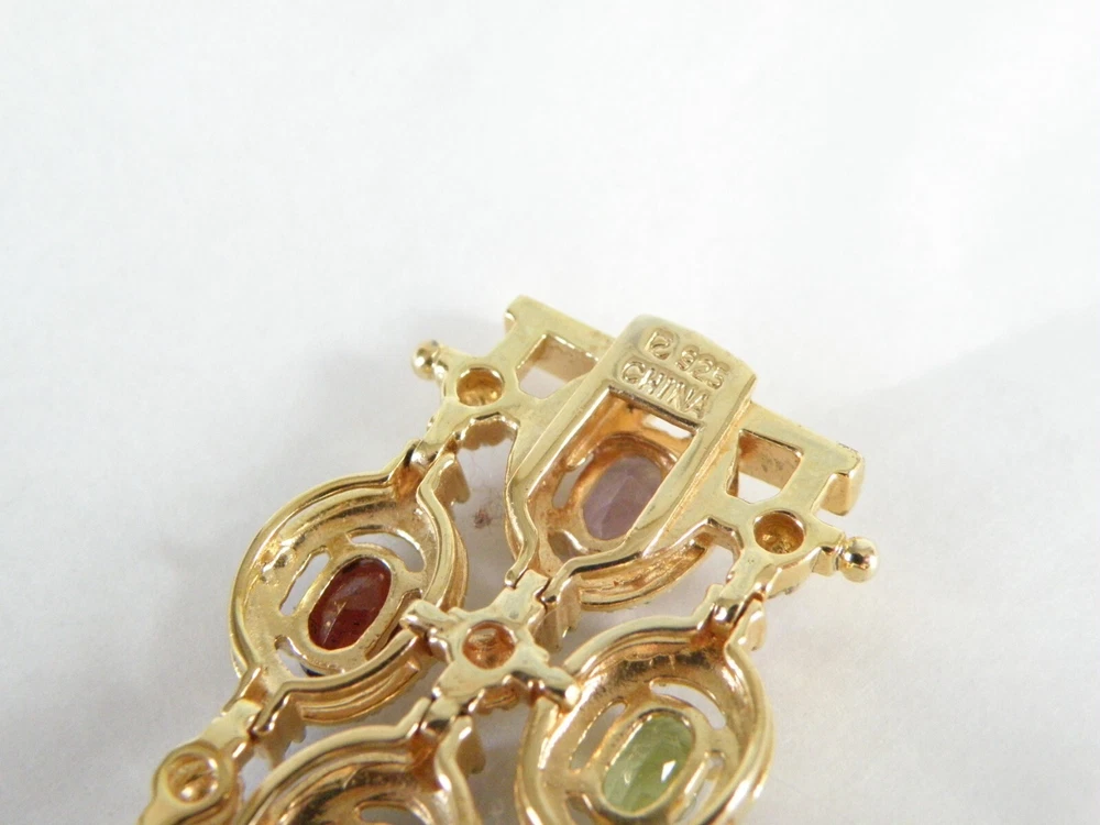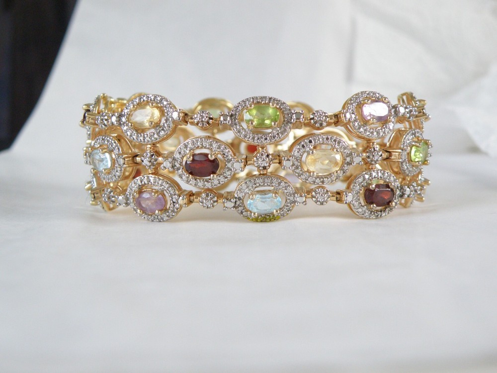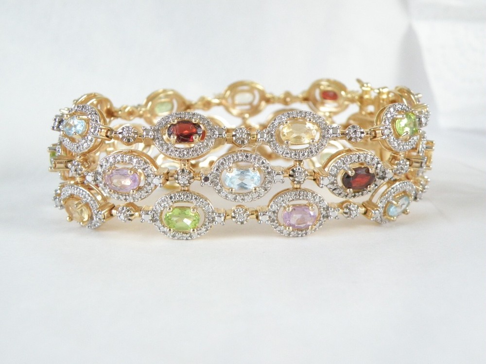 Liven up your jewelry wardrobe with this colorful alternative to a traditional tennis bracelet. Featuring a stunning signature piece with 3 rows of sparkling gemstones. A very well constructed tennis bracelet. A tight box clasp with a double safety guard. Composed of yellow gold over sterling silver. Weight 37.8 grams Measures approx. 7-1/2" long end to end. 7-1/4" with the clasp closed x .90" widest Stones measure approx. 6-mm-x 4-mm Marked 925 for sterling silver 'China R' for the maker's mark