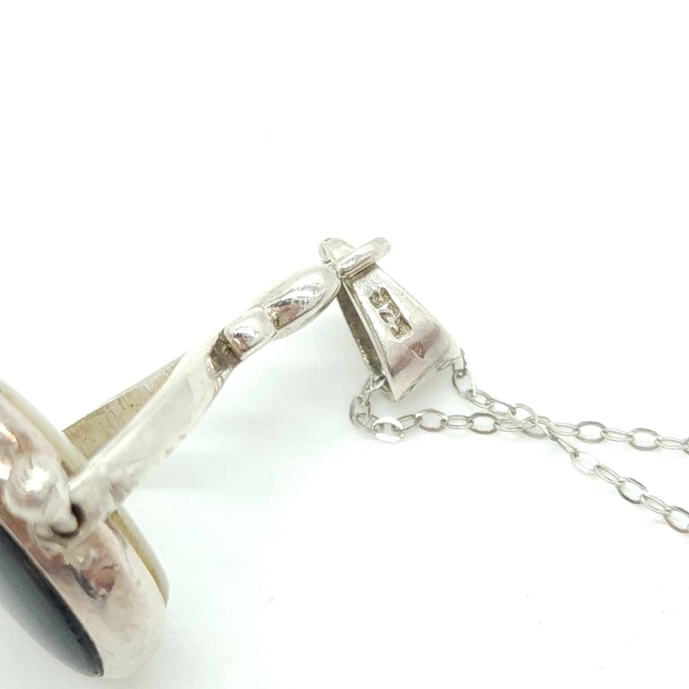 Sterling Silver Chain with Black Onyx & Mother of Pearl Reversible Pendant Size: 18" Long X 1.0mm Wide Pendant: 1.42" Tall (with bail) X 0.81" Wide X 0.25" Thick Stones: 0.57" Tall X 0.42" Wide 3.77dwt 5.87g 0.21oz ** Stamped & Tested A. EE / U. EE