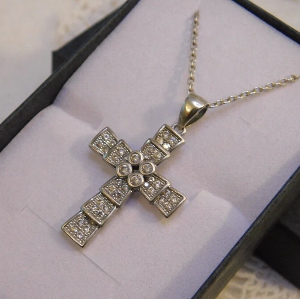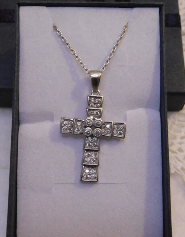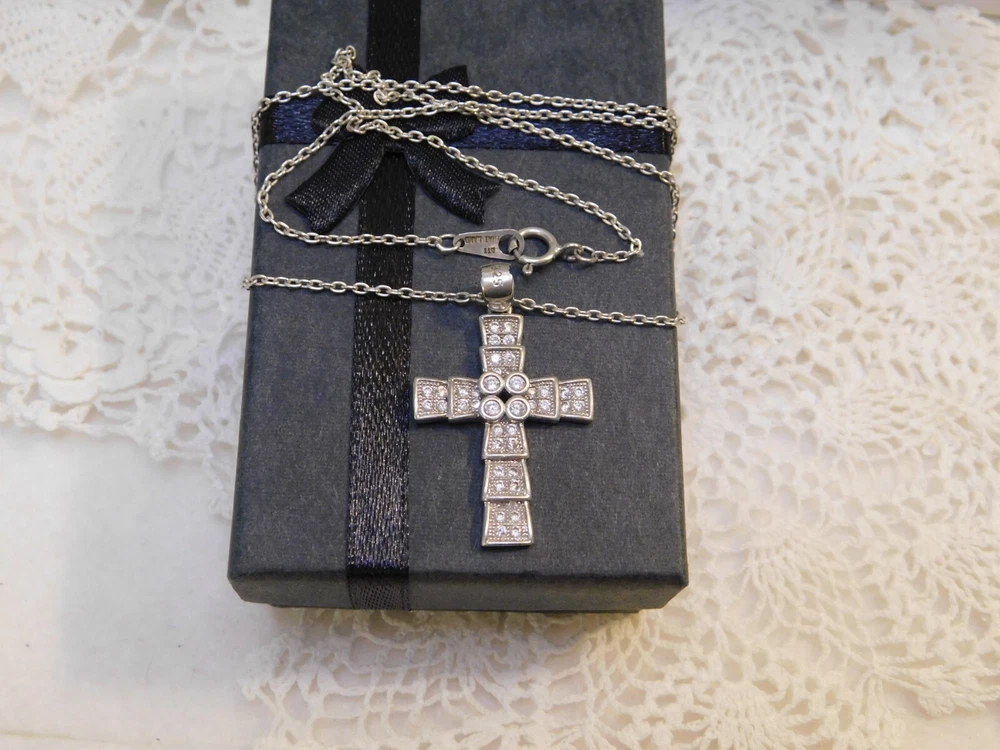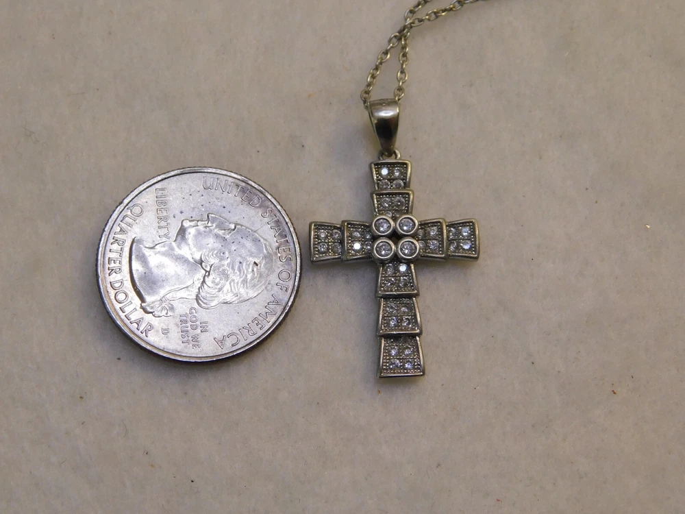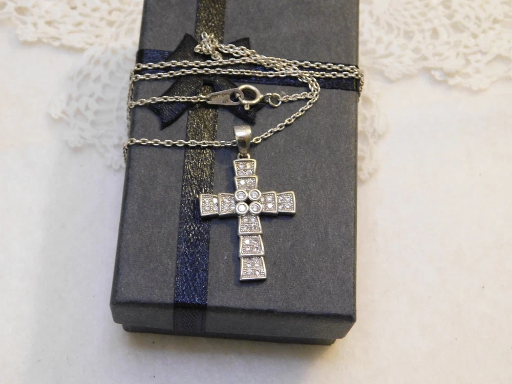 Sterling Silver Crystal Cross Pendant Necklace SIGNED: S 925 NECKLACE IS 16" AROUND - CROSS IS 1 1/4" LONG BY 3/4" ACROSS SUPER NICE, WONDERFUL CONDITION --------------------------------------- I WILL COMBINE SHIPPING UP UNTIL 6 DAYS, ALL HAVE TO BE PAID TOGETHER TO GET SHIPPING DISCOUNT. THE POSTAGE COST WILL DEPEND ON WEIGHT. THE MORE YOU WIN THE MUCH LESS SHIPPING WILL BE.