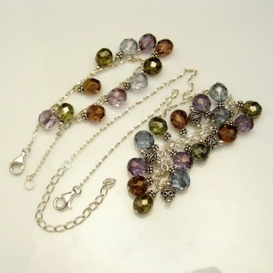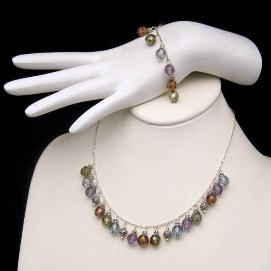 Lovely Sterling and Crystals Set Bali Style Beads, Multi Colored Crystals A beautiful Sterling Silver and crystal beads necklace and bracelet set. They both feature beautiful colored crystal dangles and Bali style Sterling beads, attached to Sterling chains. The crystal beads have a slight iridescent finish to add some extra sparkle. Both have secure lobster claw clasps and the necklace is adjustable via an extender chain. This is a wonderful set to wear with any outfit, as the variety of colors coordinates well with almost anything. A great looking, brilliant set that you will love wearing and that everyone will admire! Important Size Note: Please note that photos and jewelry displays show enlarged and closeup views. Please refer to the Measurements and Details section for actual dimensions. Thank you. Measurements and Details Necklace Length: Adjusts from 16 1/4 to 19 1/4 inches (41.2 to 48.8cm) Bracelet Length: 7 inches (17.7cm) Crystal Beads Size: About 5/16 inch (8mm) Bali Beads Size: About 1/4 inch (6mm) Clasp Type: Both pieces have secure lobster claw clasps Hallmarks: Stamped "925" on clasps Condition: New Don't miss out - this is a very unique Sterling Silver jewelry set that you won't see anywhere else, and only one is available. Click and buy it now before someone else does! Shipping Information Next Day Shipping: Items are usually shipped the day after purchase. Shipping days are Monday through Friday (except on U.S. Postal Holidays). International Customers Please Note: Shipping Fees DO NOT include import or customs fee or taxes charged by your country on imported items. U.S.A. Law requires the correct sale amount on all customs forms. Please contact your country's tax authorities to calculate any import duties or tax BEFORE making your purchase. Thank You. U.K Buyers Please Note: Royal Mail assesses an additional handling fee for all items requiring a VAT and/or Customs Import Duties. Fees can be verified at www.gov.uk/goods-sent-from-abroad/tax-and-duty. Thank You.