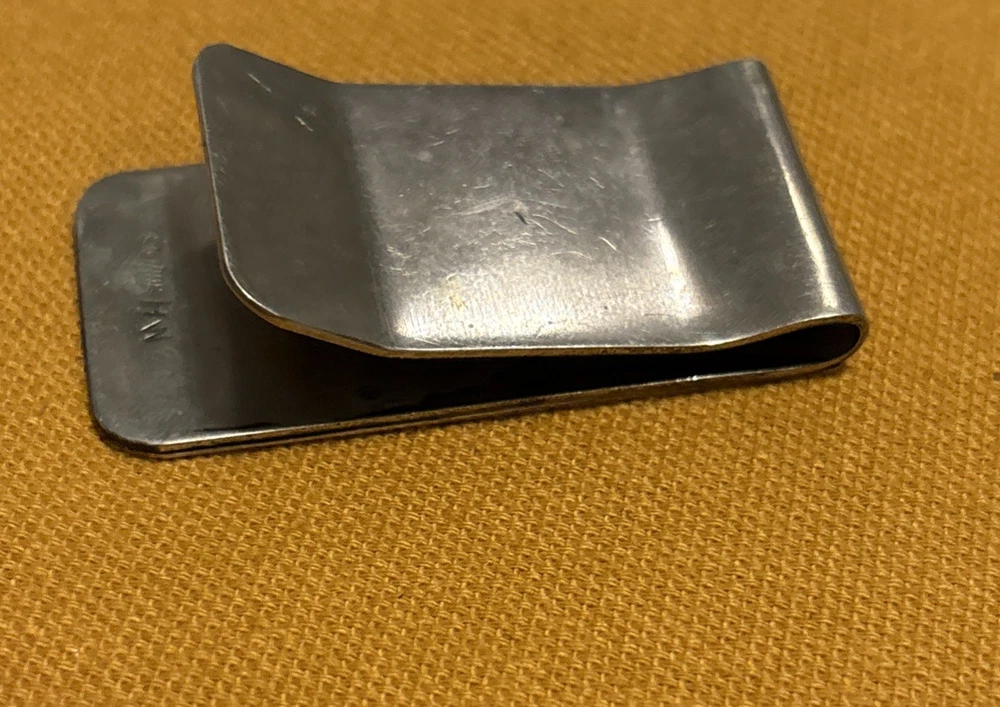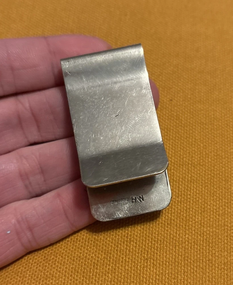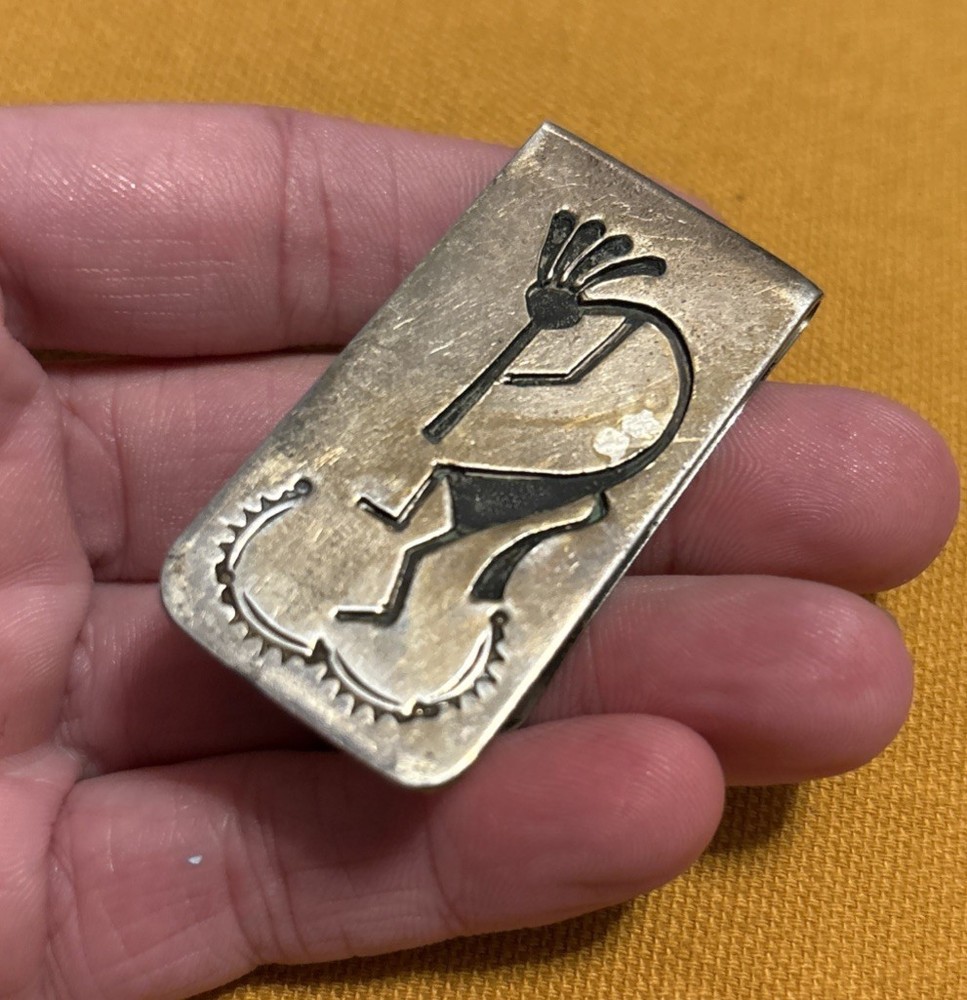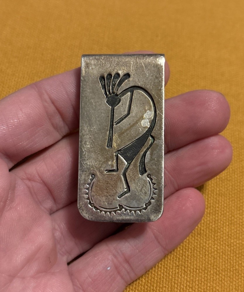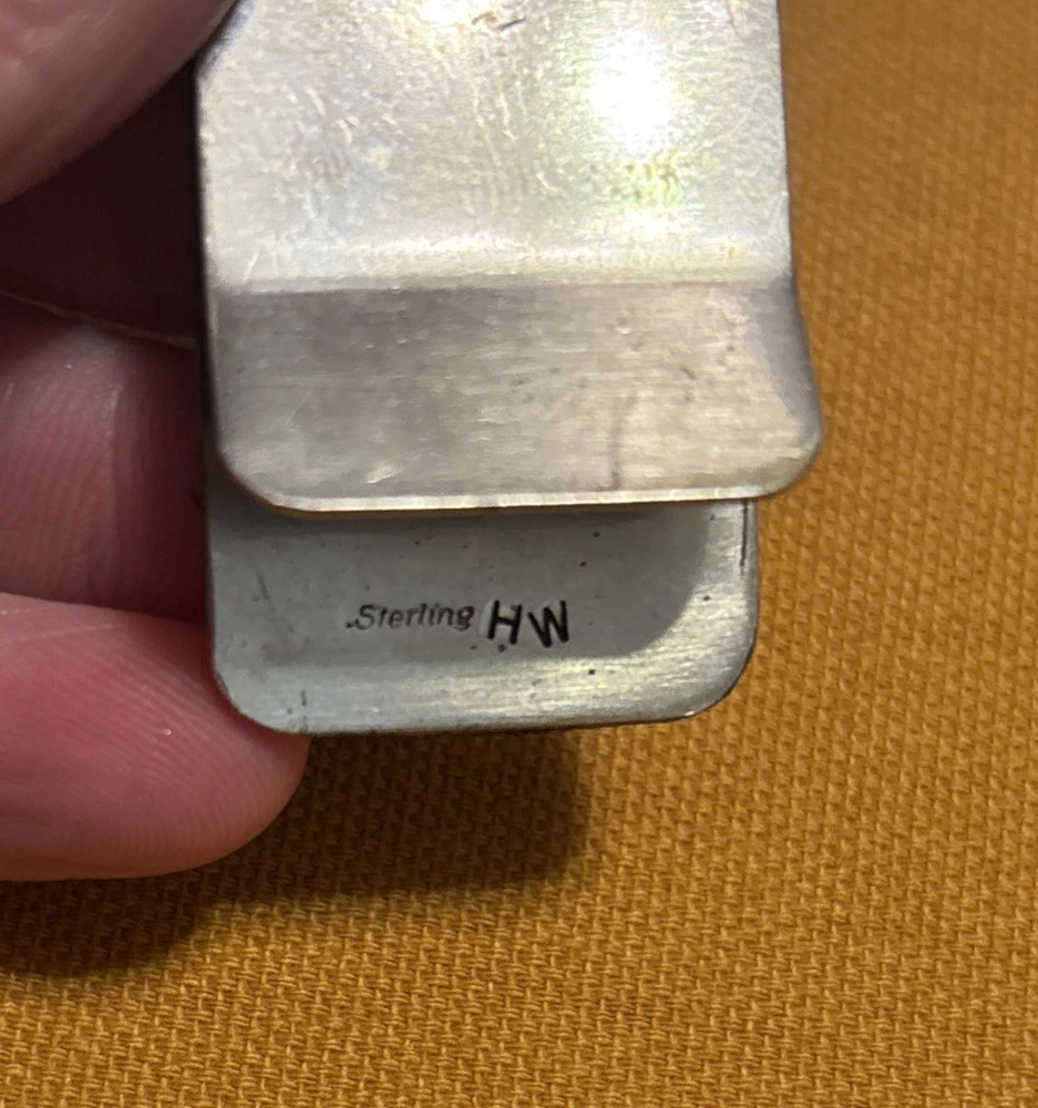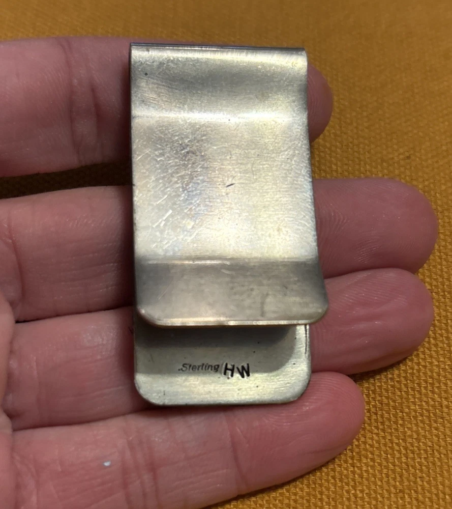 Sterling silver money clip with a Kokapelli design on the front. Nice and solid the item weighs 25 grams. The item is marked sterling as well as signed or marked with a HW or if it is upside down a MH. I’m sorry I wish I knew for sure. Please see all photos use as description and condition. Item is vintage and there is some light wear and tarnish. Please ask any questions prior to bidding. Yes I will combine shipping with other items. What you see is exactly what you will receive. Please leave feedback once you receive the item. THANK YOU