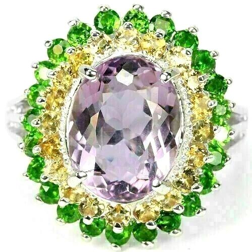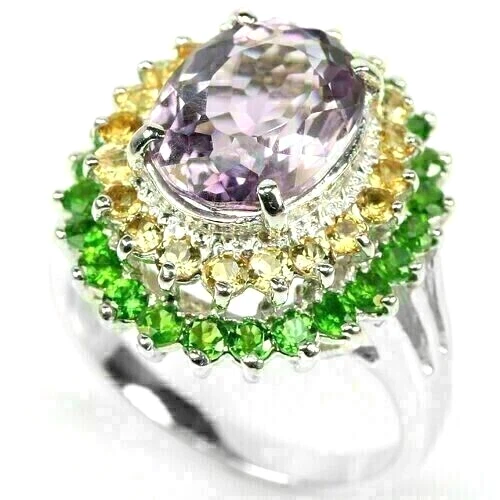 Solid sterling silver 925 stamped white gold coated large ring featuring a central genuine natural mined oval cut faceted purple amethyst gemstone measuring 11 mm x 9mm surrounded by a row of genuine natural mined round cut faceted golden citrine gemstones each measuring 2mm x 2mm which is surrounded by a row of round cut faceted genuine natural mined green chrome diopside gemstones each measuring 2mm x 2mm. The ring measures 20 mm x 18mm and it is a size O 1/2 (US 7.5). GIFT BOXED Thanks for looking and please take time to view my other listings #7064