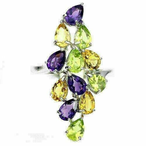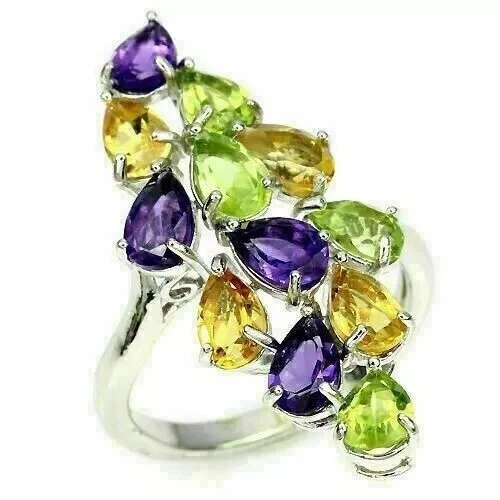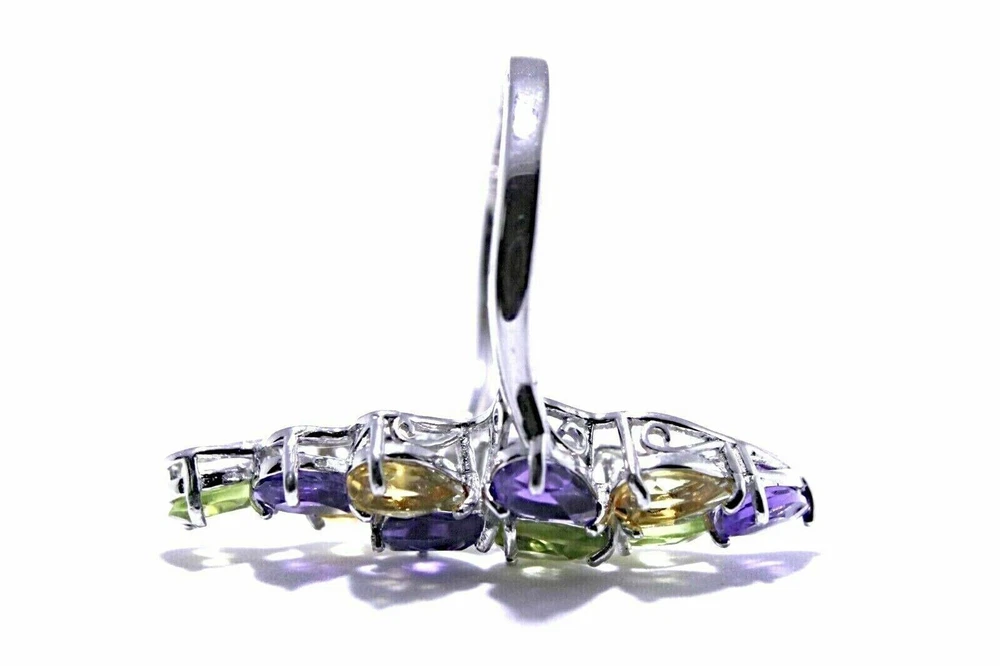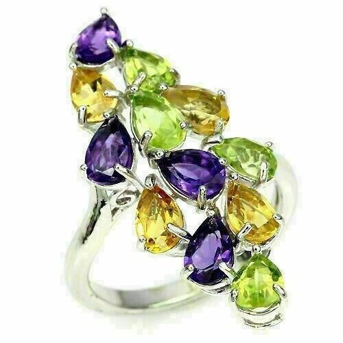 Solid sterling silver 925 stamped white gold coated ring which features pear cut faceted genuine natural mined purple amethyst, apple green peridot and golden yellow citrine gemstones each measuring 6mm x 4mm set into a large spray design ring. The face of the ring measures 33mm x 15 m m and it is a size R 1/2 (US 9). GIFT BOXED Thanks for looking and please take time to view my other listings #6794
