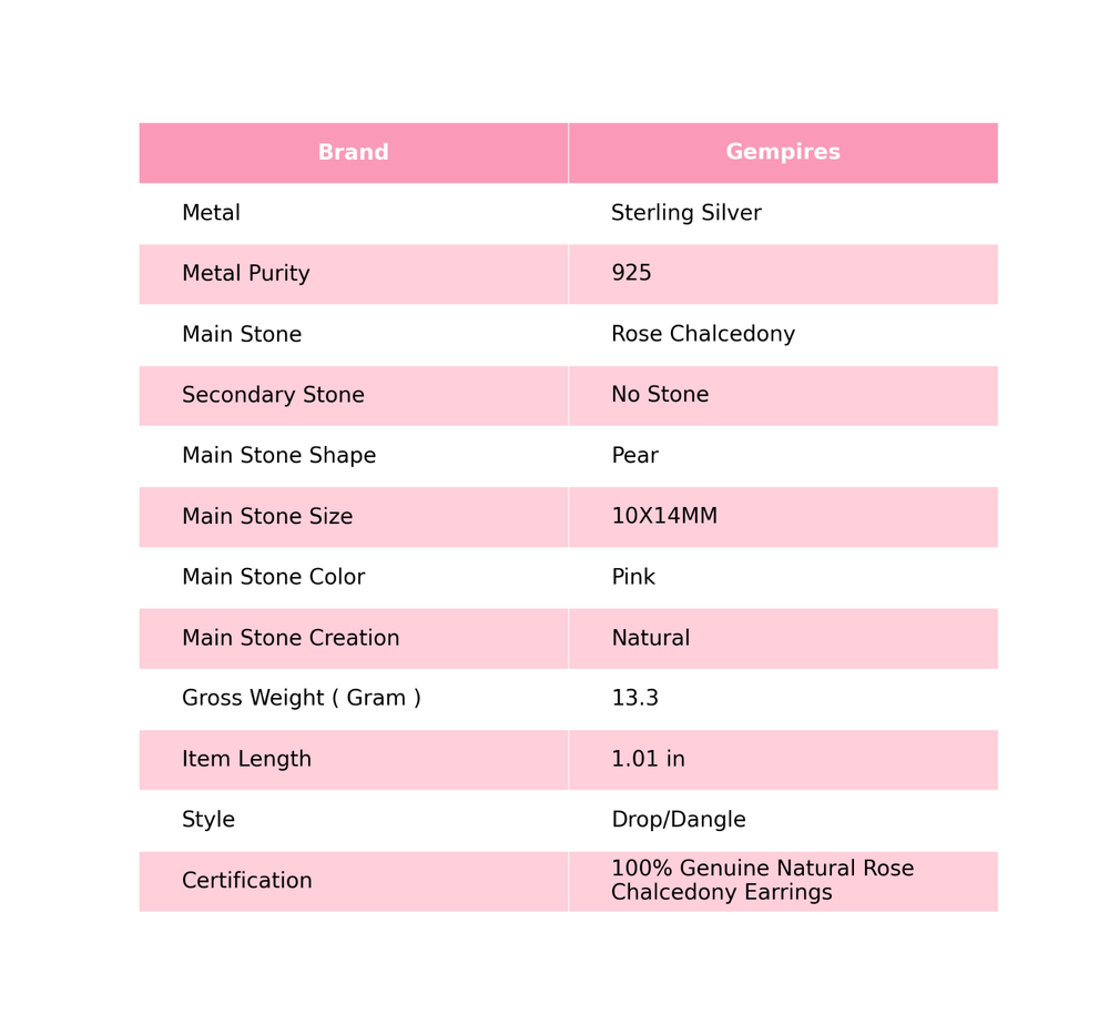 Welcome To Our Shop Gempires ------------------------------------------- Beautifully adorned with Rose Chalcedony and handmade vintage design, this Earrings will definitely grab attention. Pair it with any of your regular or special attire and let everyone appraise your sense of style. Sterling Silver Rose Chalcedony Stone Dangling Valentine Gift Earrings Jewelry Check My Other Earrings Listings : Click Here SKU:- PP-56-19 Metal:- Sterling Silver Metal Purity:- 925 Gemstone:- Rose Chalcedony Gemstone Color:- Pink Gemstone Shape :- Pear Gemstone Creation :- Natural Stone Setting :- Bezel Earring Length:- 1.01 Inches Earring Width:- Inches ___________________________________________________________________ Shipping Handling - Free Standard Shipping all over the world Handling Time - 2 to 5 BUSINESS Days Delivery Time - 7 to 20 Days ( Various on destination ) _________________________________________________________________ Returns - 1.We provide a 100% Money Back Guarantee, excluding shipping costs, within 30 days from the date of item receipt. 2.The item must not be altered or damaged in any way shape or form. 3.Upon receipt of the aforementioned items, your payment will be promptly refunded. 4.Please be so kind as to contact us via email in order to acquire comprehensive return instructions before proceeding with the return of the merchandise. 5.Kindly be advised to allocate a maximum period of 1 business day for the processing of all returns, in order for the appropriate credit to be applied. 6.Sizing does not affect the return policy. _________________________________________________________________ FAQ's - Q.1 ARE THE ITEMS YOU ARE SELLING BRAND NEW? We exclusively offer brand-new products, refraining from the sale of pre-owned jewelry. Our entire jewelry collection is composed of 100% natural, conflict-free pieces. We do not engage in the trade of imitation or lab-grown gemstones and diamonds. Q.2 WHAT ARE YOUR BUSINESS HOURS? we operate 24x7 as we have a dedicated team who works in different shifts to deliver the services to our valuable customers. ________________________________________________________________ Gempires is committed to delivering customers an unparalleled experience through the provision of exquisite handmade jewelry, meticulously crafted to uphold the most exacting standards of quality. Our operations encompass dual roles as both discerning connoisseurs and skilled artisans within the realm of jewelry making. We proudly hold an extensive proficiency in the fine art of enhancing gemstones, allowing us to harmonize them seamlessly with diverse aesthetic inclinations. We are delighted to extend to you the privilege of curating your very own jewelry collection. This collection will be graced by the presence of genuine and splendid natural gemstones, each possessing an innate authenticity and beauty that is truly unparalleled. **** STAY BLESSED ALWAYS*****