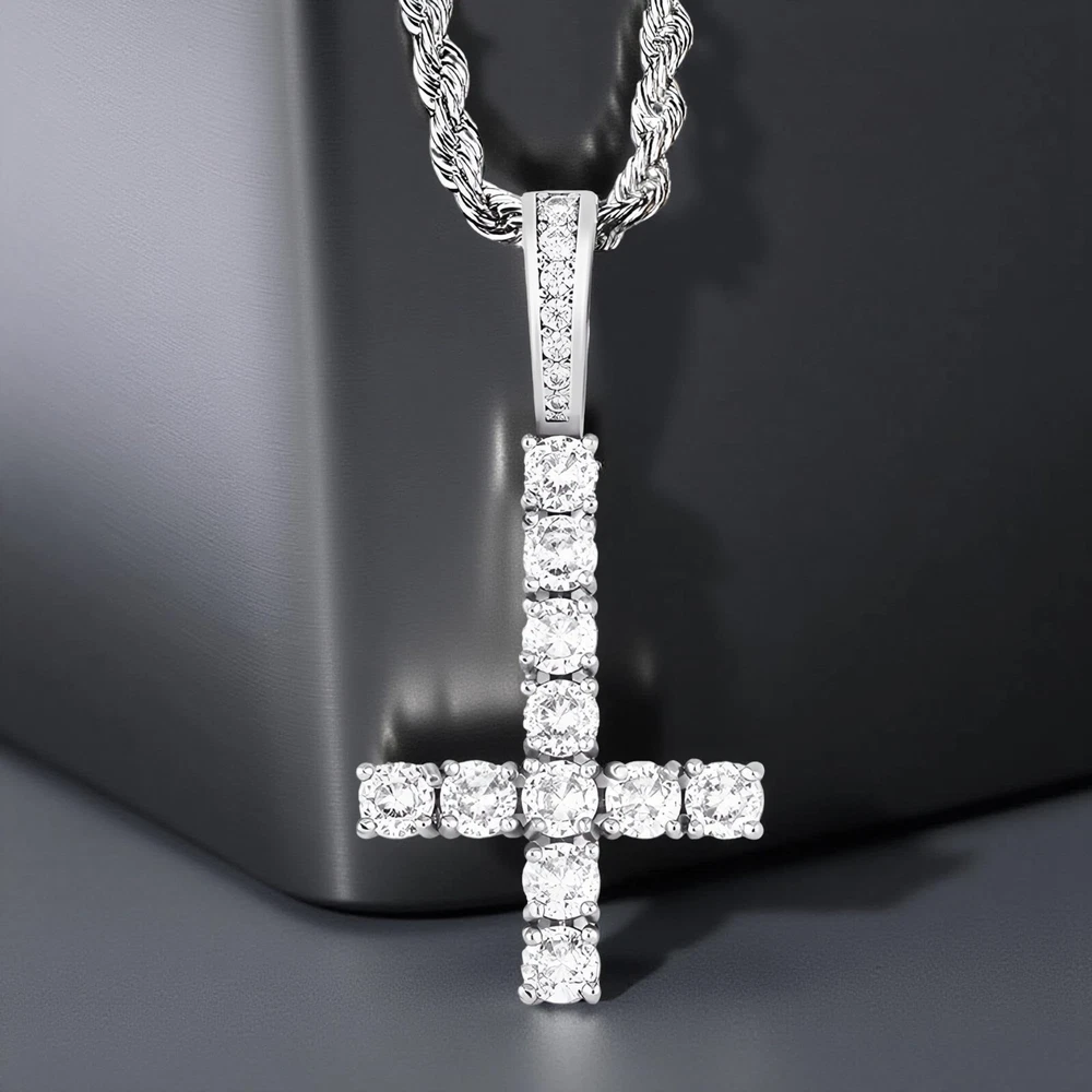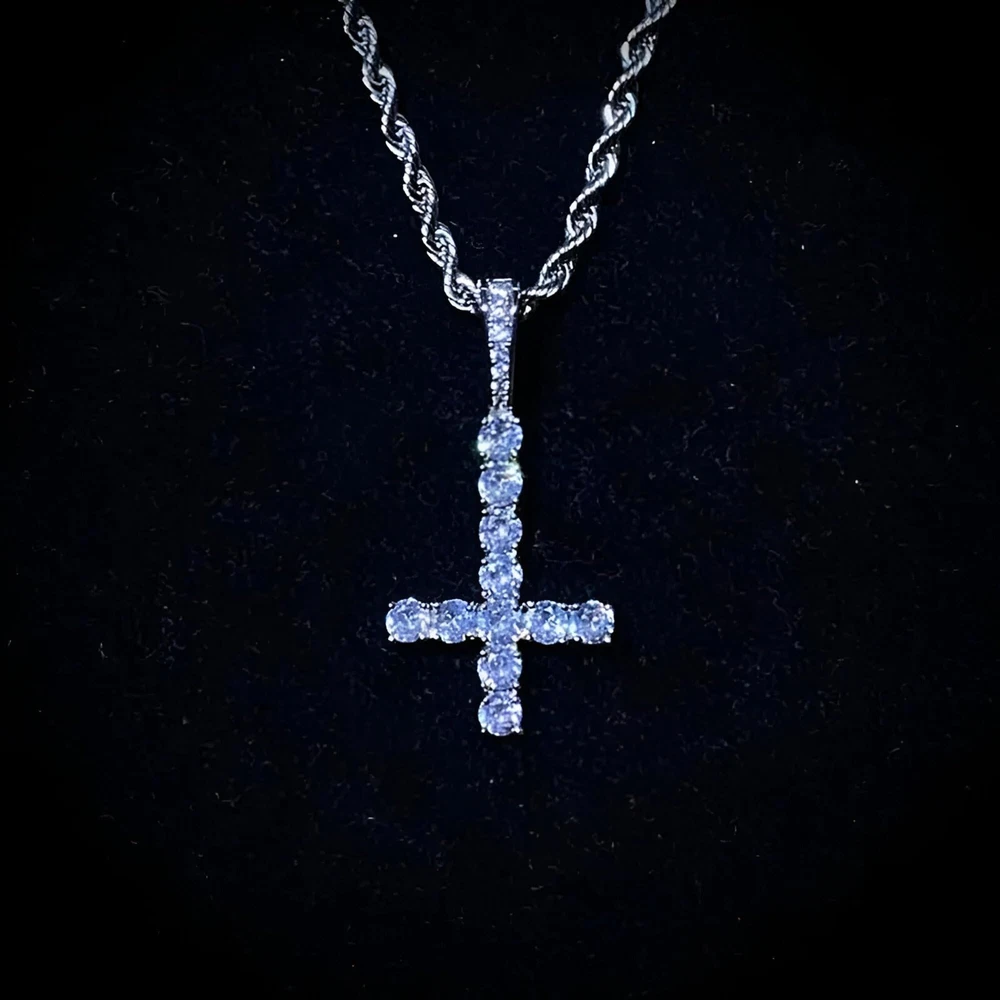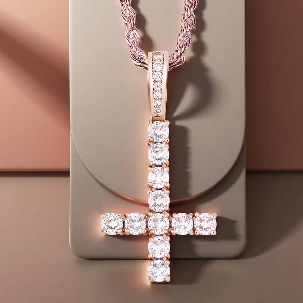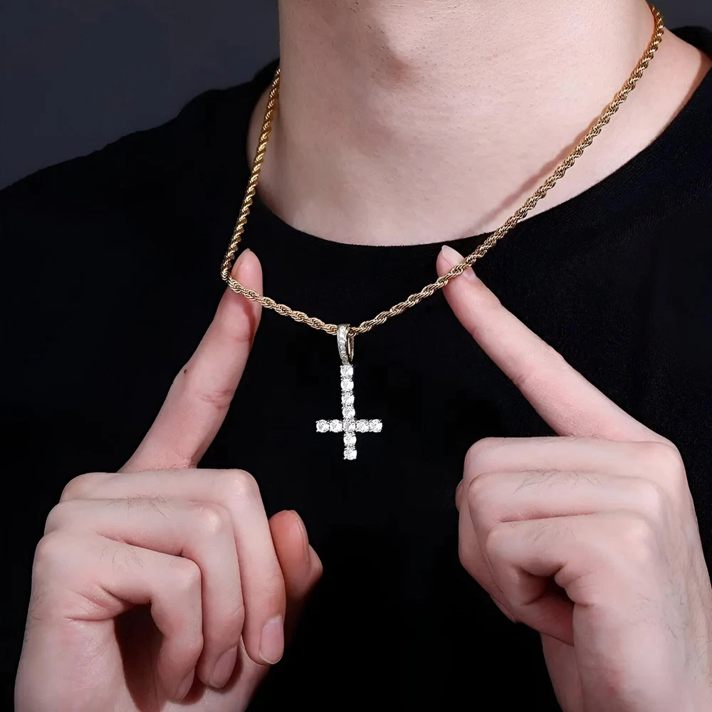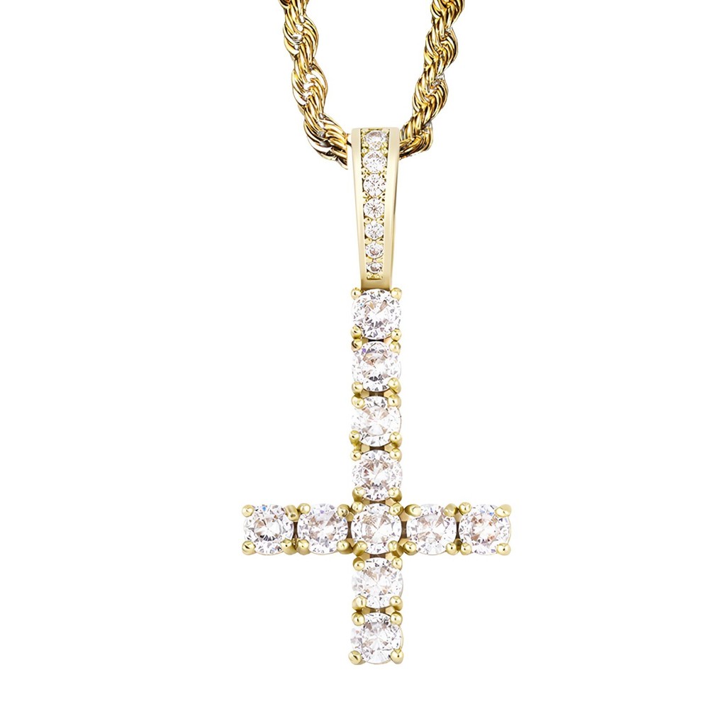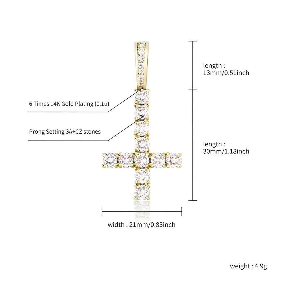 PREMIUM MATERIALS: Crafted from genuine 925 Sterling Silver with 14K gold filled plating for lasting elegance and durability DESIGN FEATURES: Upside down cross pendant adorned with sparkling cubic zirconia stones in a modern hip hop style VERSATILE WEAR: Suitable for both men and women, perfect for expressing personal style and faith STATEMENT PIECE: Eye-catching inverted cross design combines religious symbolism with contemporary fashion GIFT READY: Makes a meaningful present for special occasions, combining spiritual significance with trendy appeal
