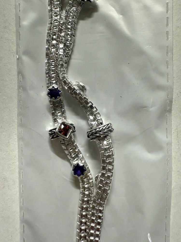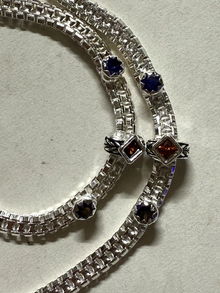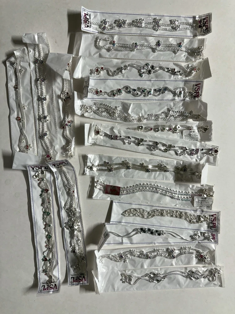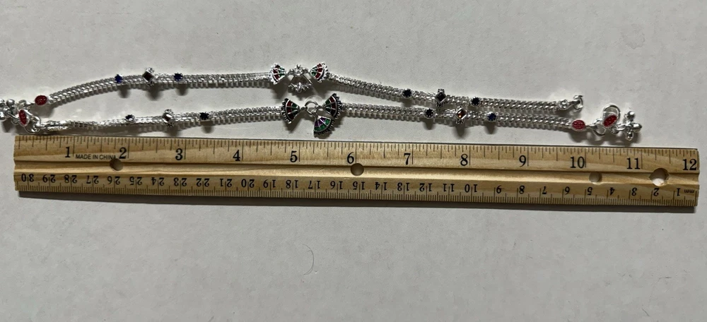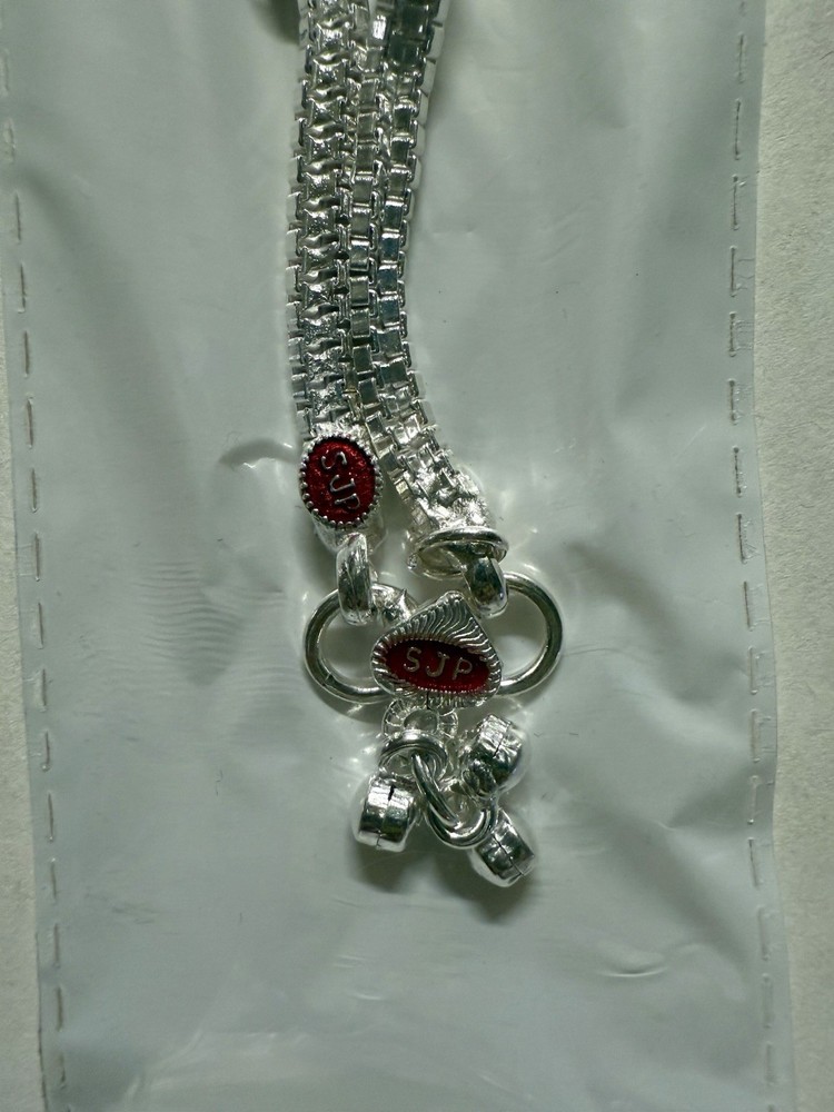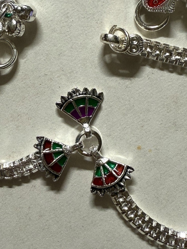 MODEL #ZN BRAND NEW, They come in their original packaging. LATEST, very trendy and unique DESIGN OF ANKLET, NEVER WORN EXCEPT FOR TAKING THIS PICTURE. THIS LISTING IS FOR ONE PAIR OF .925 STERLING SILVER ANKLE BRACELETS/ ANKLETS FROM INDIA. ACCORDING TO THE JEWELER, THEY ARE 80-90% SILVER. My family jeweler for 40 years in India. EACH ANKLET IS 10.8 INCHES LONG APPROX. ANKLETS FROM INDIA DO NOT FIT TIGHT ACROSS YOUR ANKLE BUT HAVE A BIT OF A SWAG TO THEM. Definitely party wear/ bridal design. THE clasp has RED/GREEN design with manufacturer stamp SJP. THE anklets do have a bit of jingle to them, very gently audible. (possible to open jump ring and remove bells, if you do not want them). The main body of the anklet has hanging triangles with enamel meena, red green color . Rust red and blue crystals along the sides. Heavy anklets, weight is 39.1 grams, so approx 1.3 ounces. Very GOOD QUALITY and sturdy PAYALS/ ANKLETS... BOUND TO GIVE YOU LOTS OF WEAR. KEEP IN MIND THAT THE ENAMEL MAY WEAR OFF over time. THIS IS JUST THE MOST BEAUTIFUL SET I HAVE FOR SALE, DO NOT MISS OUT!! Please note that silver will tarnish on wearing, and will need to be polished for shiny look. Never worn. ruler not included. Purchase with confidence, I ship immediately upon receiving payment. PLEASE KEEP IN MIND THAT THE COLORS MIGHT APPEAR SLIGHTLY DIFFERENT DUE TO CAMERA/ COMPUTER SCREEN. Item will be mailed FIRST CLASS PACKAGE WITH TRACKING. IN CASE OF RETURN, ONLY COST OF THE ITEM WILL BE REFUNDED. I leave feedback for you once I know you are satisfied with your purchase!