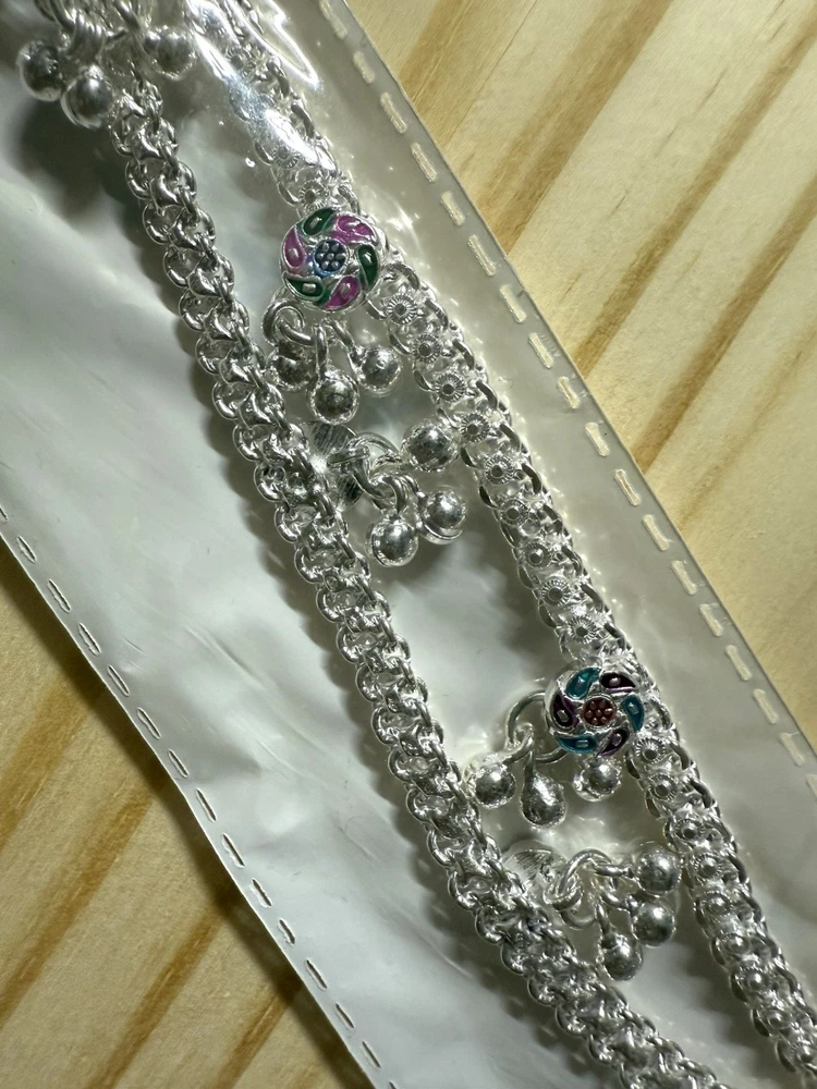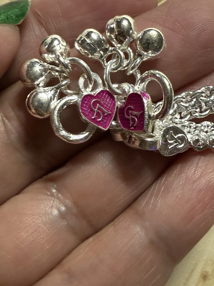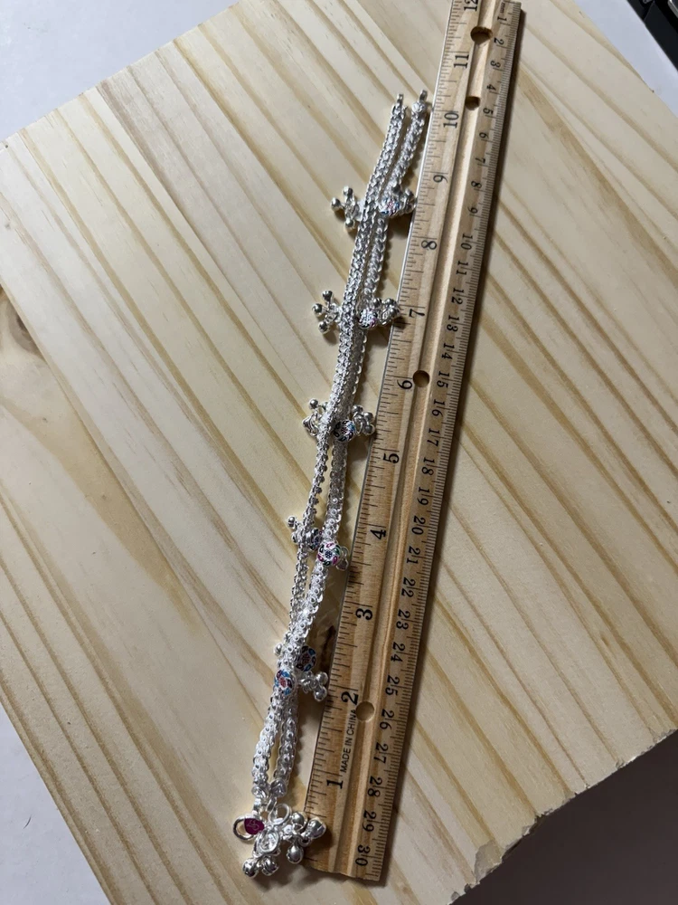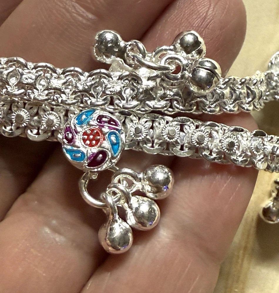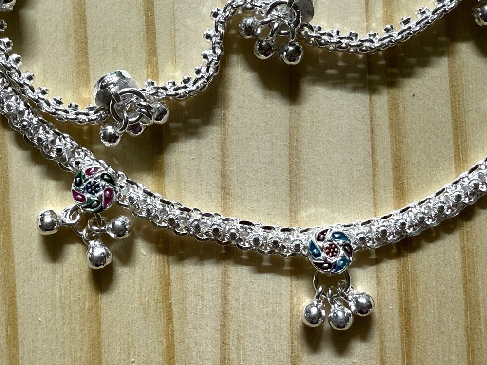 MODEL #ZF BRAND NEW, They come in their original packaging. LATEST, very trendy and unique DESIGN OF ANKLET, NEVER WORN. THIS LISTING IS FOR ONE PAIR OF .925 STERLING SILVER, please do not ask to purchase just 1, it is a lot of work to create 2 new listings. ANKLE BRACELETS/ ANKLETS FROM INDIA. Please note that they do not have 925 stamp on them which is normal for other countries. Also they are handmade, so they may not show machine smooth finishing. ACCORDING TO THE JEWELER, THEY ARE 80-90% SILVER. My family jeweler for 40 years in India. EACH ANKLET IS 10.5 INCHES LONG APPROX. I have 2 pairs of this style, one pair is 56.88 g, other pair is 57.48g, so each pair is close to 2 oz. You will randomly get 1 of these pairs. ANKLETS FROM INDIA DO NOT FIT TIGHT ACROSS YOUR ANKLE BUT HAVE A BIT OF A SWAG TO THEM. The 2 in the pair are temporarily connected with a jump ring, you will need to open it out to separate them. VERY PRETTY Formal/ party wear/ bridal design. THE clasp has PINK meena design with manufacturer stamp SV. THE anklets do have a bit of jingle to them, very gently audible. (possible to open jump ring and remove bells, if you do not want them). The main body of the anklet has 5 little round floral? shapes with dangling bells. These have red/ blueish/ green meena enamel in alternating colors . Very GOOD QUALITY and sturdy PAYALS/ ANKLETS... BOUND TO GIVE YOU LOTS OF WEAR. KEEP IN MIND THAT THE ENAMEL MAY WEAR OFF over time. THIS IS JUST THE MOST BEAUTIFUL SET I HAVE FOR SALE, DO NOT MISS OUT!! Please note that silver will tarnish on wearing, and will need to be polished for shiny look. ruler not included. Last pic shows all the other payal anklets I have available (not included with this listing), listed separately in my store. Purchase with confidence, I ship immediately upon receiving payment. PLEASE KEEP IN MIND THAT THE COLORS MIGHT APPEAR SLIGHTLY DIFFERENT DUE TO CAMERA/ COMPUTER SCREEN. Item will be mailed ground advantage PACKAGE WITH TRACKING. IN CASE OF RETURN, ONLY COST OF THE ITEM WILL BE REFUNDED. I leave feedback for you once I know you are satisfied with your purchase!
