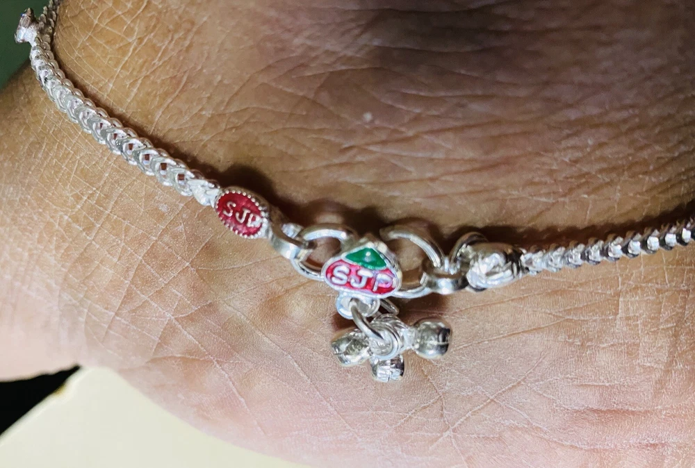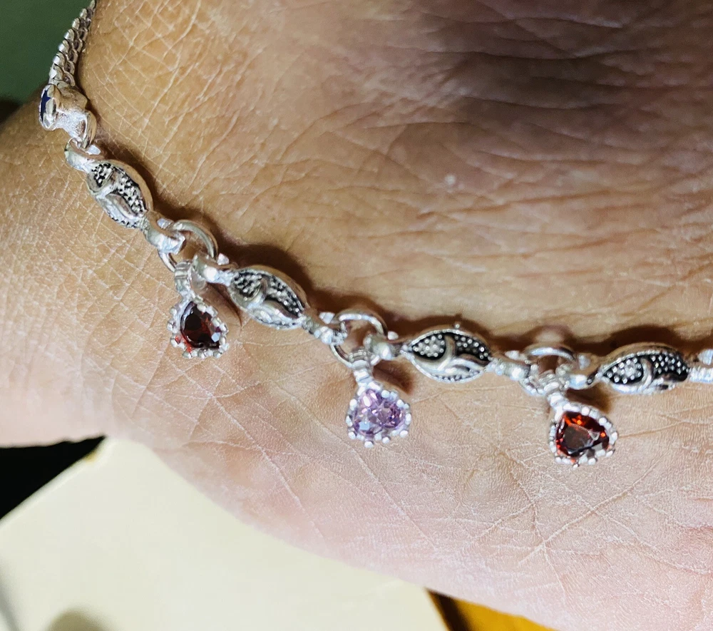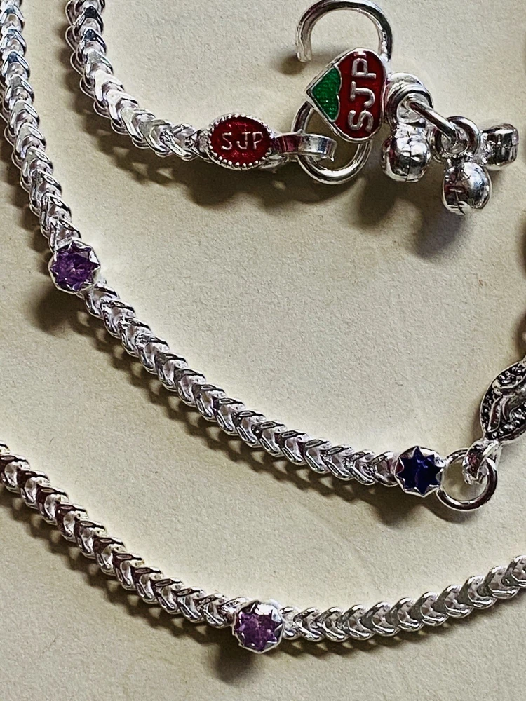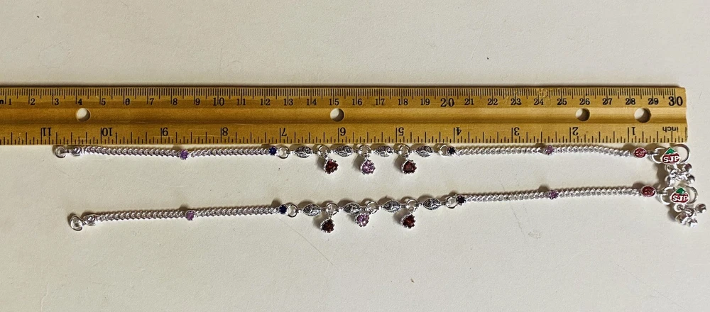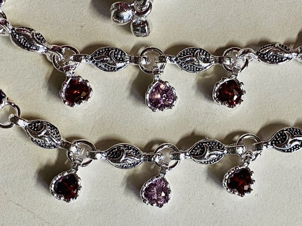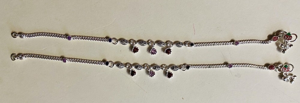 MODEL #AW BRAND NEW, They come in their original packaging. LATEST, very trendy and unique DESIGN OF ANKLET, NEVER WORN EXCEPT FOR TAKING THIS PICTURE. THIS LISTING IS FOR ONE PAIR OF .925 STERLING SILVER ANKLE BRACELETS/ ANKLETS FROM INDIA. ACCORDING TO THE JEWELER, THEY ARE 80-90% SILVER. My family jeweler for 40 years in India. EACH ANKLET IS 10.8 INCHES LONG APPROX. ANKLETS FROM INDIA DO NOT FIT TIGHT ACROSS YOUR ANKLE BUT HAVE A BIT OF A SWAG TO THEM. Definitely party wear/ bridal design. THE clasp has RED/GREEN design with manufacturer stamp SJP. THE anklets do have a bit of jingle to them, very gently audible. (possible to open jump ring and remove bells, if you do not want them). The main body of the anklet has hanging PINK AND garnet colored crystals, almost heart shaped. Pink and blue crystals along the sides. Heavy anklets, weight is 31.35 grams, so approx 1 ounce. Very GOOD QUALITY and sturdy PAYALS/ ANKLETS... BOUND TO GIVE YOU LOTS OF WEAR. KEEP IN MIND THAT THE ENAMEL MAY WEAR OFF over time. THIS IS JUST THE MOST BEAUTIFUL SET I HAVE FOR SALE, DO NOT MISS OUT!! Please note that silver will tarnish on wearing, and will need to be polished for shiny look. Never worn, except for 1 pic. ruler not included. Purchase with confidence, I ship immediately upon receiving payment. PLEASE KEEP IN MIND THAT THE COLORS MIGHT APPEAR SLIGHTLY DIFFERENT DUE TO CAMERA/ COMPUTER SCREEN. Item will be mailed FIRST CLASS PACKAGE WITH TRACKING. IN CASE OF RETURN, ONLY COST OF THE ITEM WILL BE REFUNDED. I leave feedback for you once I know you are satisfied with your purchase!