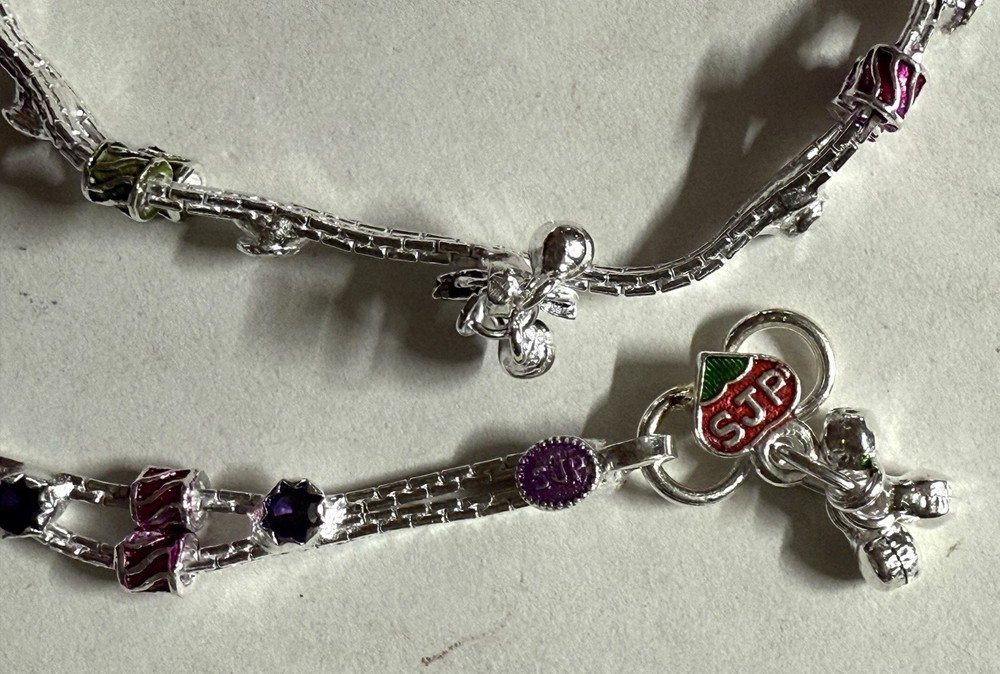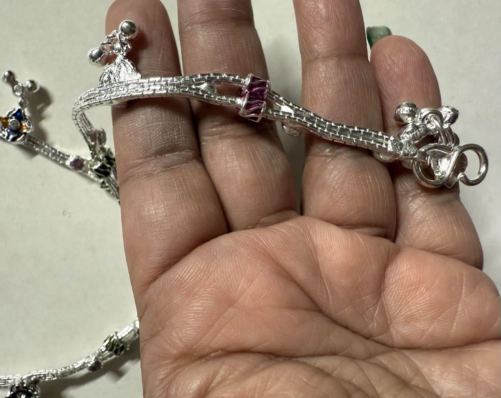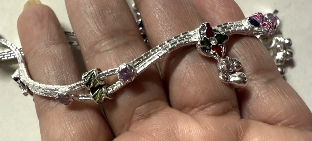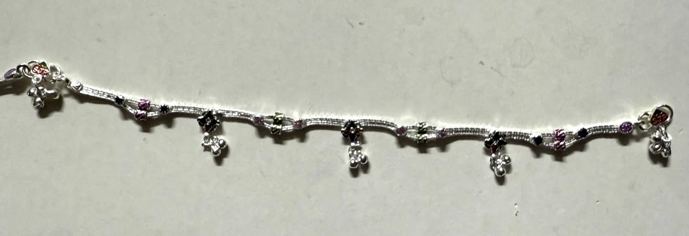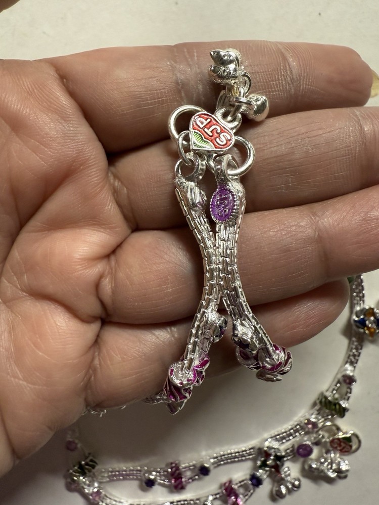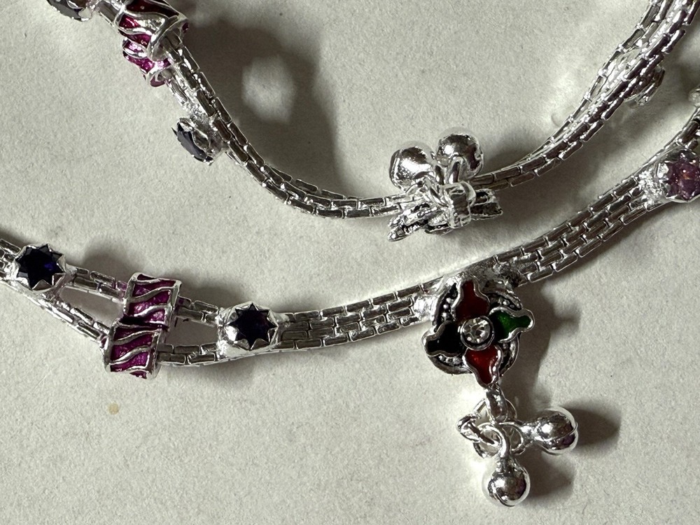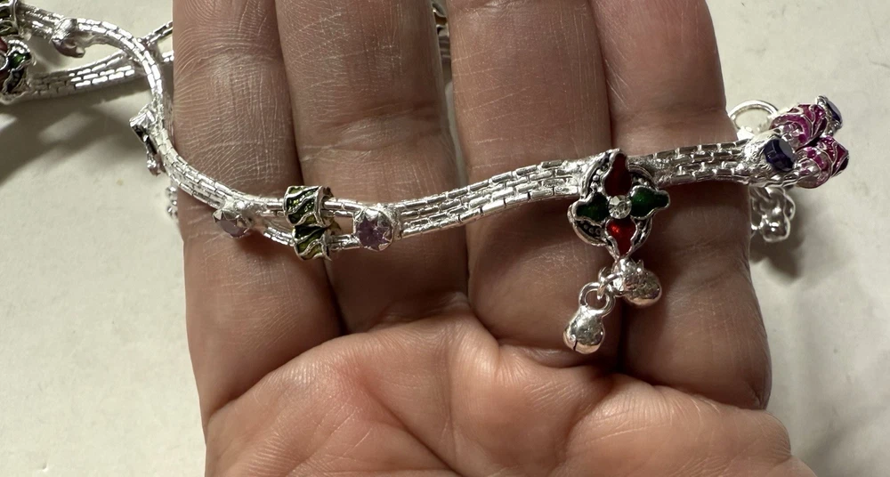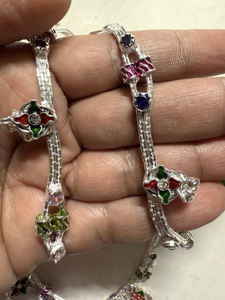 MODEL #ZH BRAND NEW, They come in their original packaging. LATEST, very trendy and unique DESIGN OF ANKLET, NEVER WORN. THIS LISTING IS FOR ONE PAIR OF .925 STERLING SILVER, please do not ask to purchase just 1, it is a lot of work to create 2 new listings. ANKLE BRACELETS/ ANKLETS FROM INDIA. Please note that they do not have 925 stamp on them which is normal for other countries, and are handmade. ACCORDING TO THE JEWELER, THEY ARE 80-90% SILVER. My family jeweler for 40 years in India. EACH ANKLET IS 10.5 INCHES LONG APPROX. Weight of this pair is 51.73 grams, so a bit more than 1.5 ounces. ANKLETS FROM INDIA DO NOT FIT TIGHT ACROSS YOUR ANKLE BUT HAVE A BIT OF A SWAG TO THEM. The 2 in the pair are temporarily connected with a jump ring, you will need to open it out to separate them. VERY PRETTY Formal/ party wear/ bridal design. THE clasp has red/green meena design with manufacturer stamp SJP. THE anklets do have a bit of jingle to them, very gently audible. (possible to open jump ring and remove bells, if you do not want them). The main body of the anklet has double strands of chains with barrel beads and 4-petal floral shapes, very unusual pink green meena enamel . Very GOOD QUALITY and sturdy PAYALS/ ANKLETS... BOUND TO GIVE YOU LOTS OF WEAR. KEEP IN MIND THAT THE ENAMEL MAY WEAR OFF over time. THIS IS JUST THE MOST BEAUTIFUL SET I HAVE FOR SALE, DO NOT MISS OUT!! Please note that silver will tarnish on wearing, and will need to be polished for shiny look. ruler not included. Last pic shows all the other payal anklets I have available (not included with this listing), listed separately in my store. Purchase with confidence, I ship immediately upon receiving payment. PLEASE KEEP IN MIND THAT THE COLORS MIGHT APPEAR SLIGHTLY DIFFERENT DUE TO CAMERA/ COMPUTER SCREEN. Item will be mailed ground advantage PACKAGE WITH TRACKING. IN CASE OF RETURN, ONLY COST OF THE ITEM WILL BE REFUNDED. I leave feedback for you once I know you are satisfied with your purchase!