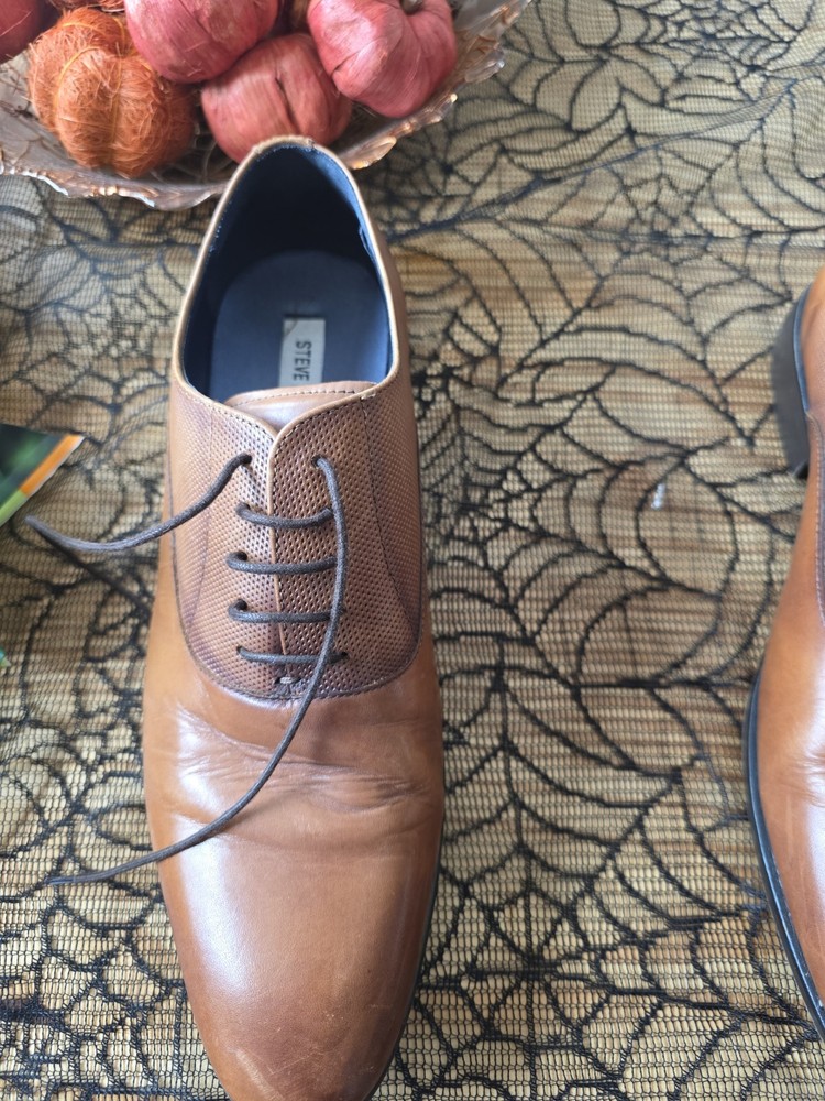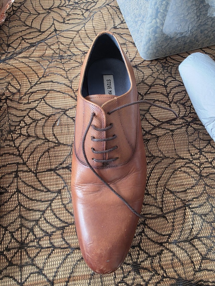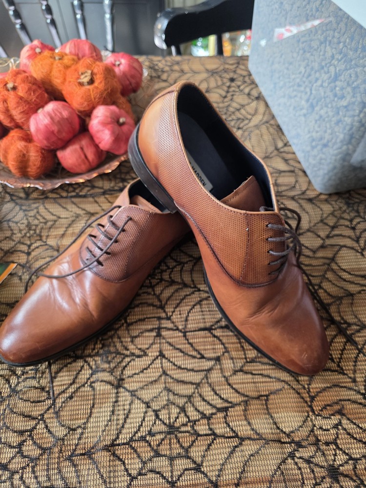 The product is a pair of Steve Madden men's dress shoes in tan, size 8 UK (9 US). These Oxford style shoes are made of leather with the Steve Madden logo accent. They are designed for formal occasions and are in good condition, ideal for completing a smart and stylish outfit. The shoes are from China and have a classic brown colour that is versatile and timeless. Perfect for men who appreciate quality and style in their footwear.