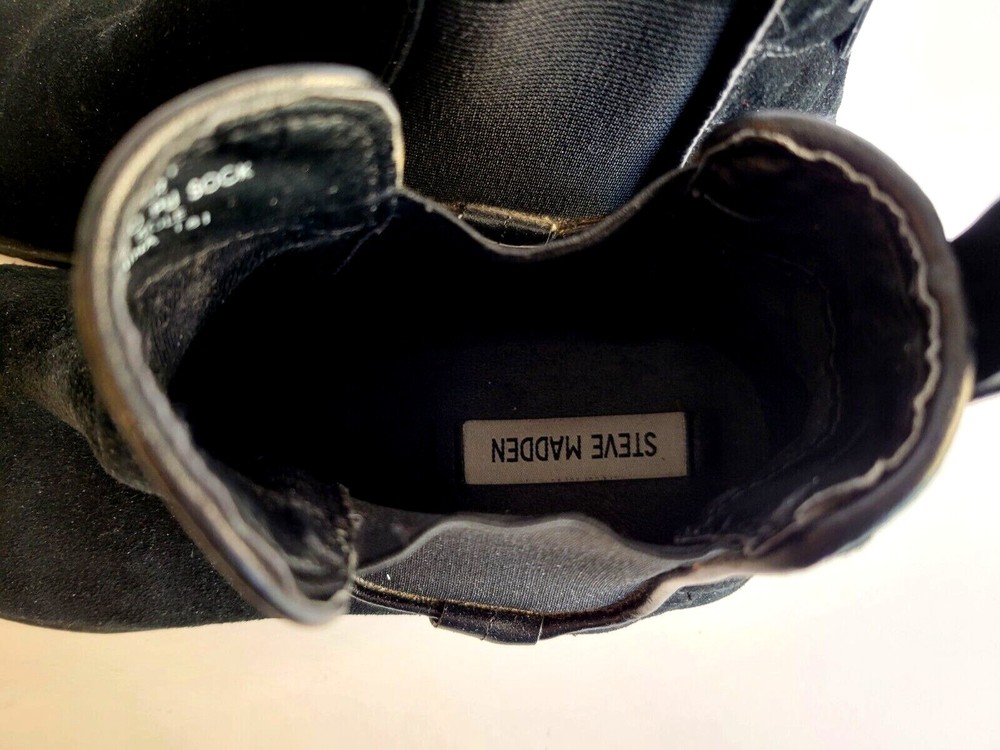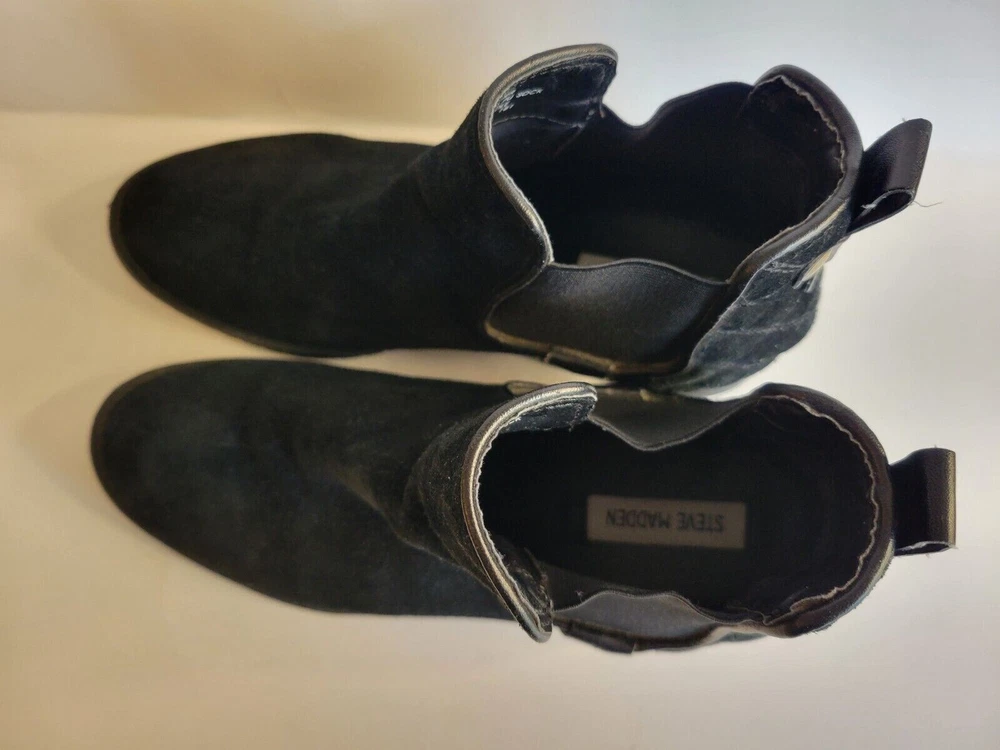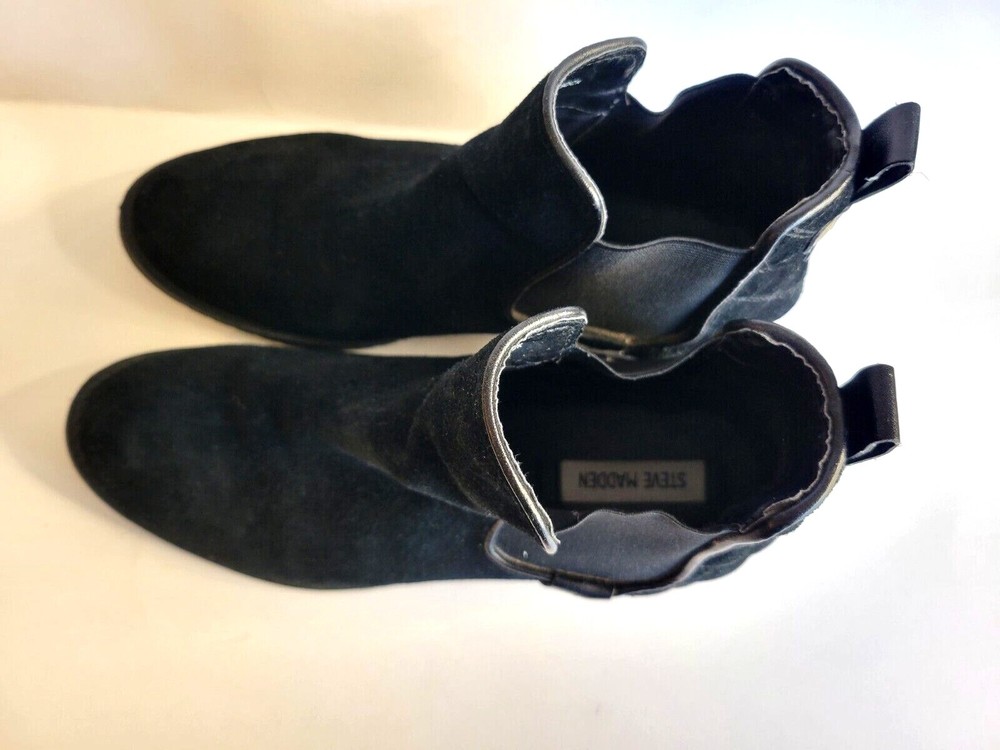 Steve Madden "Gianna" black suede leather bootie. Slip on with stretchy sides and pointed toes. Pull on tabs in back with rivet accents. 1/2 inch block heal. Very nice condition with little sign of wear.