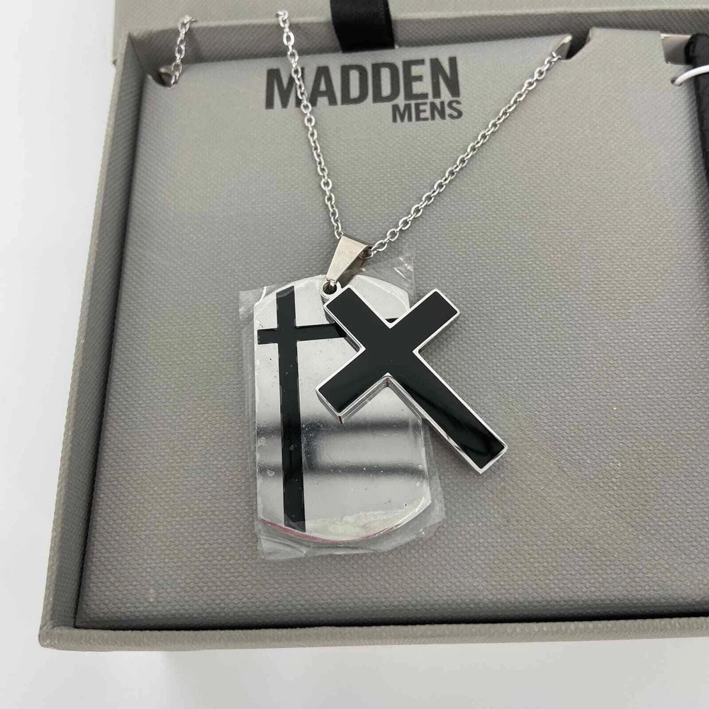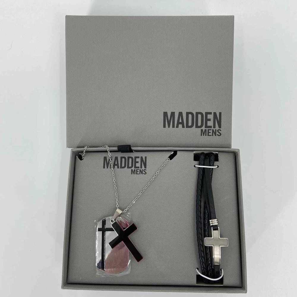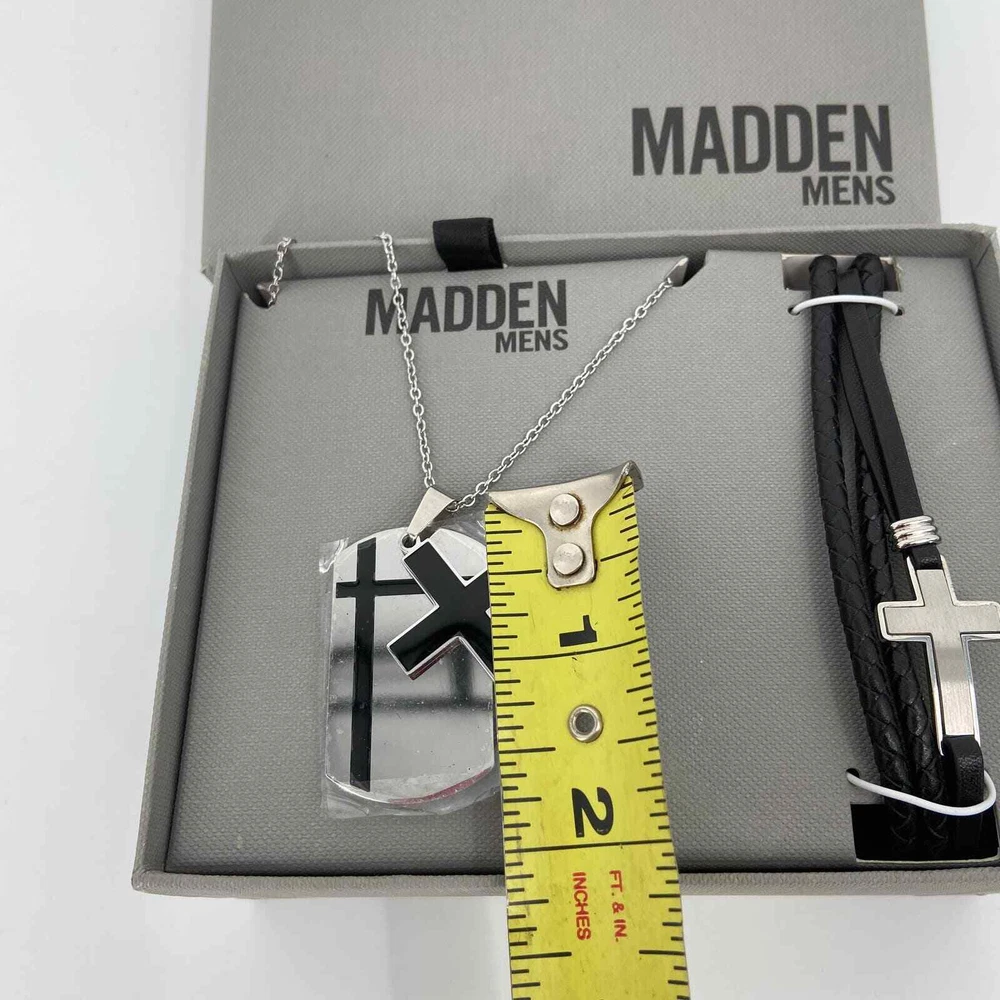 Steve Madden Men's Jewelry Gift Set Cross Necklace and Bracelet Silver Tone & Black Magnetic closure bracelet Necklace length: approx 20" with 3" extender Bracelet length: approx 9" NEW in Box Retail: $70.00