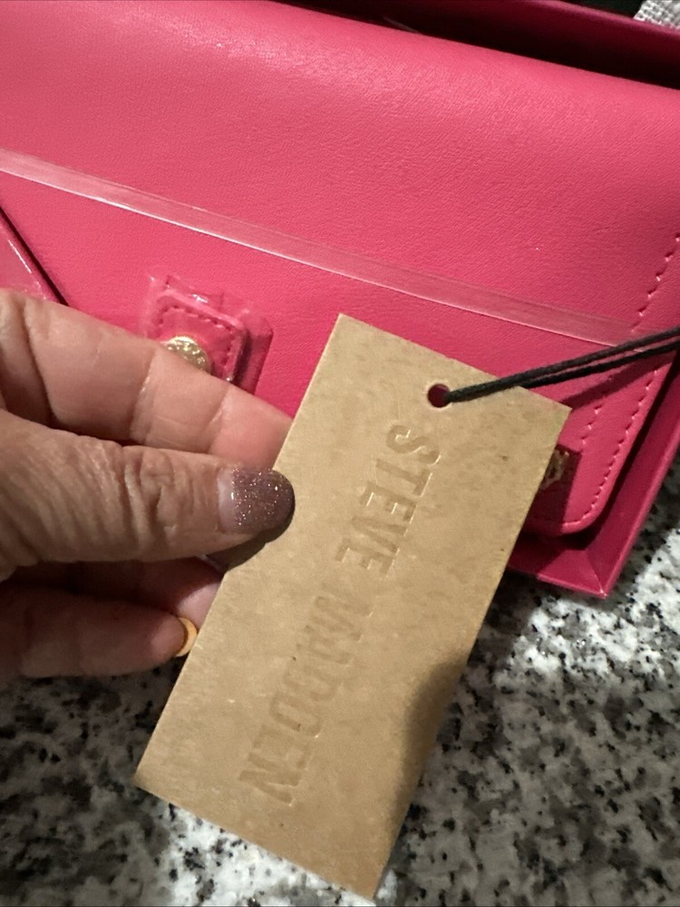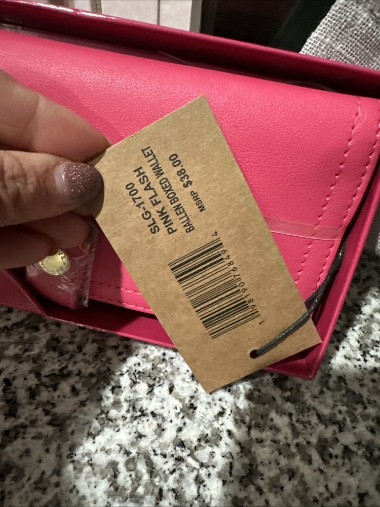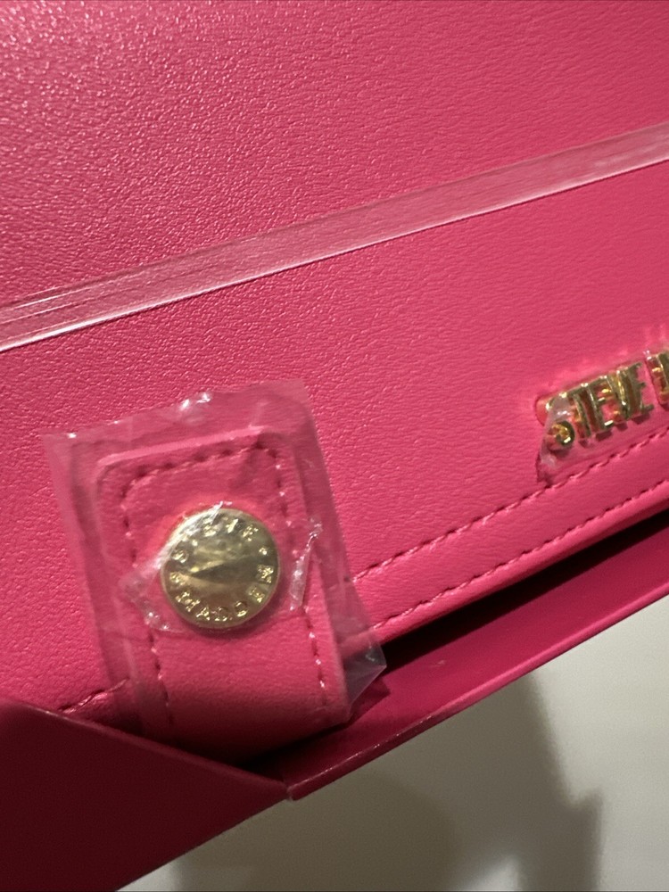 This Steve Madden women's wallet has fabulous retro style, featuring a bright pink color with a neon flash design. The wallet is a button close type, crafted from faux leather material, and includes credit card slots and a folding design. With a small size suited for on-the-go use, this wallet exudes a playful and vibrant aesthetic perfect for adding a pop of color to any outfit.