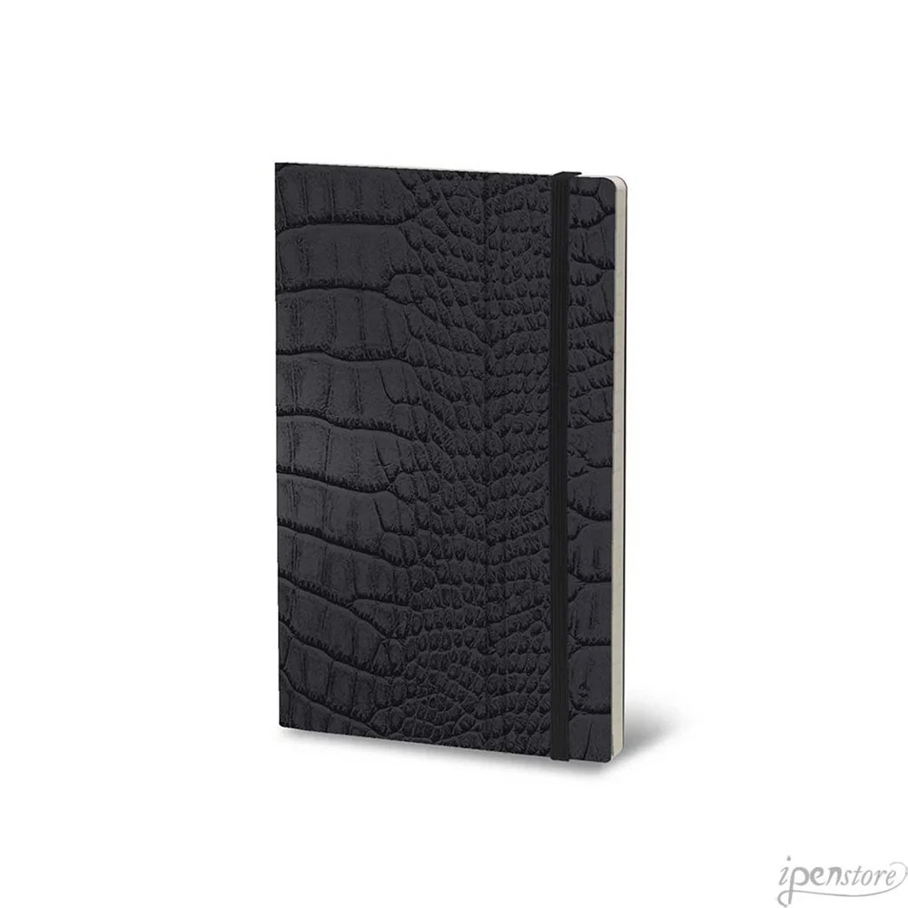 Stifflex Mrs Crocodile Series Pocket Notebook, A6-3.5"x5.5" Lined, Black A6 - 3.5" x 5.5" (90 x 140mm) Medium weight (80 g) acid-free, pH neutral paper is fountain pen friendly The Stifflex hard and flexible cover notebook comes with an elastic closure, inner pocket/bookmark and a cardboard ruler/bookmark. The notebooks are made with acid-free uncoated ivory-colored paper of 80g. An innovative system patented by Giuliano Mazzuoli, the designer and founder of the company, is at the foundation of the Stifflex collections that are born from the talent and the creativity of a number of young graphic designers who by giving a free outlet to their fantasies have conceived the covers for the new collections of notebooks. Size 3.5" x 5.5" (90mm x 140mm) 144 pages (72 sheets) - 80g acid-free uncoated ivory paper 96 Lined; 32 Blank; 16 perforated Graph Stiff and flexible cover Elastic closure Inner pocket/bookmark; cardboard ruler