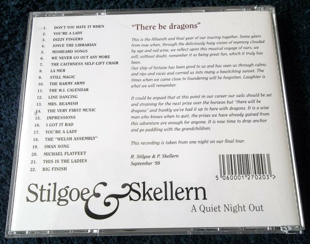 Richard Stilgoe & Peter Skellern - A Quiet Night Out, UK CD Album 2000, HRO Records, HROCD001, 22 Tracks. Recorded Live at The Everyman Theatre, Cheltenham, 13th June 1999. Excellent condition. No scuff marks on the disc. Tracklist 1. Don't You Hate It When 2. You're A Lady 3. Dizzy Fingers 4. Joyce The Librarian 5. Misheard Songs 6. We Never Go Out Any More 7. The Caithness Self-lift Chair 8. La Mer 9. Still Magic 10. The Barmy Army 11. The W.I. Calendar 12. Line Dancing 13. Mrs. Beamish 14. The Very First Music 15. Impressions 16. I Got It Bad 17. You're A Lady 18. The 'Welsh Assembly' 19. Swan Song 20. Michael Flatfeet 21. This Is The Ladies 22. Big Finish Hello, many thanks for looking in at my listings. I would be happy to combine postage costs if more than one item is bought. Anything else you need help with please feel free to message me through eBay. Happy bidding