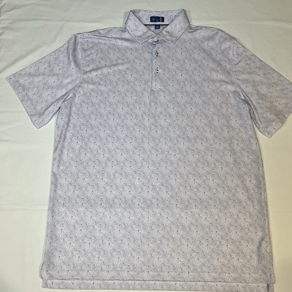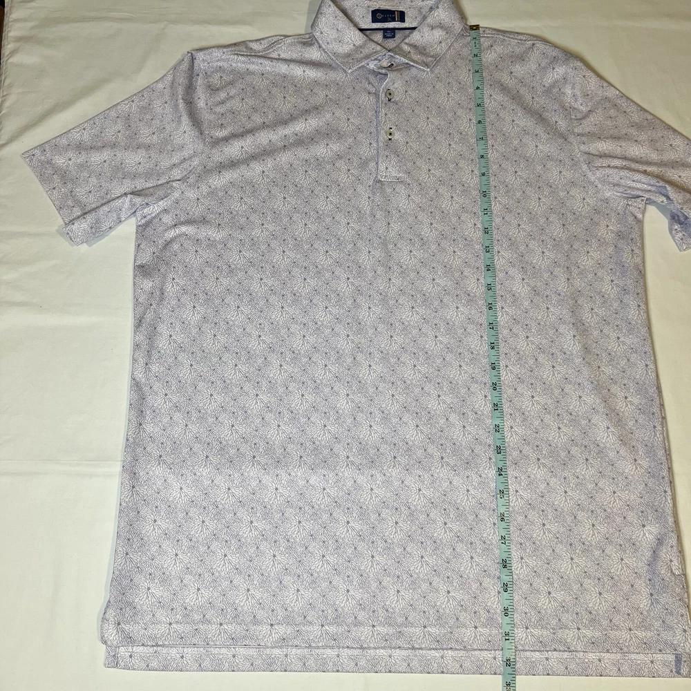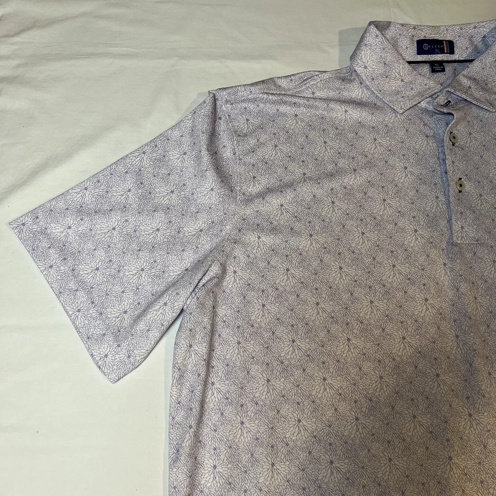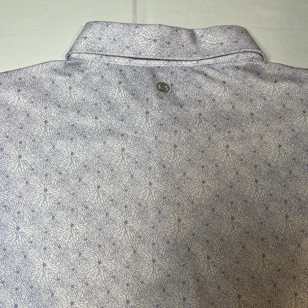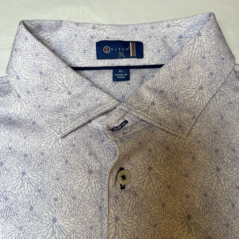 This is a men's Stitch brand golf polo shirt in size Large with a multicolor floral print design. It features short sleeves, a collared neckline, and is made for a regular fit. The shirt is breathable and is suitable for golfing activities. It does not have a vintage style. CONDITION: this is a pre-owned item in excellent condition with no known damage or stains.