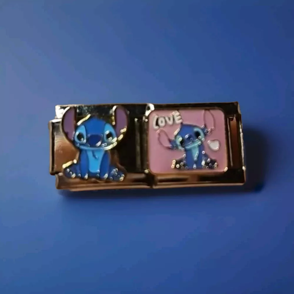 Lilo alien Stitch love Italian Charms. Set of two. Crafted from stainless steel, these charms are perfect for any occasion, whether it be a gift for a loved one or a special treat for yourself. The charms feature a rectangular shape with a link closure, making them easy to add to your bracelet. The charms are customizable and can be personalized with your own unique design. They come in a 9mm length and are available in silver color. These charming Italian charms are a great addition to any collection and make a wonderful gift for any animal lover.