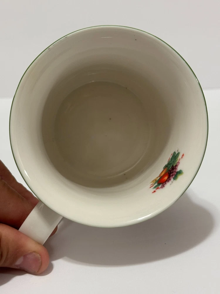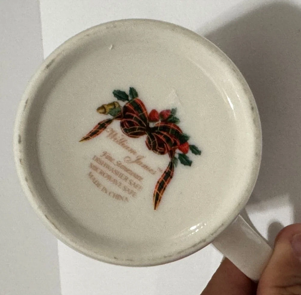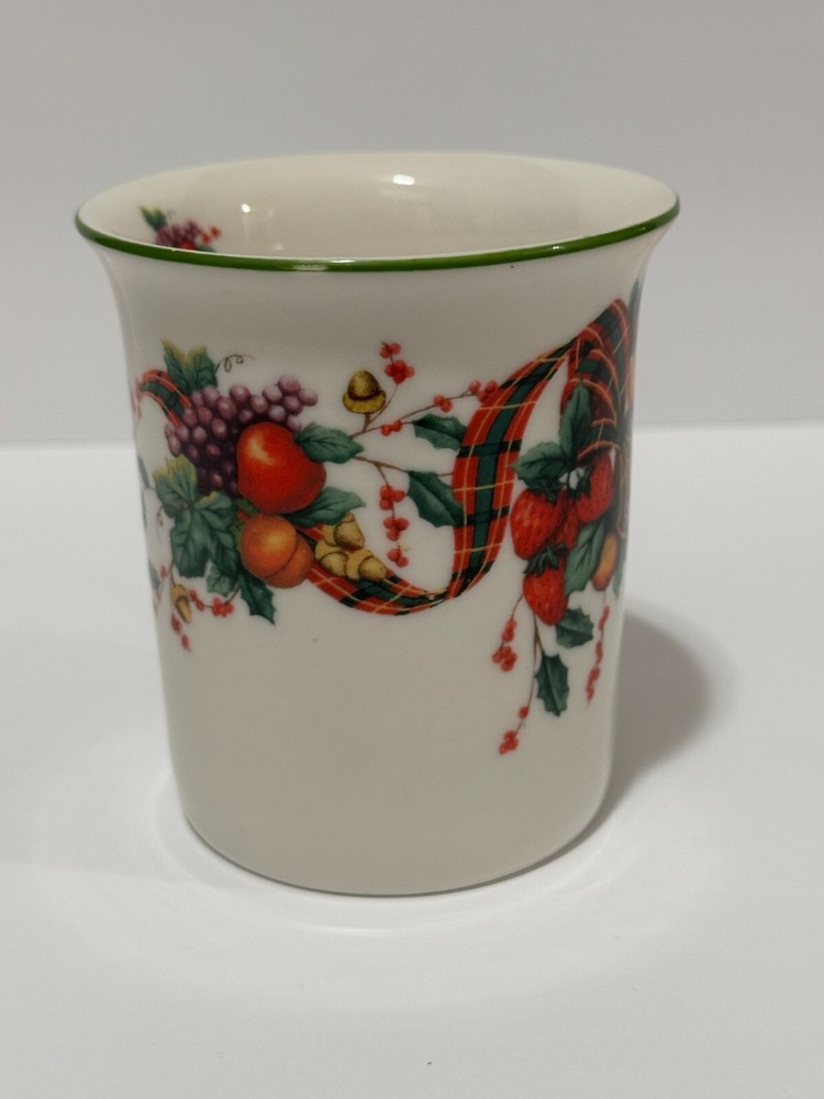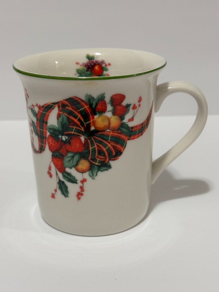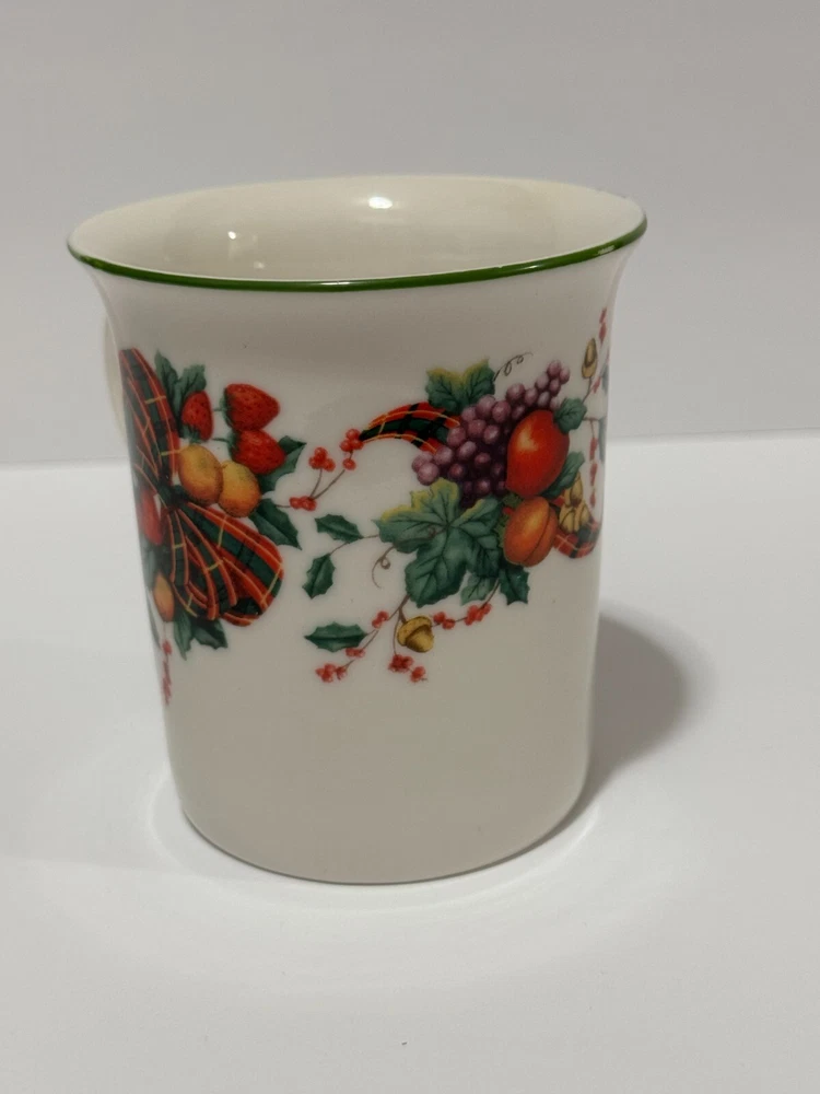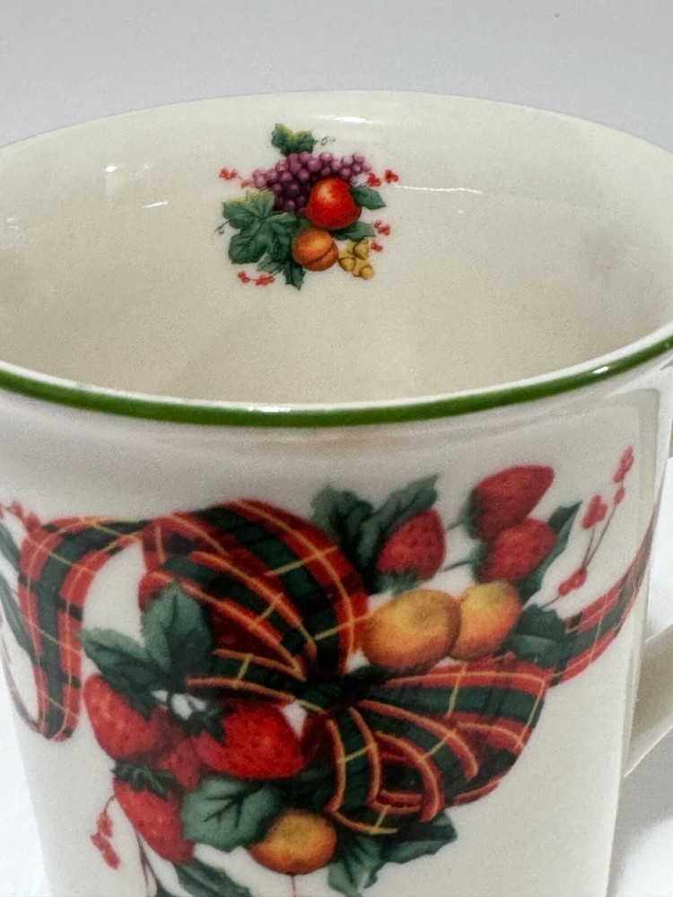 Enjoy your coffee in style with this beautiful William James Stoneware Holiday Coffee Mug. The mug features a festive design of fruit and berries with a tartan ribbon, making it perfect for any occasion. The round shape and medium size of the mug make it easy to hold and use, while the handle adds an extra touch of convenience. Made of high-quality stoneware, this coffee mug is durable and perfect for daily use. The mug has a capacity that is unknown, but it is perfect for hot or cold beverages. This vintage mug was manufactured in China in the 1990s and is an original piece from the William James franchise.