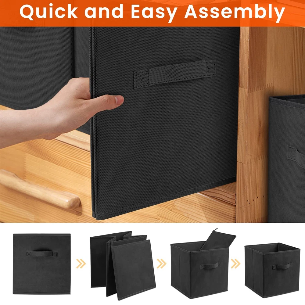 【QUALITY STRUCTURE】These cubby storage bins are made from tough non-woven fabric with excellent sewing to make them last, heavy cardboards added at the sides and bottom to make this storage bins rigid enough to hold a heavy load. 【FIT WITH MOST OF FURNISHING】Measuring 13x13x13 inches, our 8 pack Black clothes storage bins could fit perfectly with most of cube organizer, shelf, closet, from bedroom to playroom to laundry room, to store clothes, linens, toyes, books etc. Great for dorm room. 【EASY GRIP】These fabric storage cubes have two sewn-in handles on the sides for easy room-to-room carrying or removing on a shelf. With the reinfored handles, they could work well as drawers, open-top bins, or storage baskets for shelves. 【COLLAPSIBLE DESIGN】These cube storage bins could be fold flat for compact use when not in use. 【SPACE SAVING】These square storage bin is dorm room essentials and apartment essentials for closet storage and organization, making all rooms neat and clean.