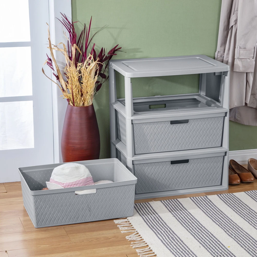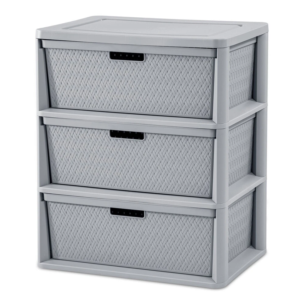 Sterilite Adult Plastic Wide 3 Drawer Cross-Weave Tower Cement: Outside Dimensions: 15 5/8" x 21" x 25 1/4" Single unit option Cement Interior Dimensions at bottom: 18" x 13 3/4" x 7" Timeless and stylish cross-weave pattern in a multi-purpose and versatile storage option for any room in the home Each drawer can become a portable bin by simply removing from frame The integrated carry-through handles allow the bin to be carried with ease Opaque drawers keep contents concealed and clutter controlled Designed with a drawer stop so the drawer will not unintentionally fall out Assembles easily in minutes, without the use of tools BPA-free and phthalate-free On Nov 21, 2024 at 02:27:55 PST, seller added the following information: