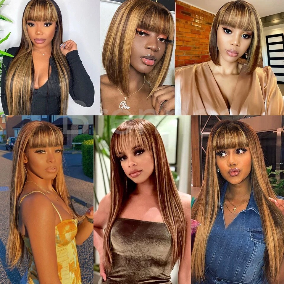 Ombre Human Hair Wigs Highlight Straight Wig With Bangs Glueless Machine Made Wigs 100% Peruvian Human Remy Hair For Black Women Hair Color: Highlight honey blond color Hair Material: 100% Human Hair Hair Density: 150% 180% Density Available for Your Choice Capsize: Medium default Cap color: Medium Brown default Baby Hair and Bleached Knots : Yes Cheap Machine Made Wig Isee Hair Unice Hair Easy To Wear Human Hair Wigs Natural Hairline: Yes