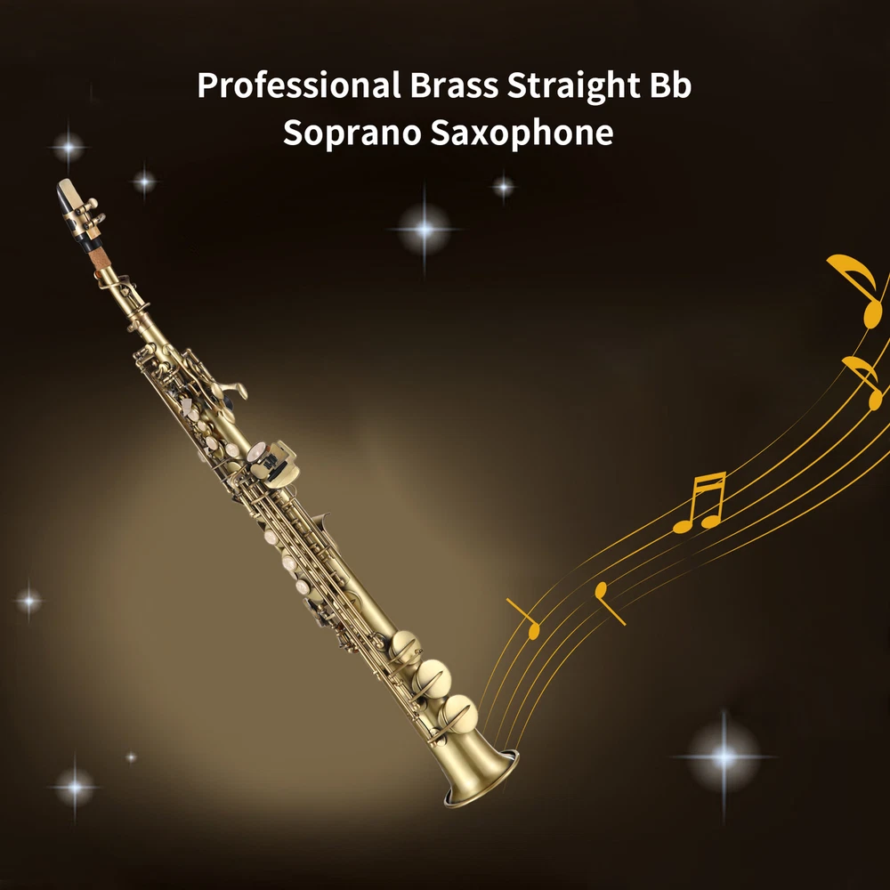 This Bb straight soprano saxophone is suitable for professional saxophonist. Made of high-quality brass material, with antique carve pattern surface , etc. Features: Bb tone straight soprano saxophone, made of high-quality brass with nickel plating. Antique surface design with beautiful carve pattern, fine workmanship and exquisite. B flat straight pipe has stronger resonance and more transparent sound quality. Water-resistant leather pads and bluing steel needle. The position and height of the sound hole opening are accurate, ensuring accuracy in pitch. The keys are easy to press and respond quickly, making it easy to play even the most complex pieces. Including carrying case, mouthpiece, straps, gloves, etc., The instrument is easy to carry, making it perfect for musicians on the go. Cleaning kit including cleaning cloth, cleaning rod, and brush, sufficient accessories to help you effectively clean the saxophone. An excellent instrument for solo playing or accompaniment in Jazz and classical music. Suitable for beginners, soloists, grading test, wind bands, etc Specifications: Material: Brass, with nickel plated Tone: Bb, F, F# Item Size: 705 * 90mm / 27.76 * 3.54in Item Weight: 1415g / 3.12lb Package Weight: 2907g / 6.41lb Package Size: 66 * 25.5 * 15.5cm / 25.98 * 10.04 * 6.10in Package List: I9003 1 * Soprano Saxophone 2 * Sax Necks 1 * Mouthpiece 1 * Mouthpiece Cap 1 * Neck Strap 10 * Reeds 1 * Sordine 3 * Cleaning Cloth 1 * Cleaning Rod 1 * Brush 1 * Pair of Gloves 2 * Case Belt 1 * Carrying Case