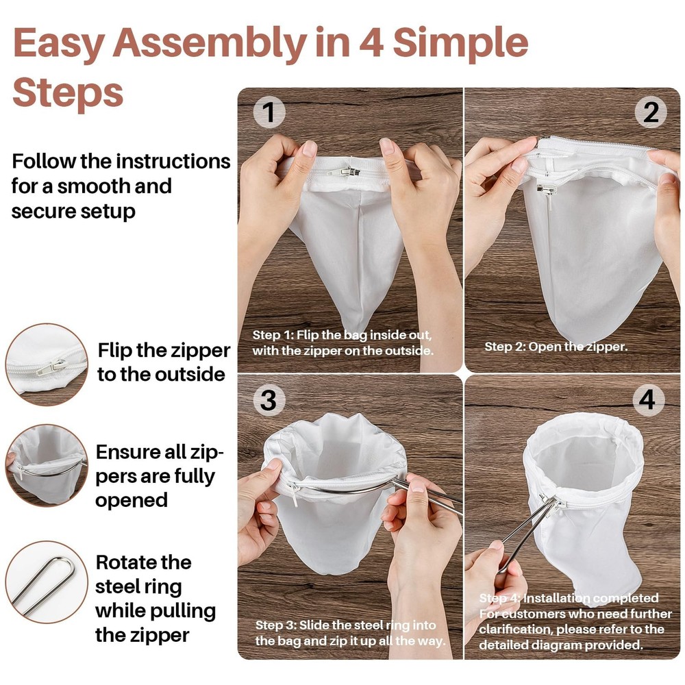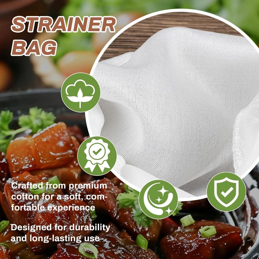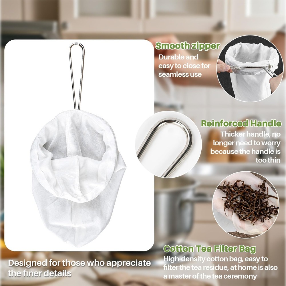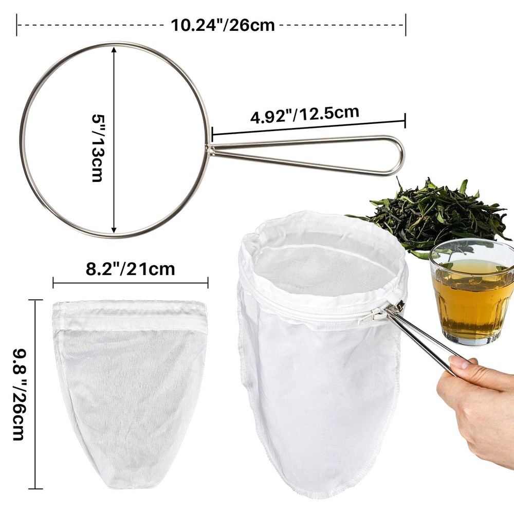 Great for the kitchen and food preparation! Whether you're removing tea leaves, coffee grounds, fruit residues, or even making homemade wine, our straining bag have got you covered. Package Content: 1 x Stainless Steel Handle(diameter of 13cm and a total length of 28cm) 3 x Strainer Bag(8.2 inches wide and 9.8 inches deep) Superior Quality and Design Efficient Filtration: These bags offer excellent filtering capabilities, allowing you to achieve pure and smooth beverages or food. Whether you're removing tea leaves, coffee grounds, fruit residues, thai tea strainer or even making homemade wine, our mesh strainers have got you covered. Easy to Install 1.Flip the bag inside out, with the zipper on the outside. 2.Open the zipper. 3.Slide the steel ring into the bag and zip it up all the way. 4.Installation is complete. For customers who need further clarification, please refer to the detailed diagram provided. Cleaning To clean the bags, simply unzip and remove the stainless steel handle. Rinse the handle under running water and use your favorite cleaning things to clean the bag. Squeeze out excess water, and air dry in a well-ventilated area. Please note that hand washing is recommended for optimal care. BASIC INFORMATION: Each bags measure 8.2 inches wide and 9.8 inches deep (21 cm x 25 cm). The stainless steel handle has a diameter of 5 inches(13 cm) and a total length of 10.24 inches(26 cm). Each set includes three high-quality multi-use cotton bags and one stainless steel handle.Can meet your daily use needs COFFEE STRAINER: (Superior Quality and Design) High-density cotton, ensuring a soft and porous texture with visible mesh patterns. (Efficient Filtration) Whether you're removing tea leaves, coffee grounds, fruit residues, or even making homemade wine, our cheese cloths have got you covered. VERSATILE APPLICATIONS: Perfect for home use, as well as coffee shops, cake shops, and tea houses, our mesh strainer bag caters to a wide range of needs. Whether you're filtering tea dregs, soybean residue, milk, nut, yogurt, or herbal medicine, these bags will be your reliable companion CLEANING MADE EASY: To clean strainers for kitchen, simply unzip and remove the stainless steel handle. Rinse the handle under running water and use your favorite food cleaning fine goods to clean the cloth strainer. Squeeze out excess water, and air dry in a well-ventilated area. Please note that hand washing is recommended for optimal care CONVENIENT AND LONG-LASTING: The zippered design makes it easy to install and remove the fine strainer cloth, saving you time and effort during cleaning. Widened stainless steel handle