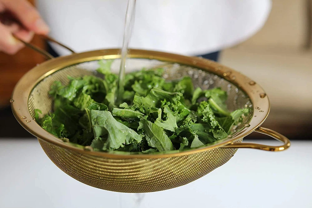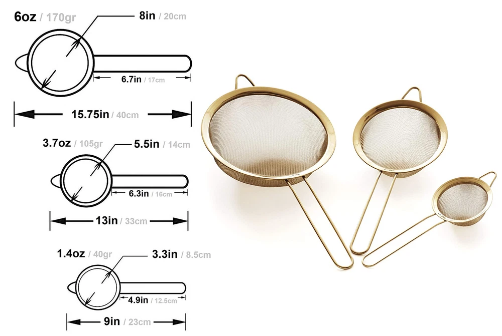 HIGH QUALITY 304 STAINLESS STEEL STRAINER SET - made from professional quality and premium 304 stainless steel. They are built to last as they are much stronger, resistant, durable and anticorrosive than cheaper 201 stainless steel and plastic strainer alternatives 3.3″, 5.5″ & 8″ SIZES WITH FINE TWILL MESH - organise yourself with our professional quality kitchen strainer set of 3, 3.3″,5.5″ and 8″. Our unique strainers, larger than average sizes are versatile for a wide range of needs in the kitchen. Each strainer features fine twill mesh and a sturdy handle, so they can be hung or stacked for easy storage TITANIUM ECO-FRIENDLY AND STYLISH GOLD COLOR FINISH - our kitchen strainers feature a titanium Physical Vapour Deposition eco-friendly coating. The PVD applied to all our food strainers is the highest quality coating and the entire process is environmentally harmless VERSATILE FOR USE IN THE KITCHEN - whether you need to drain, strain or sieve then you will achieve excellent results with our kitchen strainers. Pasta, vegetables, fruits, rice, quinoa, almond milk, smoothies, flour, sauces, gravy and more can be prepared to perfection with one of our strainers. Food won’t get stuck under the rim making it easy and convenient to clean THE ULTIMATE MULTIPURPOSE KITCHEN UTENSIL WITH 100% SATISFACTION – this strainer set has been tested in the SGS laboratories and the PVD Coating is dishwasher safe (certified test of 25 cycles), for best long-lasting results we advise to easily wash by hand. Our fine mesh strainer set is built to last and won’t break. So you can purchase and use at home with complete peace of mind