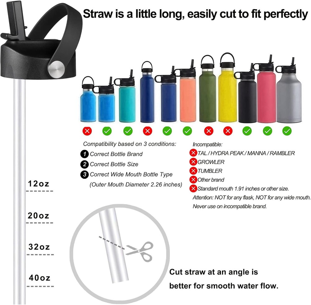 Straw lid for Hydroflask Wide Mouth, Lid Flexible Handle Fits black Product Features TOP DESIGN : The wide mouth flexible straw lid is designed with soft and super comfortable flexible handle strap,easy to grasp and carry your favorite wide mouth water bottle wherever you go. Flip straw top lid allow one-handed drinking for adult and kids,a high-flow rate to meet your daily hydration on-the-go. EASY TO USE : Straw lid in flip design, easy to open and close by one hand. Straw cap makes hydration an easy thing with smooth flow. Good replacement lids with straw for your wide mouth and let you enjoy routine hydration and drink more water. HIGH QUALITY : Easy sipping straw mouth makes straw lid a perfect straw cap for wide mouth water bottle. Great choice straw lid to upgrade your wide mouth 18oz 32oz 40oz. LID IN BEST VALUE : Straw lid compatible with 18 oz 20 oz 32 oz 40 oz wide mouth. Straw lid comes with 2 separate straws and 1 straw cleaner. REMIND: Straws are a bit long, easily cut straws by scissors for different wide mouth water bottle. Current straws fit 40 oz perfectly, need to shorten straws a little for sizes 18 oz 20 oz 32 oz wide mouth. CUSTOMER ORIENTATION : BPA free. All materials have passed the test of international authority. You can buy it with complete confidence. And we are happy to provide 100% money back if you are not fully satisfied with the straw lid. NOT for other brand or sizes unmentioned. Shipping: Shipping is complimentary within the lower 48 US States. We Do Not Ship to PO/APO Boxes, HI or Alaska We Do Not Ship Outside of the Continental US All items ship within 24-72 hours of Payment For large items that require Freight shipping a valid phone number is required to call and schedule your delivery Terms of Sale and Feedback: Feedback is extremely important to us and eBay If you are satisfied with our transaction, please take a moment to leave Positive Feedback. YOUR Satisfaction is our #1 Priority! If there are any issues, PLEASE contact us BEFORE leaving a neutral or negative rating so that we may resolve any concerns. We PROMISE we can make you happy if you give us a fair chance. Returns / Concerns: All items qualify for returns within 14 - 30 days of receipt. Buyer is responsible for return shipping on any item that is not damaged Please be sure this is an item you want before making your purchase. Customer Satisfaction is our TOP priority! All items are IN STOCK at time of listing. Inventory on eBay changes constantly and it is impossible to maintain a perfectly accurate count of all items. Please do not penalize us if we have to issue you a refund! Thank You For Your Business!
