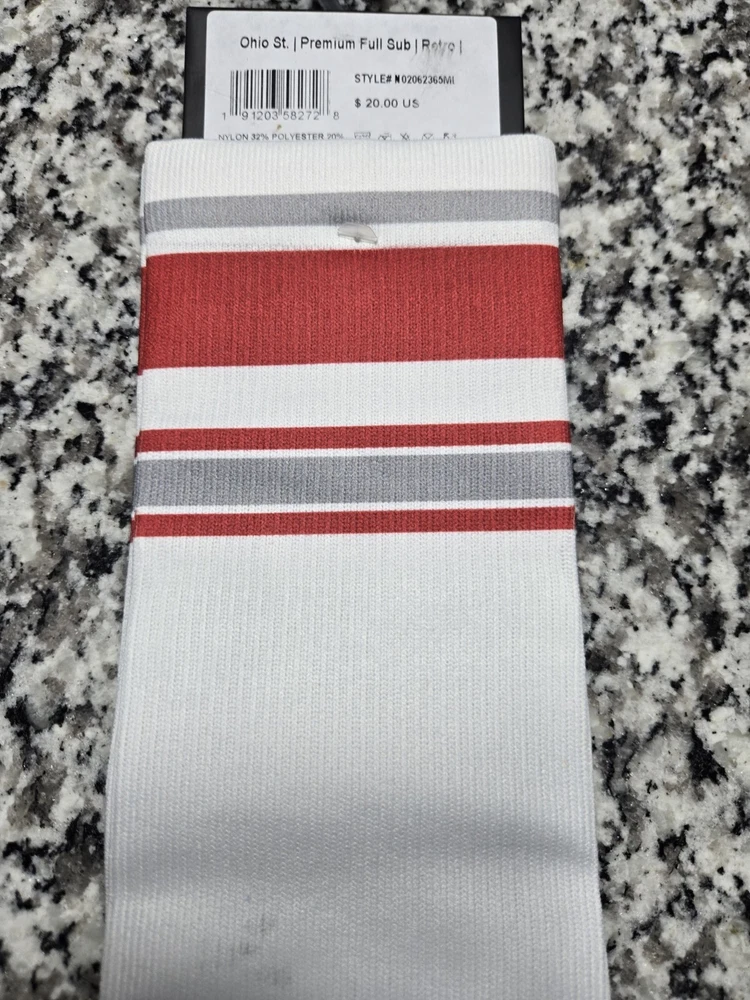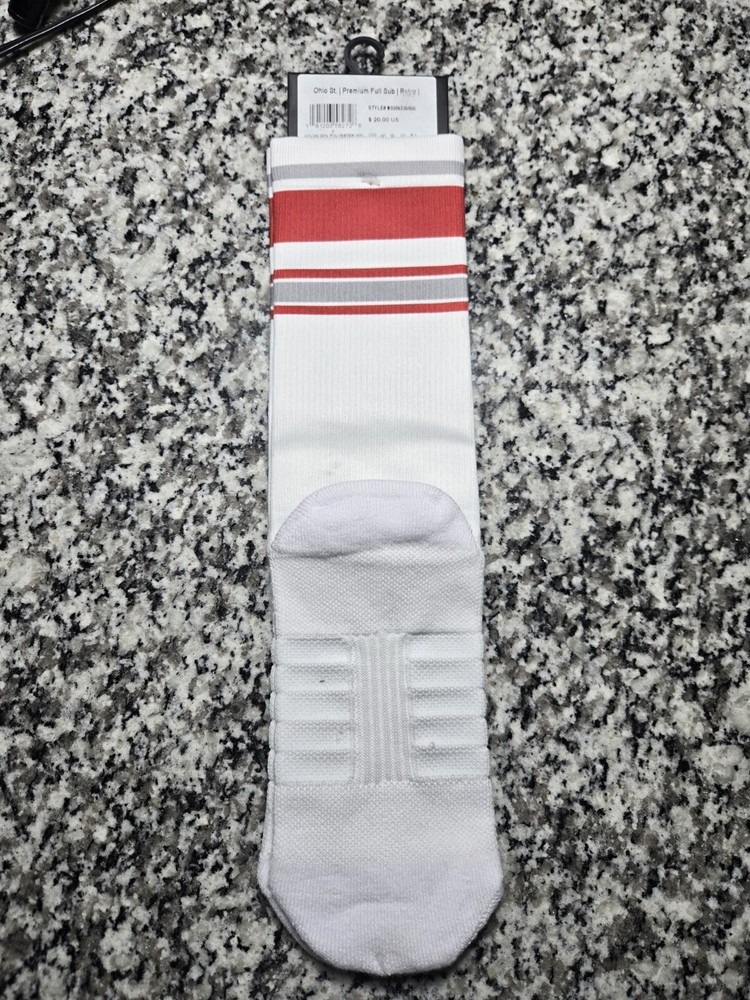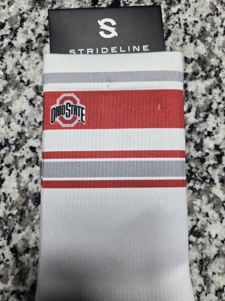 Elevate your game day attire with these Strideline Ohio State University Buckeyes Retro Tube White Socks. Decked out in the iconic Ohio State logo, these mid-calf crew socks are designed to show off your team pride. Crafted for both comfort and durability, they feature a cushioned sole and moisture-wicking technology to keep your feet dry, regardless of the weather. Ideal for any casual occasion or your next gym workout, these socks are made from a soft cotton blend and are machine washable for easy care. The white color ensures they'll pair well with any outfit, while the size L (fits shoe sizes 8-12) ensures a snug and comfortable fit for most. Whether you're a die-hard fan or just love the look and feel of these retro tube socks, they're a versatile addition to your wardrobe.