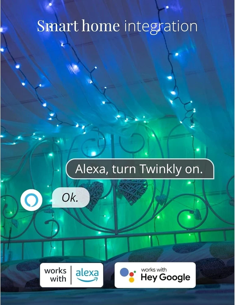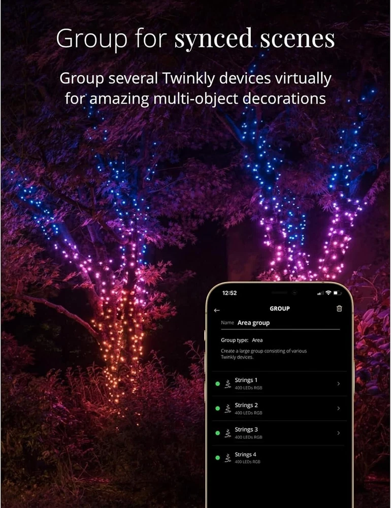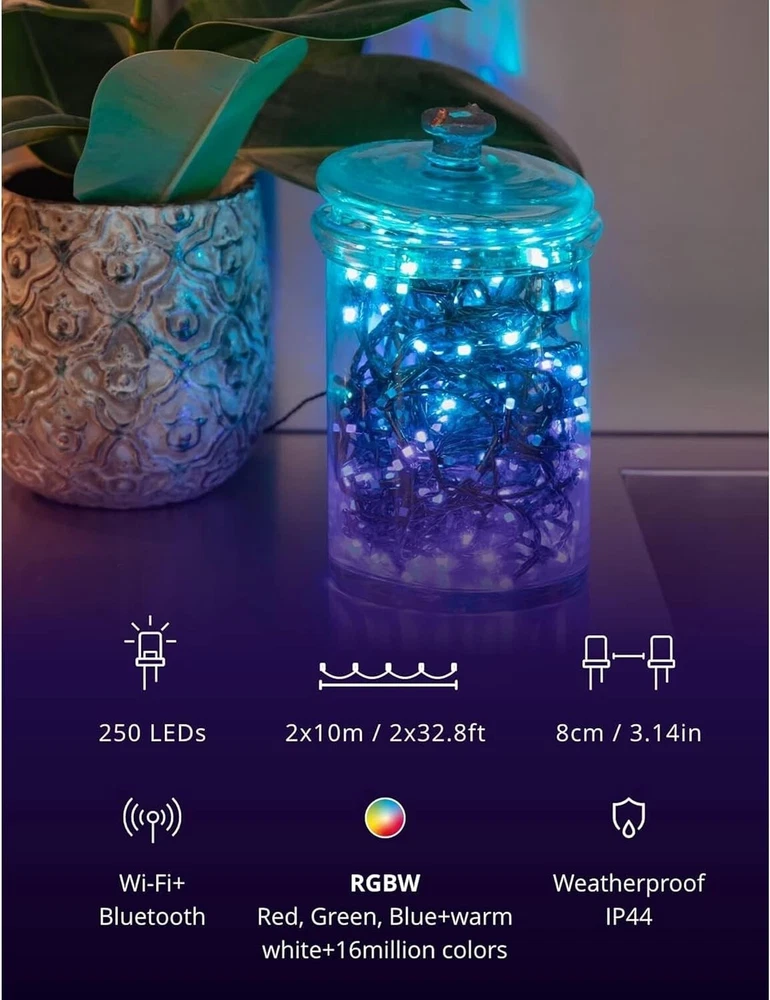 Strings 400 LED RGB+ White, LED Light String, in- and Outdoor Smart Multicolor LED Lights, Compatible with HomeKit, Alexa, and Google Home, Gaming, IP44, App Control, Green Wire, 105ft IN- AND OUTDOOR LIGHT STRING: 105 feet LED light string for ambient garden, patio, yard, or balcony lighting or as a Christmas decoration; 16 M+ colors and a choice of various warm or cool white shades CUSTOMIZED EFFECTS: enjoy a variety of customizable presets or create your own light show by choosing from over 16 million colors with the App; additionally, this version allows you to choose between warm and cool white light WATERPROOF: this LED light string is weather-resistant with IP44 certification, so they can be used as outdoor Christmas lights; create optimal lighting for memorable celebrations, like weddings, parties, barbecues, birthdays, or Christmas GAMING-READY: this outdoor LED light string is for all content creators, gamers, and streamers; it is fully integrable and compatible with the Homey app, Razer Chroma RGB, and OMEN Light Studio to ensure you an optimal gaming experience SMART: turn the LED lights on and off, dim them, or apply a timer in seconds using the app; it is also fully compatible with the voice assistants Alexa, Google Assistant, and Apple HomeKit to allow you to integrate with your smart home