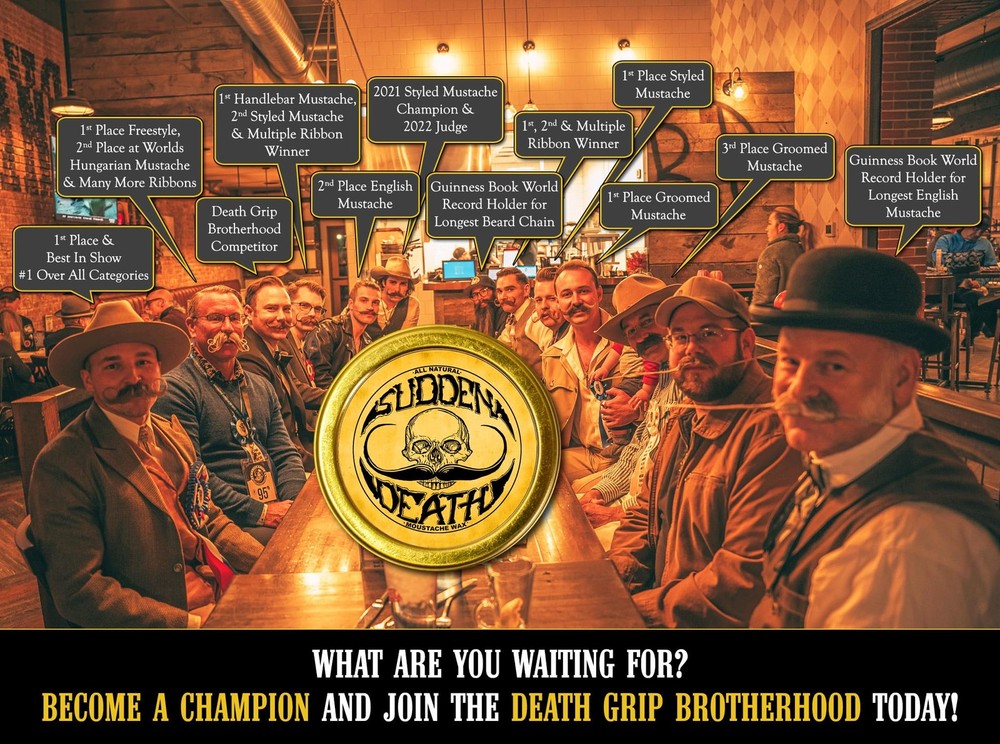 Mustache Wax Strong Hold Grooming For Men | Sudden Death Moustache & Beard Wax 1oz Tin | Perfect For Handlebar Mustaches By Death Grip | No Heat Source Required Seriously Sudden Death - The Mustache Wax You Want On The Go - Fast Strong On Point - No Heat Source Required Strong Hold Mustache Wax - Hold those unruly mustash whiskers in place for up to 8 plus hours even in hot humid cold or windy weather - much better than oil or balm Lasts A Long Time - 1oz metal tin mustache wax can last up to 4 months of daily usage - non scented. Versatile - This wax is perfect for any mustache style, whether you're going for a classic handlebar, a modern walrus, or anything in between. Handcrafted Made In Colorado USA - All-natural ingredients: Made with a blend of natural beeswax, lanolin, jojoba oil, and shea butter, this wax is gentle on skin and hair, while still providing a strong hold. Sudden Death Mustache Wax Promise - If you are not satisfied for any reason we will your money Easy To Use - The wax comes in a convenient 1 oz tin that fits easily in your pocket or grooming kit, and is easy to apply with your fingertips or a small brush. Plus, it washes out easily with just soap and water, so you can switch up your style as often as you like. CAUTION FOR SERIOUS MOUSTACHES ONLY If you are a man looking to take his mustache game to the next level Sudden Death is the mustache wax for you. The right ladies will take notice & people will talk to you regularly about your stylish mustash grooming skills. NO hairdryer or a heat source is necessary to warm the sudden death mustache wax . Just like the name, it's SUDDEN use with a strong hold that won't disappoint. STRONG HOLD - Our mustache wax has a pliable semi-sticky tacky glue like wax feel that holds those unruly stash whiskers in place for up to 8+ hours. Much better than beard oil or balm. Of course, every mustache is unique. For those in warmer climates like Arizona or Florida this is the serious hold moustache wax you have been looking for that does NOT “pill" up. LASTS A LONG TIME Sudden Death mustache wax is known to last some of our customers up to 4 months of daily usage. Perfect for men grooming brown, black, grey or white handlebar mustaches. MADE IN THE USA Our handcrafted 100% all-natural & cruelty-free ingredients are safe on your skin & completely chemical-free. Our products are produced in Woodland Park, Colorado USA! Sudden Death moustache wax is founded by a US Veteran. Sudden Death moustache wax is a perfect combination of beeswax, pine rosin, organic shea butter & coconut oil! Sudden Death Mustache Wax Promise - If you are not satisfied for any reason we will your money. Shipping We offer FREE shipping on all orders! We ship within Three business days of payment, usually sooner. We use a selection of shipping services such as UPS, FedEx, USPS etc. We only ship to the lower 48 states, no APO/FPO addresses or PO Boxes allowed. Local pickups and combined shipping options are not provided at this time. Return You can return a product for up to 30 days from the date you purchased it. Any product you return must be in the same condition you received it and in the original packaging. Please keep the receipt. Payment We accept payment by any of the following methods: PayPal Please pay as soon as possible after winning an auction, as that will allow us to post your item to you sooner! Feedback Customer satisfaction is very important to us. If you have any problem with your order, please contact us and we will do our best to make you satisfied. Contact Us If you have any queries, please contact us via ebay. We usually respond within 24 hours on weekdays. Please visit our eBay store to check out other items for sale! Thank you for shopping at our store.