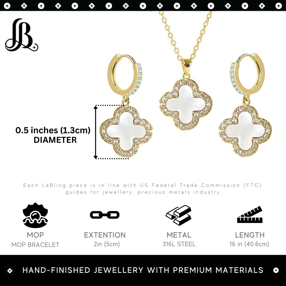 Studded Clover Necklace with Studded Hoop Earrings for Women | Designer Jewelry Set| Lovely Gift for Women Product Details Color: White Brand: LaBling MPN: Does not apply UPC: Does not apply EAN: Does not apply Department ‏ : ‎ womens Date First Available ‏ : ‎ June 23, 2024 Brand, Seller, or Collection Name: LaBling Metal: Stainless Steel Material: Stainless Steel Gem Type: Pearl Clasp: Lobster Clasp Certificate type: Certificate of Authenticity