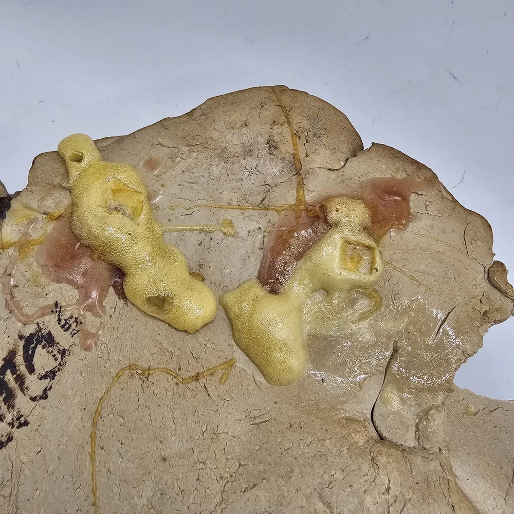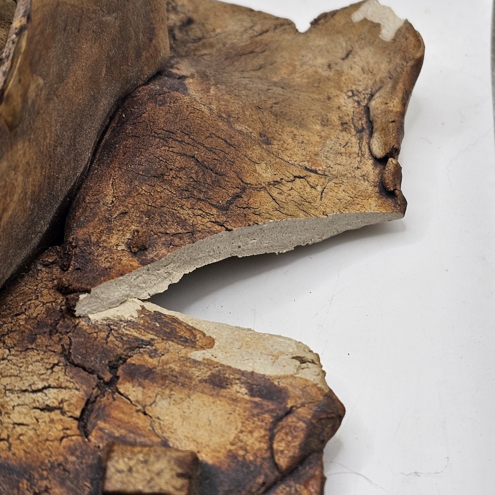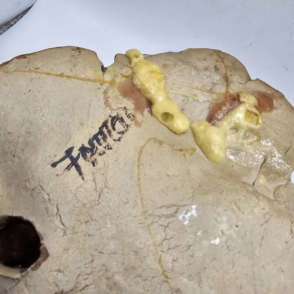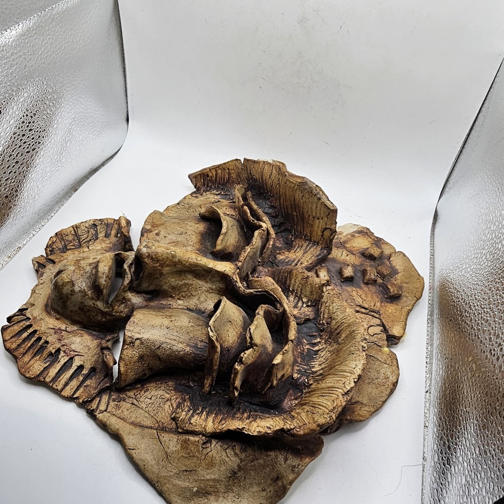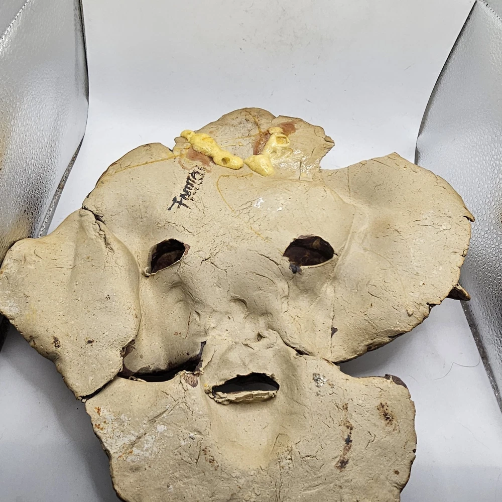 This is a unique and one-of-a-kind Studio Art Pottery Face Mask Art signed by Farrell. It is a weirdo estate find that features a 3D sculpture in the form of a face mask. The mask is made of clay and is an example of pottery production technique. It is a perfect addition to any art collection and a great conversation starter. There are chips. May be a larger one on top... not sure if that was on purpose. See photos for imperfections sold as is