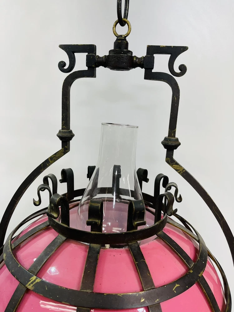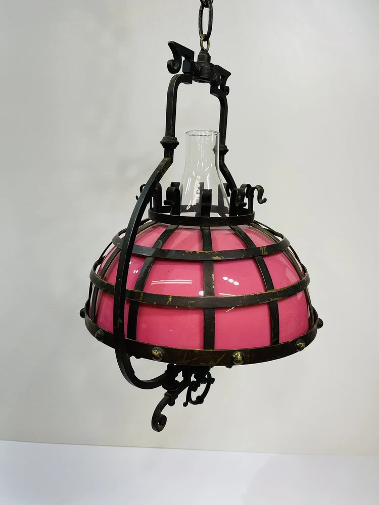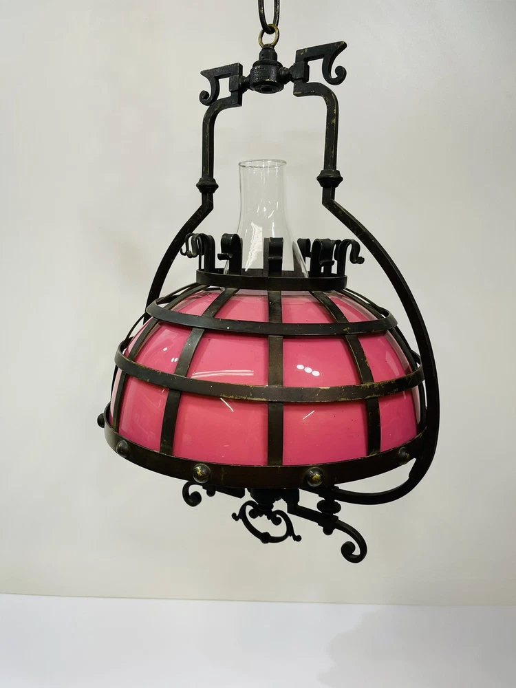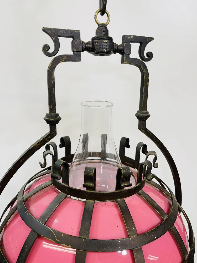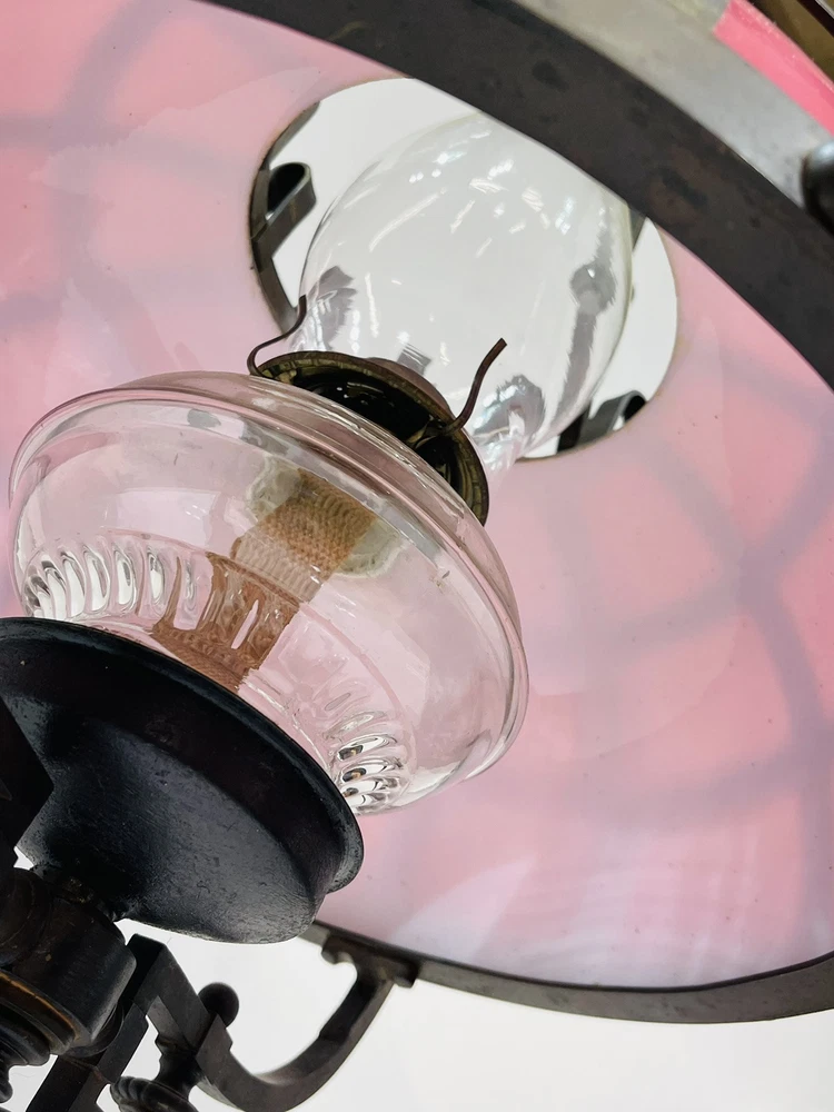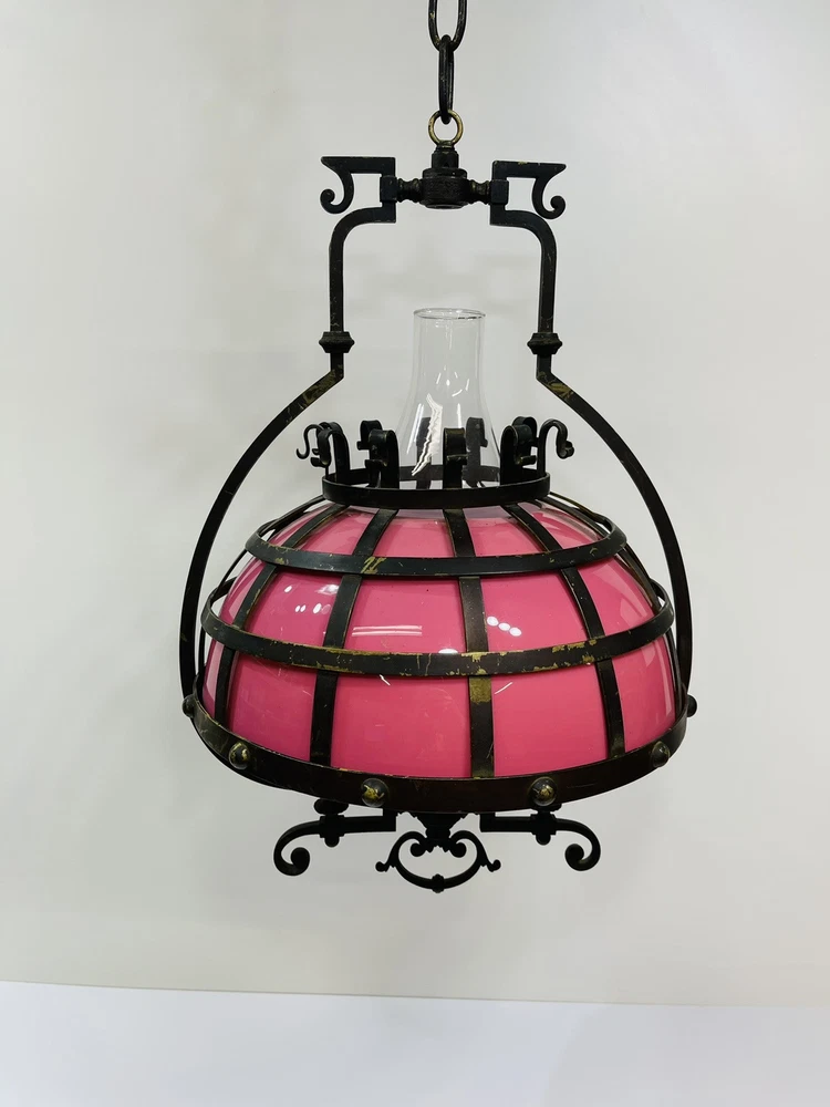 This stunning ornate antique chandelier from the pre-1890s features a large size and a beautiful pink glass shade, making it a standout piece in any space. Crafted from cast brass, this elegant chandelier exudes a sense of vintage charm with its intricate details and antique design. The 1881 brass metal hanging oil lamp adds a touch of historical significance to this unique light fixture, perfect for adding a touch of luxury and sophistication to any room. An overall very good condition for its age, there are no chips or cracks in the glass, but it does need cleaning. Patented, December 15, 1881, Engraved in the other side is electric slide chandelier. The glass oil holder has a uranium glow. The chandelier will be double boxed, insured, and signature confirmation will be added to ensure it’s safe delivery.