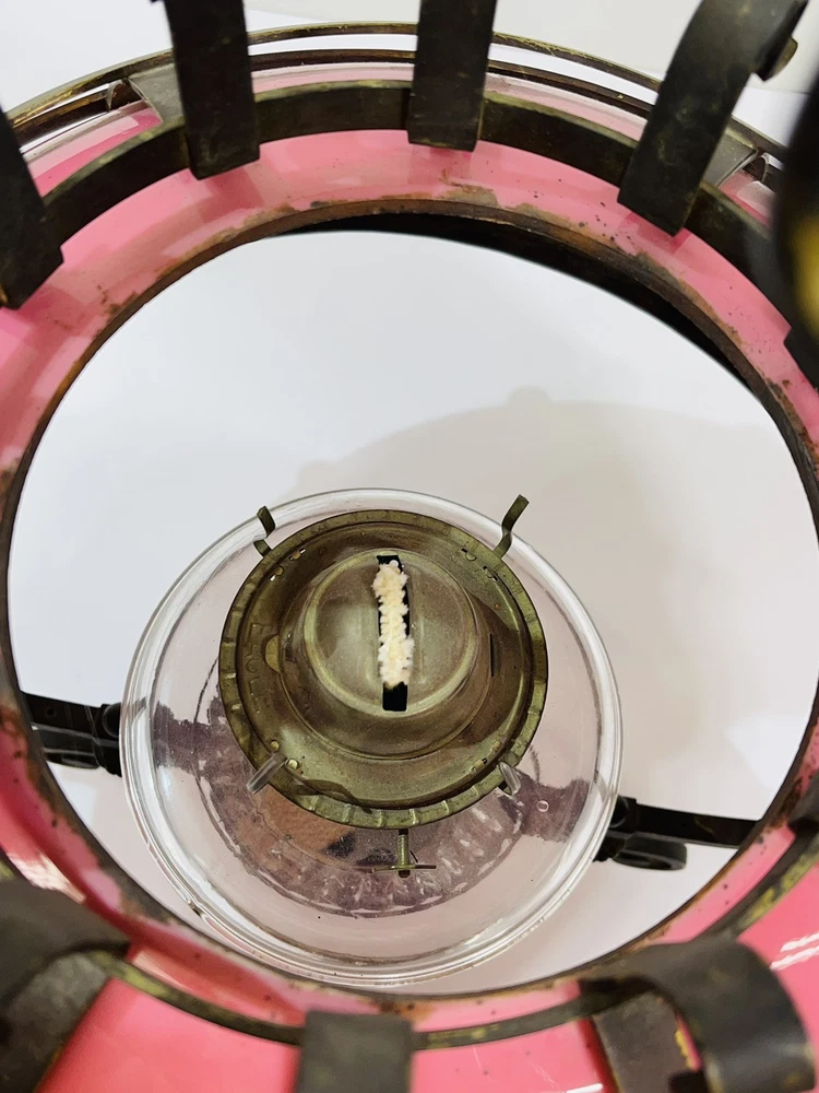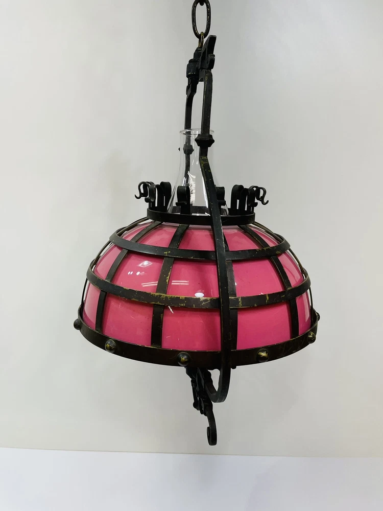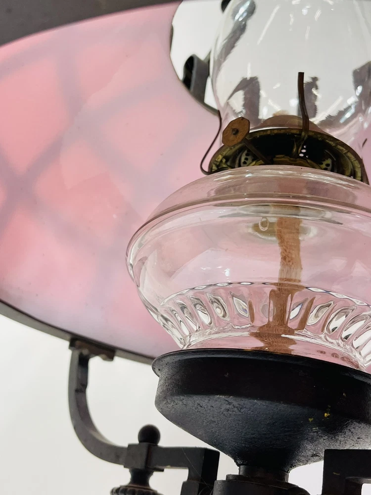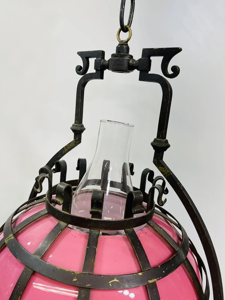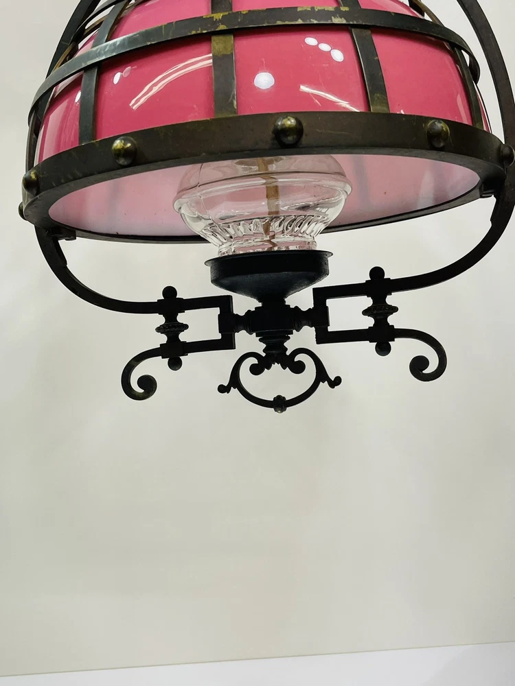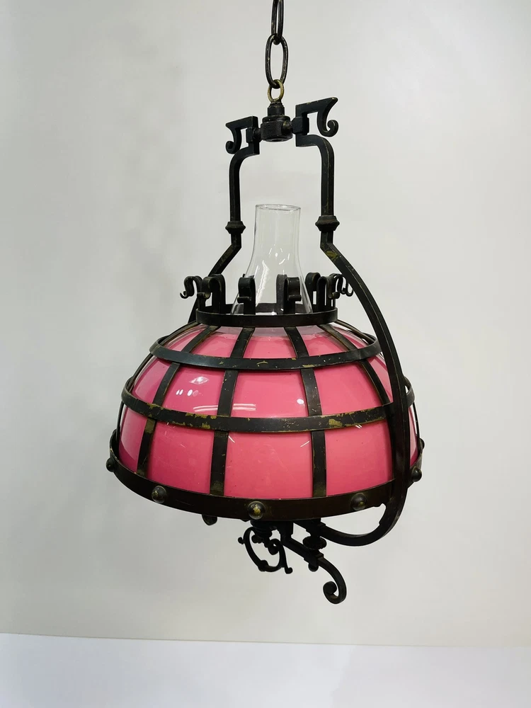 This stunning ornate antique chandelier from the pre-1890s features a large size and a beautiful pink glass shade, making it a standout piece in any space. Crafted from cast brass, this elegant chandelier exudes a sense of vintage charm with its intricate details and antique design. The 1881 brass metal hanging oil lamp adds a touch of historical significance to this unique light fixture, perfect for adding a touch of luxury and sophistication to any room. An overall very good condition for its age, there are no chips or cracks in the glass, but it does need cleaning. Patented, December 15, 1881, Engraved in the other side is electric slide chandelier. The glass oil holder has a uranium glow. The chandelier will be double boxed, insured, and signature confirmation will be added to ensure it’s safe delivery.