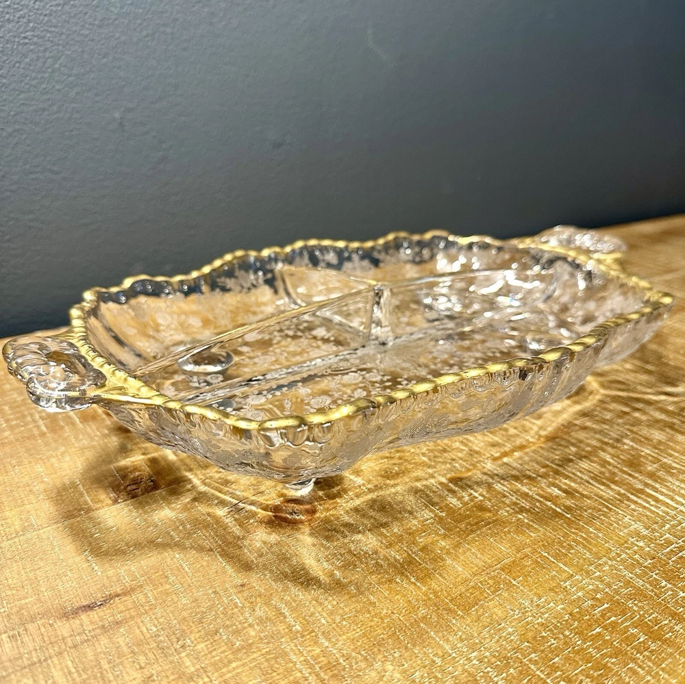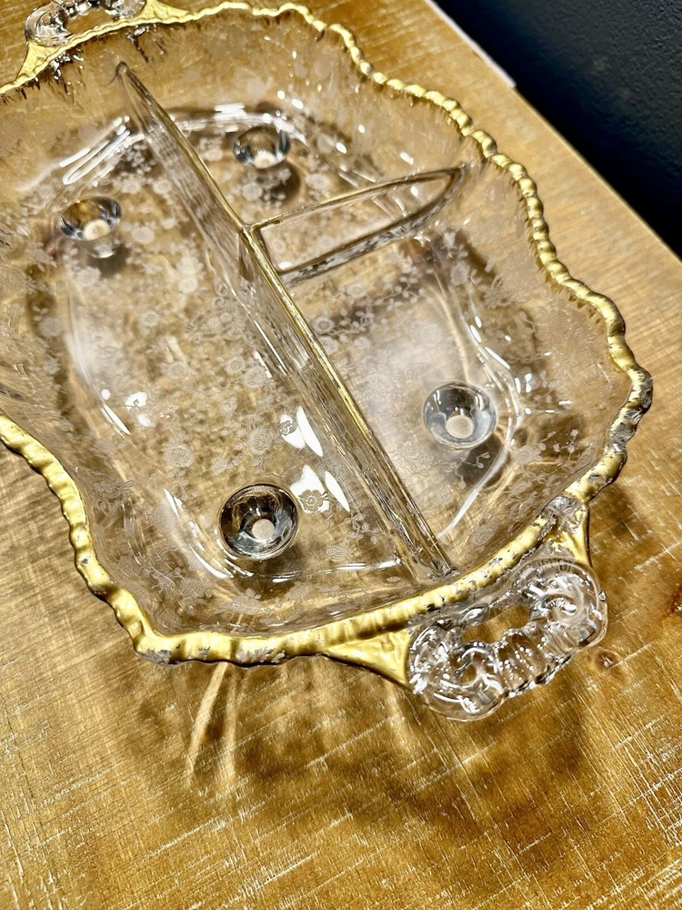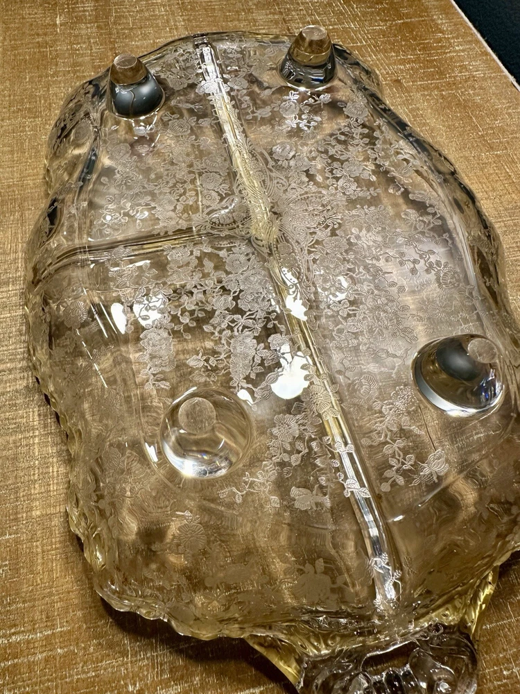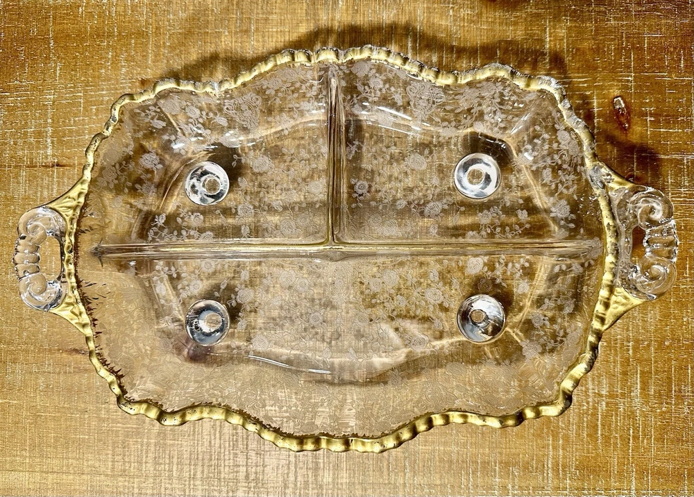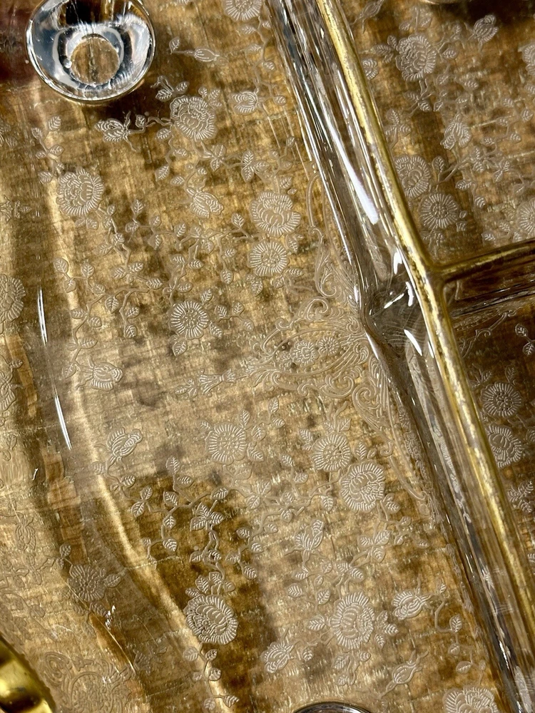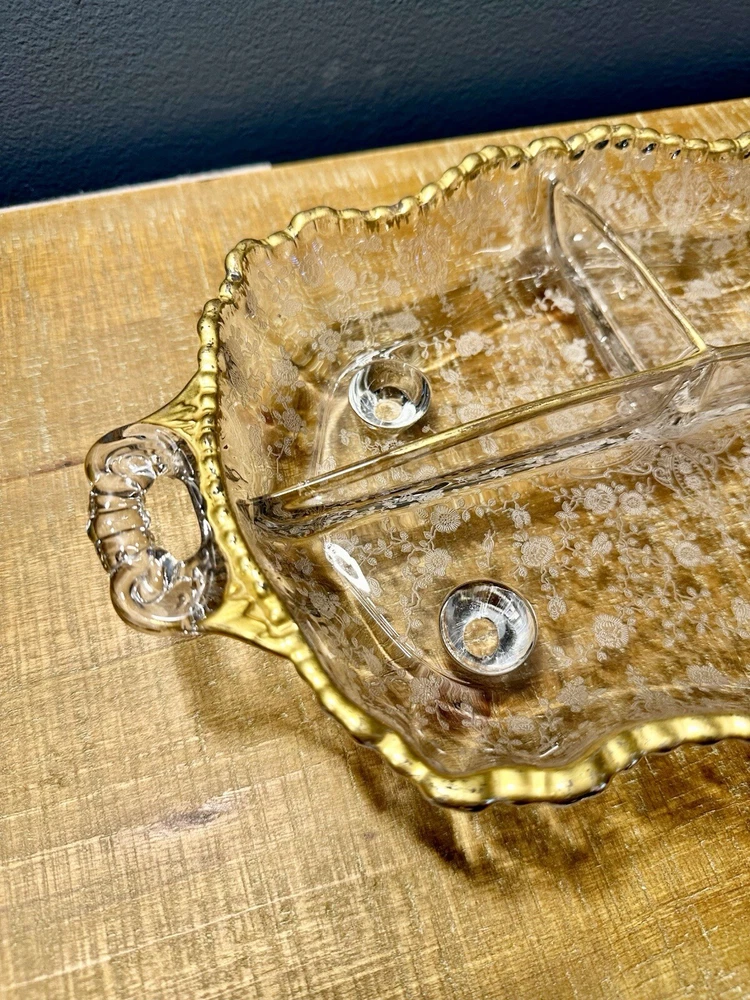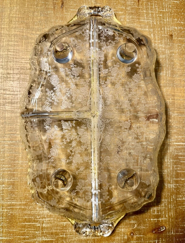 See photos for any imperfections. This vintage Cambridge Glass relish dish is a stunning addition to any collection. The dish features a beautiful rose point pattern on a clear glass base, with a glossy finish. It has three compartments, perfect for displaying candy or other small items. The dish is handmade and has a studio-crafted production technique, making it a unique and elegant piece. The antique dish is unboxed and has a rectangular shape, with a flower theme and art deco style. It is a original, licensed reproduction from the Rose Point product line and has a production technique of elegant glass. The dish is perfect for use as a candy dish or for serving small items at your next dinner party. Add this beautiful, one-of-a-kind piece to your collection today!