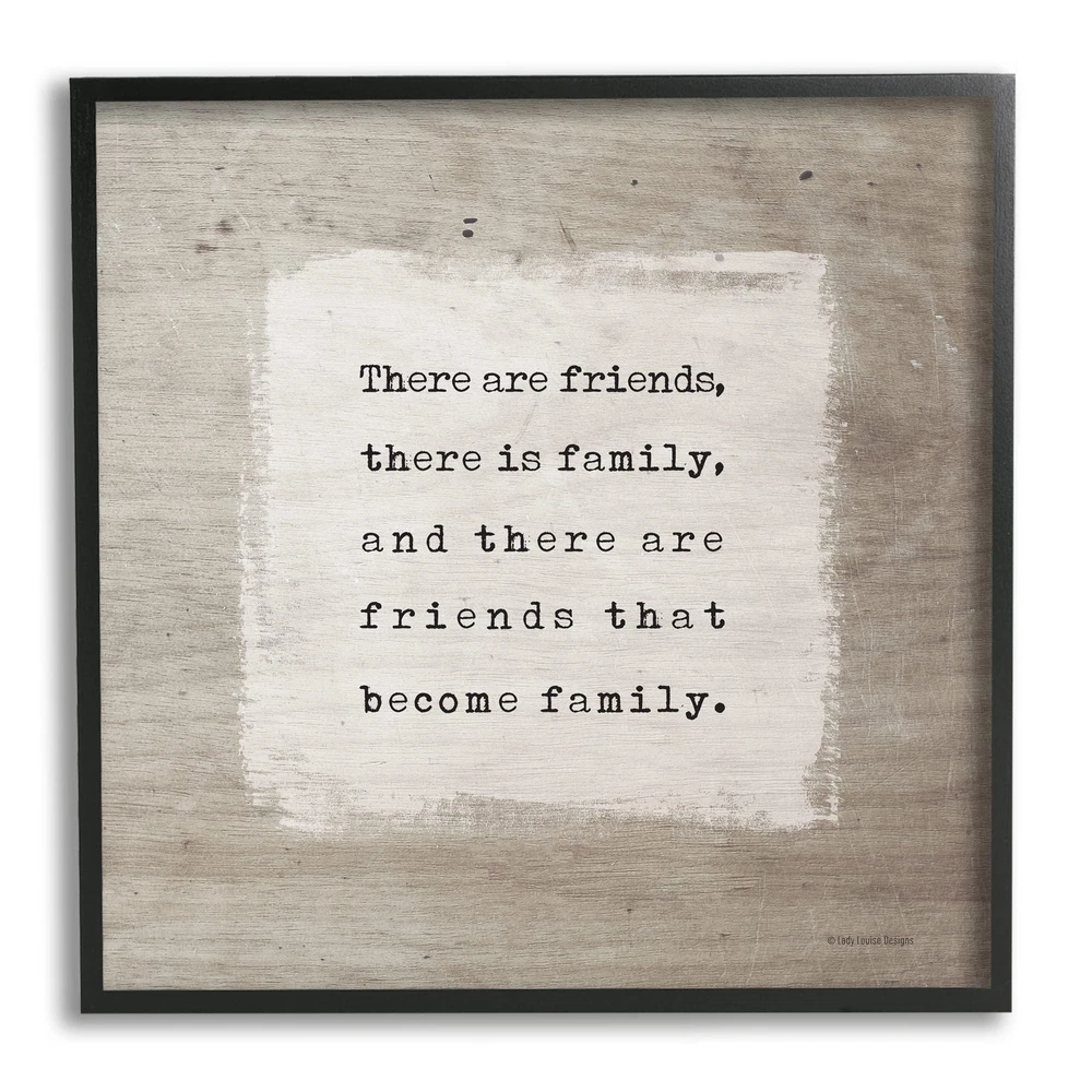 Stupell Industries Found Family Meaningful Friendship Framed Wall Art, Design by Lady Louise Designs Product Details Color: Black Framed Size: 17 x 17 Brand: Stupell Industries UPC: 197081377272 EAN: 0197081377272 MPN: Does not apply UPC: 197081377272 Manufacturer: Stupell Industries Number of Items: 1 Brand Name: Stupell Industries Material: Wood Frame Material: Wood Item Weight: 3 Pounds Size: 17 x 17 Item Dimensions L x W: 17"L x 1.5"W Seasons: No Season Orientation: Square Color: Black Framed Item Shape: Square Pattern: Rustic Style: Rustic Theme: Inspirational Quotes & Sayings Wall Art Form: Art Print Room Type: Bedroom, Living Room, Dining Room, Kitchen, Kids, Nursery, Bathroom, Home Office Mounting Type: Wall Mount Frame Type: Framed Is Framed: Yes Special Features: Framed Dimensions: 17 x 1.5 x 17 Framed Wall Art is Ready to Hang - No Installation or Hardware Needed. For Easy Set Up Lean or Layer Artwork on Shelf or Against Wall. Artwork Relates To: Rustic, Typography, Family, Friends, Found Family Our giclee prints are carefully mounted on a durable MDF backing, and then perfectly finished in a 1.5 inch thick woodgrain frame. Mounted frame colors include black, gray farmhouse and white. Made In USA. Design by Lady Louise Designs Our Framed Giclee Wall Art adds a touch of class to any space in your home or office. Frames are available in three alluring styles: black, gray farmhouse and white. Our textured artwork will add more depth and dimension to any space. Each piece is mounted with a 1.5 inch thick wood grain frame that is ready to hang! Looking for a statement piece? We have oversized artwork available.