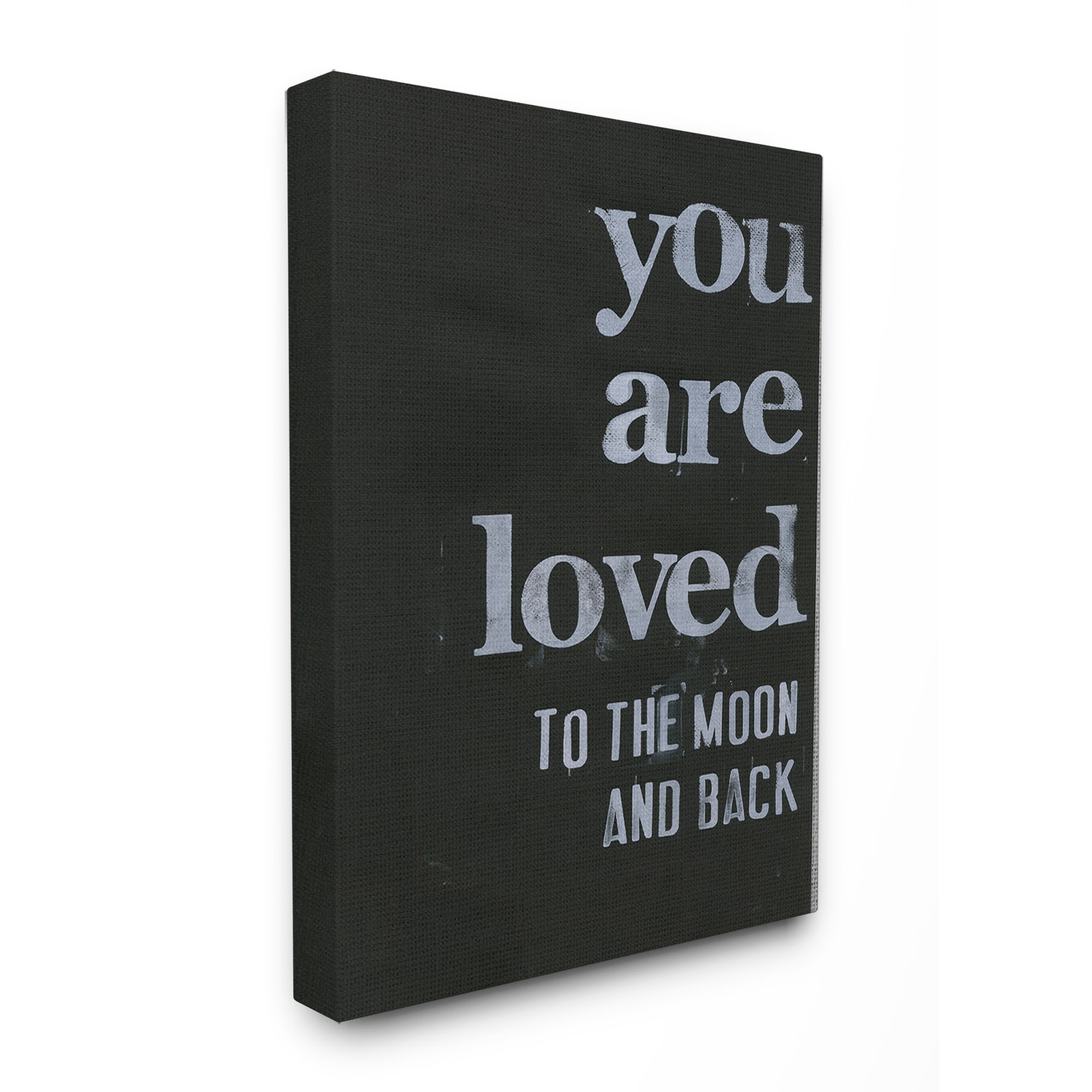 Keep your design simple with this black and white 'You Are Loved to the Moon and Back' wall art. High-quality inks on a hand-cut, stretched canvas make this a quality piece.Rectangular stretched canvas artHigh-quality inksCanvas is hand cut and stretched over a durable internal wood frame for a strong constructionContemporary, unframed designMedium size fits well on wallsMeasures 16 inches x 1.5 inches x 20 inchesMade in the USA Free Shipping Over $49.99* Details Stupell 'You Are Loved To The Moon And Back' Stretched Canvas Wall Art Product Description: Keep your design simple with this black and white 'You Are Loved to the Moon and Back' wall art. High-quality inks on a hand-cut, stretched canvas make this a quality piece. Rectangular stretched canvas art High-quality inks Canvas is hand cut and stretched over a durable internal wood frame for a strong construction Contemporary, unframed design Medium size fits well on walls Measures 16 inches x 1.5 inches x 20 inches Made in the USA