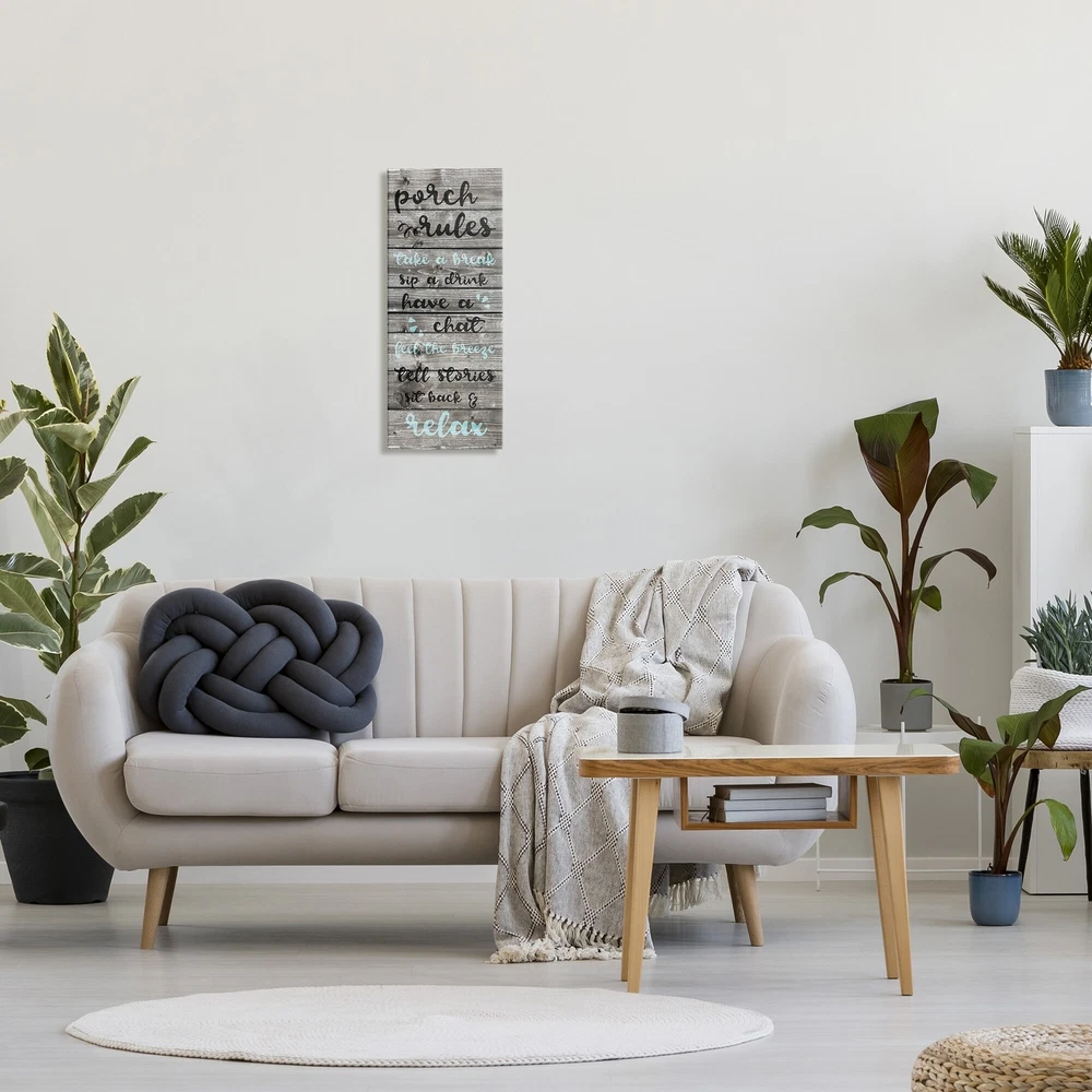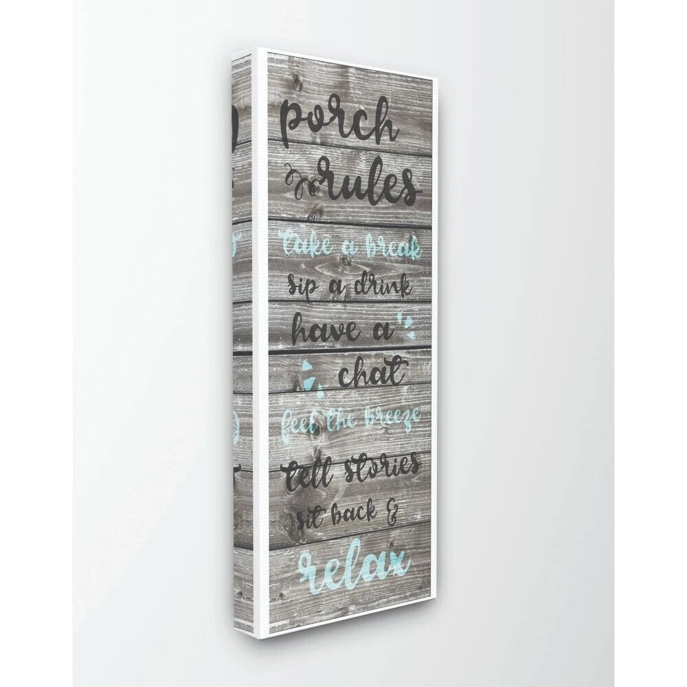 Install this canvas wall art on your porch and let your friends and family know to put their feet up and relax. Stretched over a wooden frame, this ready-to-hang wall art offers effortless display.Features:Period: ModernismShape: SpecialtyOrientation: VerticalSubject: Typography and SymbolsStyle: ModernMeasures 10 inches wide x 24 inches long x 1.5 inches deep Free Shipping Over $49.99* Details Stupell 'Porch Rules Rustic Blue Sit Back and Relax' Stretched Canvas Wall Art - Product Description: Install this canvas wall art on your porch and let your friends and family know to put their feet up and relax. Stretched over a wooden frame, this ready-to-hang wall art offers effortless display. Features: PeriodModernism ShapeSpecialty OrientationVertical SubjectTypography and Symbols StyleModern Measures 10 inches wide x 24 inches long x 1.5 inches deep