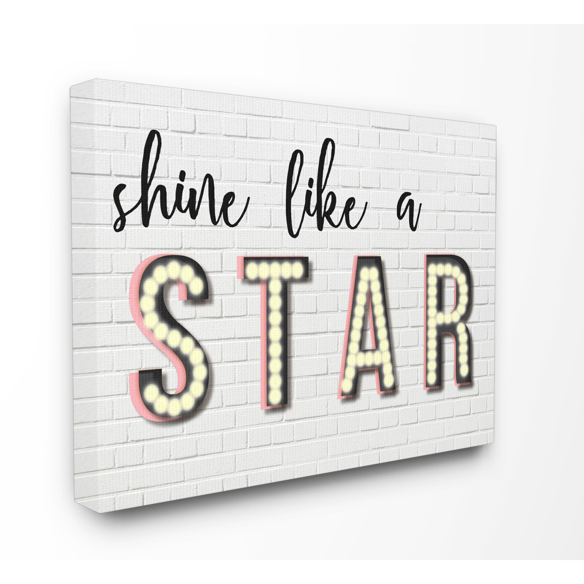 Decorate your walls with the darling colors and designs of this 'Shine Like a Star' Typography Stretched Canvas Wall Art typography stretched canvas wall art. The chic design is printed on smooth canvas and wrapped around wooden stretches for a professional look and quality. Designed for simple installation, 'Shine Like a Star' is a welcome addition to any contemporary living space.Features:'Shine Like a Star' typography stretched canvas wall artModernism periodRectangle shapeHorizontal orientationTypography subjectChildren's art styleSee drop-down for available options Free Shipping Over $49.99* Details Stupell 'Shine Like a Star' Typography Stretched Canvas Wall Art Product Description: Decorate your walls with the darling colors and designs of this 'Shine Like a Star' Typography Stretched Canvas Wall Art typography stretched canvas wall art. The chic design is printed on smooth canvas and wrapped around wooden stretches for a professional look and quality. Designed for simple installation, 'Shine Like a Star' is a welcome addition to any contemporary living space. Features: 'Shine Like a Star' typography stretched canvas wall art Modernism period Rectangle shape Horizontal orientation Typography subject Children's art style See drop-down for available options