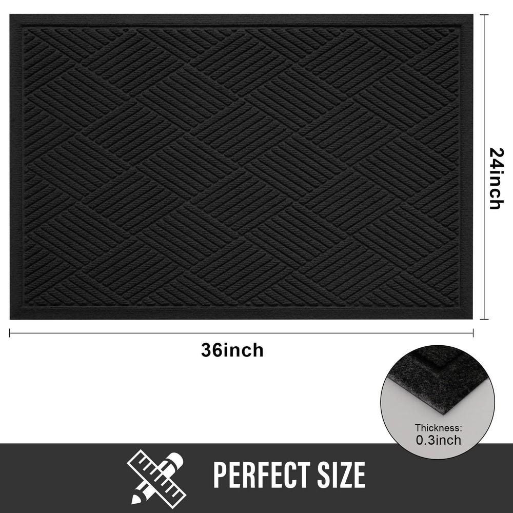 Sturdy Front Door Mat, Absorbent Muddy Dirt Resist Welcome Door Mats Outdoor Indoor, Stain and Fade Resistant, Non-Slip Rubber Backing Low Profile Doormat for Entryway, 36×24, Black Product Details Color: Black Size: 36" x 24" Brand: HIYARD UPC: 790807815531 EAN: 0790807815531 MPN: Does not apply Brand: HIYARD Size: 36" x 24" Material: Rubber Weave Type: Machine Made Item Weight: 4.2 Pounds Brand: HIYARD Size: 36" x 24" Material: Rubber Weave Type: Machine Made Item Weight: 4.2 Pounds Pile Height: Low Pile Construction Type: Machine Made Back Material Type: Rubber Color: Black Indoor/Outdoor Usage: Outdoor, Indoor Theme: Welcome Is Stain Resistant: Yes Product Care Instructions: Vacuum, Sweep, Shake off, Rinse Pattern: Solid Shape: Rectangular Special Feature: Fade Resistant, Heat Resistant, Stain Resistant, Non Slip Room Type: Home Office, Hallway Product Dimensions: 36"L x 24"W Rug Form Type: Doormat Style: Modern Occasion: All Weather, All Season Min. Required Door Width: 24 Inches Number of Pieces: 1 Item Thickness: 0.3 Inches Water Resistance Level: Water Resistant Age Range (Description): Adult UPC: 790807815531 Item Weight: 4.2 pounds Manufacturer: HIYARD Date First Available: March 22, 2023 Capture Dirt and Moisture: Doormat super absorbent, HIYARD outdoor welcome mat holds up to 1.8 gallons of water per square yard. Deep groove design and rubber border helps capture water and prevents excess water from spilling onto the ground. Indoor door mat surface fibers scrape dust and debris from your shoes, boots, paws. Let the dirt stay out Non Slip Rubber Backing: Door mat outdoor entrance textured rubber backing with moisture-proof , wear-resistant, safe, non-slip to protect your floor. Quick dry outdoor indoor door mats for entryway, tile, marble, deck, hardwood, concrete. Please keep the floor dry before placing the entry rug to prevent falling Sturdy, Stain and Fade Resistant: Front door rug high density polyester surface, made of waterproof recycled fabric, super tough and heavy duty. Outdoor door mat features heat resistant, water resistant, weather resistant, color will not fade. Welcome mat indoor can be used in all weather and seasons Low Profile & Versatile: Our floor mat low-profile diamond design and 0.3 inches high can easily open the door, without jamming or curling. Door mat indoor entrance, front door, back door, shoe mats for entryway indoor, patio, laundry, porch, kitchen, garage, deck, pet entry. You can also cut it to your liking and place it high traffic areas Easy Clean: Front door mat indoor can be vacuumed or garden hose rinsed. Easy to sweep and shake off dirt, gravel, grass, sand, mud and snow from outdoor doormat. If you have any questions about welcome mat for front door, I will help you answer them as soon as possible. Give you a satisfactory solution